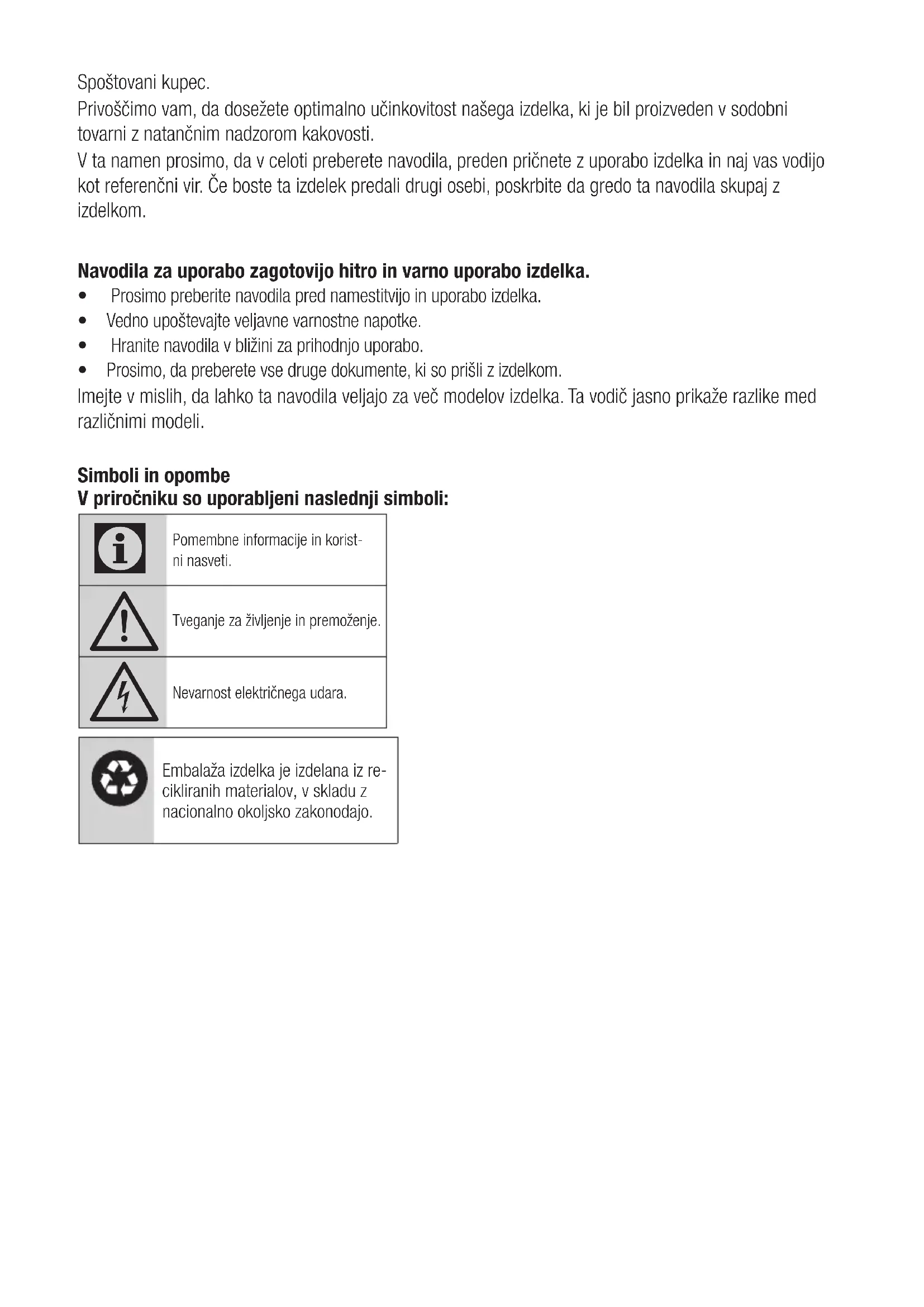 HOIATUS: Kui probleem jääb püsima ka peale selles peatükis toodud juhiste lugemist, võtke ühendust oma edasimüüja või volitatud teenindusega. Ärge püüdke toodet parandada.Spoštovani kupec. Privoščimo vam, da dosežete optimalno učinkovitost našega izdelka, ki je bil proizveden v sodobni tovarni z natančnim nadzorom kakovosti. V ta namen prosimo, da v celoti preberete navodila, preden pričnete z uporabo izdelka in naj vas vodijo kot referenčni vir. Če boste ta izdelek predali drugi osebi, poskrbite da gredo ta navodila skupaj z izdelkom. Navodila za uporabo zagotovijo hitro in varno uporabo izdelka. t Prosimo preberite navodila pred namestitvijo in uporabo izdelka. t Vedno upoštevajte veljavne varnostne napotke. t Hranite navodila v bližini za prihodnjo uporabo. t Prosimo, da preberete vse druge dokumente, ki so prišli z izdelkom. Imejte v mislih, da lahko ta navodila veljajo za več modelov izdelka. Ta vodič jasno prikaže razlike med različnimi modeli. Simboli in opombe V priročniku so uporabljeni naslednji simboli: