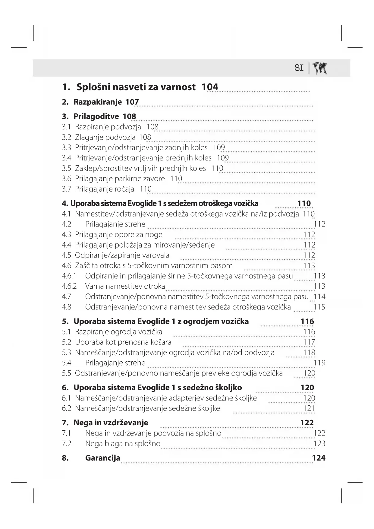 OPOZORILO Otroka nikoli ne puščajte nenadzorovanega. OPOZORILO Pred uporabo preverite, ali so vsi zaklepni me- hanizmi aktivirani. OPOZORILO V izogib poškodbam poskrbite, da otrok med razpiranjem in zlaganjem izdelka ni v bližini. OPOZORILO Pazite tudi, da v premične dele ne ujamete okončin. OPOZORILO Otroku ne dovolite, da bi se igral z izdelkom. OPOZORILO Sedež otroškega vozička ni primeren za otroke, mlajše od 6 mesecev. OPOZORILO Vedno uporabljajte zadrževalni sistem. 105SI