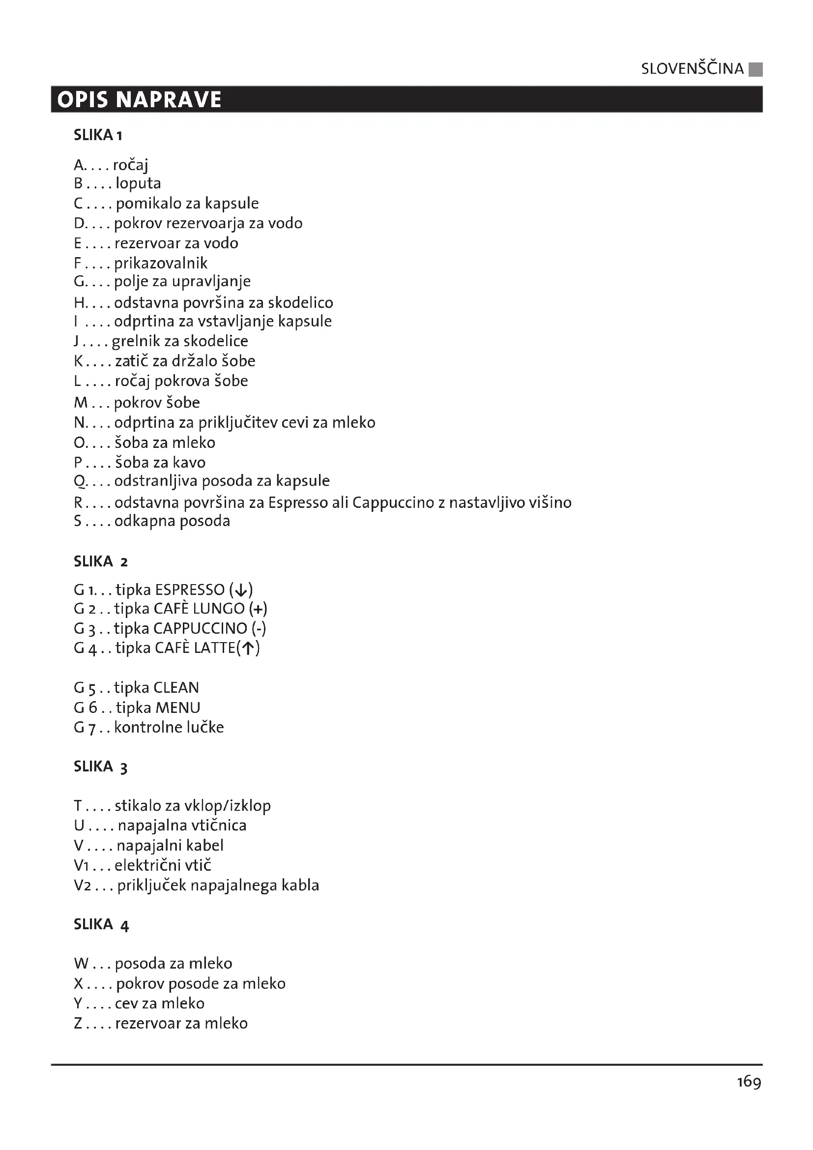 Čiščenje aparata opravite po naslednjem postopku: Izklopite aparat, tako da pritisnete stikalo za vklop/izklop (T): Rdeča kontrolna lučka ugasne. Izvlecite električni vtič (V1) iz vtičnice. Očistite zunanjost kav- nega aparata z mokro krpo in pustite, da se posuši. Rezervoar za vodo (E), ... ... posodo za kapsule (Q), ... ...posodo za mleko (W),
