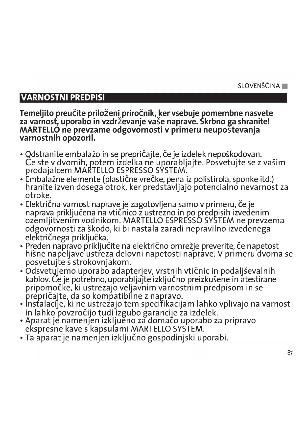 - V primeru okvare in/ali nepravilnega delovanja napravo izključite iz električnega omrežja in je ne odpirajte. Če je potrebno popravilo, poiščite pomoč pri zastopniku MARTELLO ESPRESSO SYSTEM. VARNOSTNI PREDPISI g SLOVENŠČINA