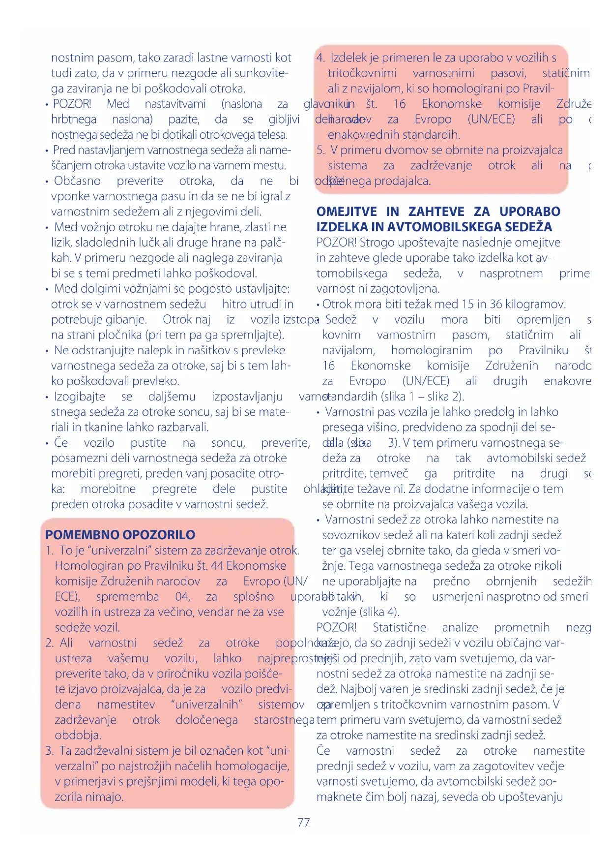 - Če vozilo pustite na soncu, preverite, ali so posameznidelivarnostnegasedežazaotroke morebitipregreti,predenvanjposaditeotro- ka: morebitne pregrete dele pustite ohladiti, predenotrokaposaditevvarnostnisedež. POMEMBNO OPOZORILO 1.Toje“univerzalni”sistemzazadrževanjeotrok. HomologiranpoPravilnikušt.44Ekonomske komisijeZdruženihnarodovza Evropo(UN/ ECE), sprememba 04, za splošnouporabo v vozilihinustrezazavečino,vendarnezavse sedeževozil. 2.Ali varnostni sedež za otroke popolnoma ustreza vašemu vozilu, lahkonajpreprosteje preveritetako,davpriročnikuvozilapoišče- teizjavoproizvajalca,dajezavozilopredvi- dena namestitev “univerzalnih” sistemov za zadrževanje otrok določenega starostnega obdobja. 3.Tazadrževalnisistemjebiloznačenkot“uni- verzalni”ponajstrožjihnačelihhomologacije, vprimerjavisprejšnjimimodeli,kitegaopo- zorilanimajo.76 poškodb,čedonezgodevendarlepride.