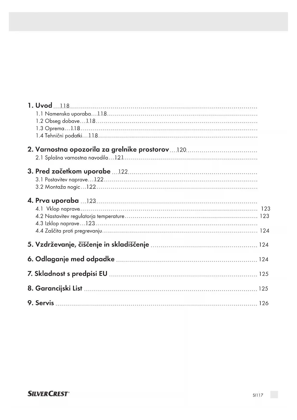 Preberite vsa varnostna navodila in napotke. Malomarnost pri upoštevanju varnostnih navodil in napotkov lahko povzroči hude telesne poškodbe in/ali materialno škodo. Vsa varnostna navodila in napotke shranite za v prihodnje! OPOZORILO! Nevarnost pregrevanja! Da bi se preprečilo pregrevanje grelnika, se ga ne sme pokri- vati. Grelnika se ne sme postaviti neposredno pod stensko vtičnico. Grelnika ne uporabljajte v neposredni bližini kopalne kadi, tuša ali bazena. Če se napajalni priključni kabel poškoduje, ga mora zamenjati pro- izvajalec, njegova storitev za pomoč strankam ali podobno usposo- bljena oseba, da se prepreči tveganja. PREVIDNO: Da bi se izognili nevarnosti zaradi nenamerne ponasta- vitve zaščitnega omejevalnika temperature, se naprava ne sme napa- jati preko zunanje stikalne naprave, kot je časovnik, ali biti priključena na v ezje, ki ga druga naprava redno vklaplja in izklaplja. Uporabniku za nastavljanje izdelka na 220 ali 240 V ni treba storiti ničesar. Izdelek se samodejno nastavi na ustrezno napetost. Če naprava pade na tla, je ne uporabljajte. Izdelka ne uporabljajte, če opazite vidne poškodbe. Grelnik mora biti nameščen na trdna, ravna in vodoravna tla.SI 121