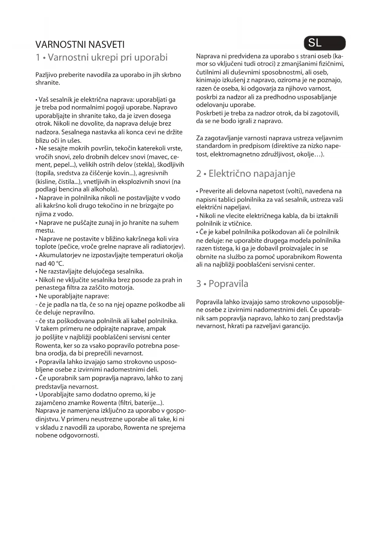 - Vhod v posodo za prah je zamašen: odstranite posodo za prah in jo izpraznite. Očistite odprtino posode za prah. Če je težko premikati sesalni nastavek Znižajte sesalno moč s pomočjo stikala. Če težava ni odpravljena, zaupajte sesalnik najbližjemu pooblaščenemu servisnemu centru Rowenta. Oglejte si seznam pooblaščenih servisnih centrov Rowenta ali se obrnite na službo za pomoč uporabnikom Rowenta. Naprava je namenjena izključno za uporabo v gospo- dinjstvu. V primeru neustrezne uporabe ali take, ki ni v skladu z navodili za uporabo, blagovna znamka ne spre- jema nobene odgovornosti in garancija je razveljavljena. Pred prvo uporabo naprave pazljivo preberite navo- dila za uporabo: v primeru uporabe, ki ni v skladu z navodili, je Rowenta oproščena vsake odgovornosti. OKOLJE ODPRAVA NAPAK GARANCIJA v notranjih prostorih. Ne potapljajte jih v vodo. Z akumulatorji ravnajte previdno. Akumulatorjev ne dajte v usta. Preprečite stik akumulatorjev z drugimi kovinskimi predmeti (prstani, žeblji, vijaki..). Pazite, da ne povzročite kratkega stika v akumulatorjih z vs- tavljanjem kovinskih delov na končne točke. Če pride do kratkega stika, lahko nevarno naraste temperatu- ra akumulatorjev, kar lahko povzroči težke opekline ali celo ogenj. Če pride do puščanja akumulatorjev, si ne drgnite oči in sluznic. Umijte si roke in izplaknite oči s čisto vodo. Če še vedno občutite nelagodje, pojdite k zdravniku.108