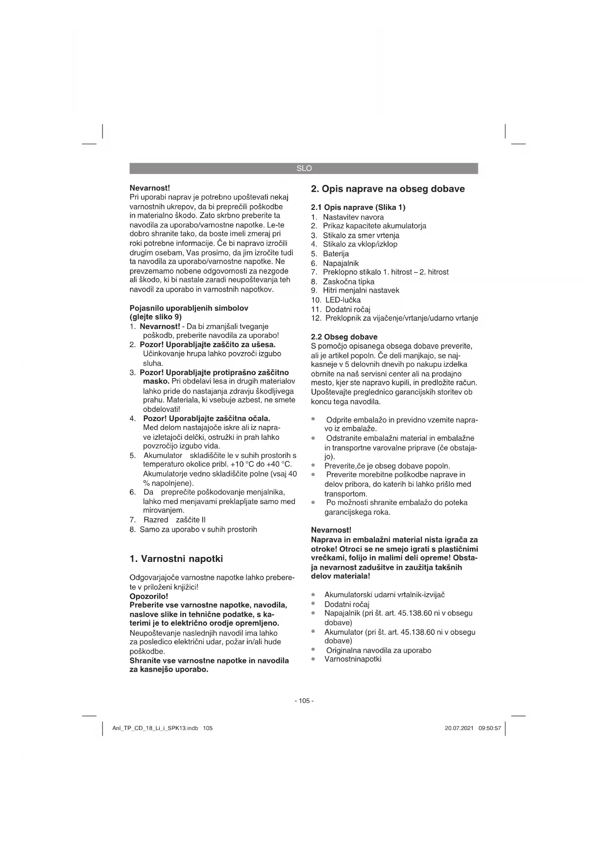 S stikalom za vklop/izklop lahko stopenjsko nas- tavite število vrtljajev. Bolj ko stiskate na stikalo, višje je število vrtljajev baterijskega izvijača. Anl_TP_CD_18_Li_i_SPK13.indb 107Anl_TP_CD_18_Li_i_SPK13.indb 107 20.07.2021 09:50:5720.07.2021 09:50:57SLO