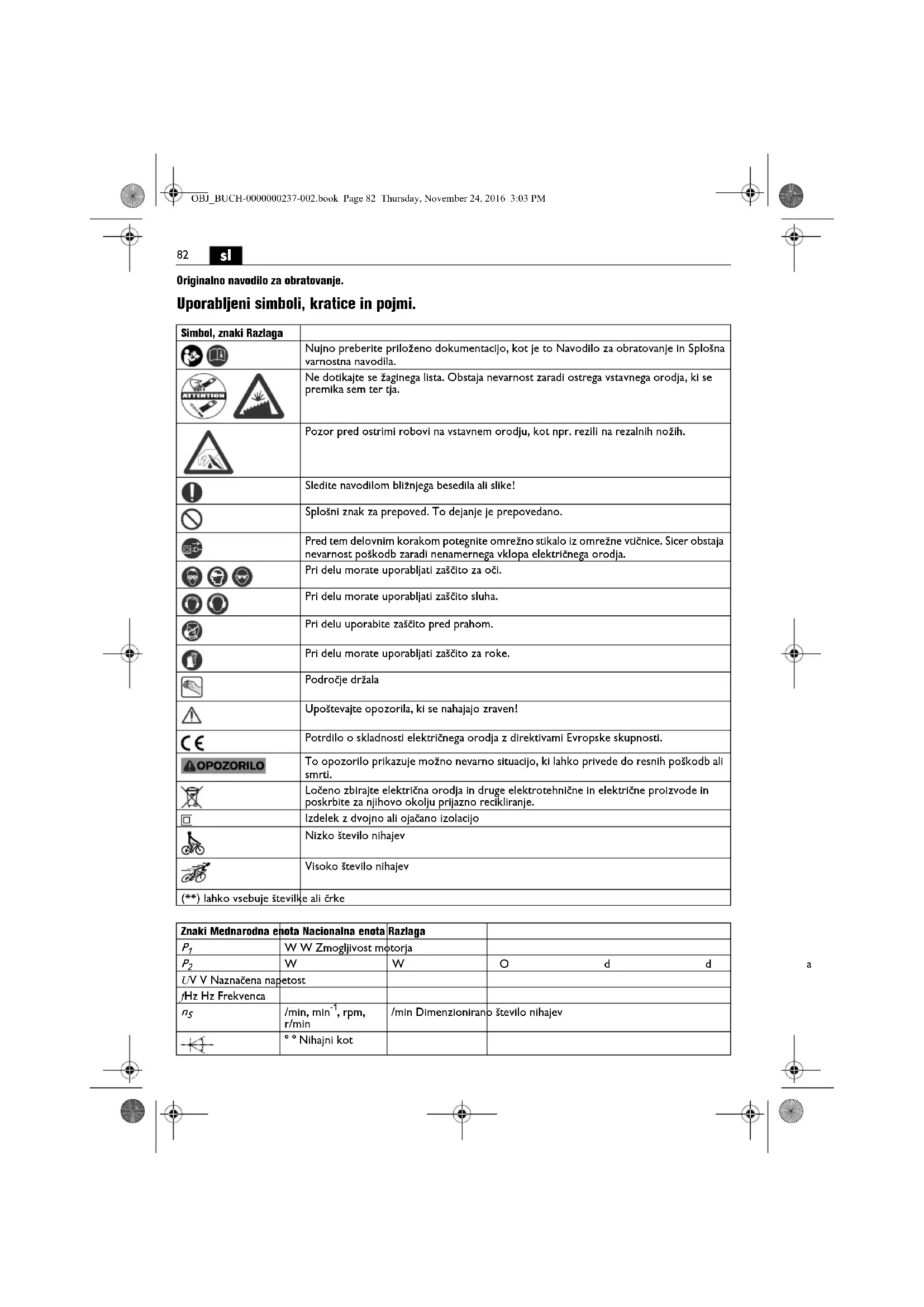 | Nujno preberite priloženo Dokumentacio, kot je to Navodilo za obratovanje in Splošna varnostna navodila. | |