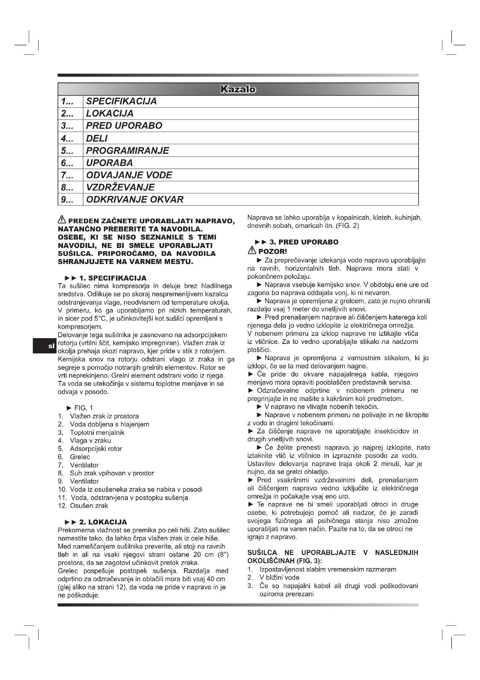 ► 2. LOKACIJA Prekomerna vlažnost se premika po celi hiši. Zato sušilec namestite tako, da lahko črpa vlažen zrak iz cele hiše. Med nameščanjem sušilnika preverite, ali stoji na ravnih tleh in ali na vsaki njegovi strani ostane 20 cm (8'') prostora, da se zagotovi učinkovit pretok zraka. Grelec pospešuje postopek sušenja. Razdalja med odprtino za odzračevanje in oblačili mora biti vsaj 40 cm (glej sliko na strani 12), da voda ne pride v napravo in je ne poškoduje. Naprava se lahko uporablja v kopalnicah, kleteh, kuhinjah, dnevnih sobah, omaricah itn. (FIG. 2) ► 3. PRED UPORABO POZOR! ► Za preprečevanje iztekanja vode napravo uporabljajte na ravnih, horizontalnih tleh. Naprava mora stati v pokončnem položaju. ► Naprava vsebuje kemijsko snov. V obdobju ene ure od zagona bo naprava oddajala vonj, ki ni nevaren. ► Naprava je opremljena z grelcem, zato je nujno ohraniti razdaljo vsaj 1 meter do vnetljivih snovi. ► Pred prenašanjem naprave ali čiščenjem katerega koli njenega dela jo vedno izklopite iz električnega omrežja. V nobenem primeru za izklop naprave ne iztikajte vtiča iz vtičnice. Za to vedno uporabljajte stikalo na nadzorni ploščici. ► Naprava je opremljena z varnostnim stikalom, ki jo izklopi, če se ta med delovanjem nagne. ► Če pride do okvare napajalnega kabla, njegovo menjavo mora opraviti pooblaščen predstavnik servisa. ► Odzračevalne odprtine v nobenem primeru ne pregrinjajte in ne mašite s kakršnim koli predmetom. ► V napravo ne vlivajte nobenih tekočin. ► Naprave v nobenem primeru ne polivajte in ne škropite z vodo in drugimi tekočinami. ► Za čiščenje naprave ne uporabljajte insekticidov in drugih vnetljivih snovi. ► Če želite prenesti napravo, jo najprej izklopite, nato iztaknite vtič iz vtičnice in izpraznite posodo za vodo. Ustavitev delovanja naprave traja okoli 2 minuti, kar je nujno, da se grelci ohladijo. ► Pred vsakršnimi vzdrževalnimi deli, prenašanjem ali čiščenjem napravo vedno izključite iz električnega omrežja in počakajte vsaj eno uro. ► Te naprave ne bi smeli uporabljati otroci in druge osebe, ki potrebujejo pomoč ali nadzor, če je zaradi svojega zičnega ali psihičnega stanja niso zmožne uporabljati na varen način. Pazite na to, da se otroci ne igrajo z napravo.