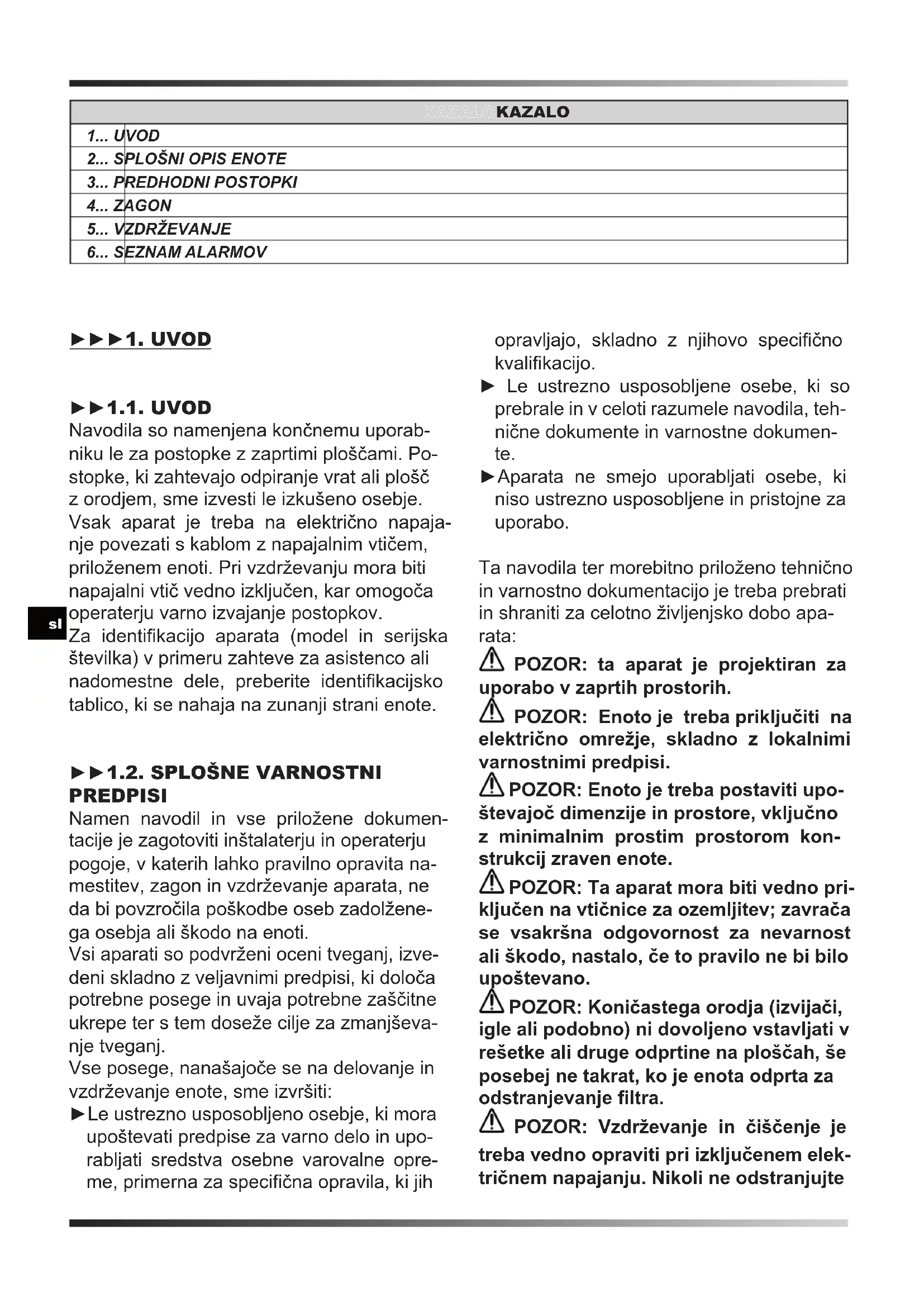 PREDPISI Namen navodil in vse priložene dokumen- tacije je zagotoviti inštalaterju in operaterju pogoje, v katerih lahko pravilno opravita na- mestitev, zagon in vzdrževanje aparata, ne da bi povzročila poškodbe oseb zadolžene- ga osebja ali škodo na enoti. Vsi aparati so podvrženi oceni tveganj, izve- deni skladno z veljavnimi predpisi, ki določa potrebne posege in uvaja potrebne zaščitne ukrepe ter s tem doseže cilje za zmanjševa- nje tveganj. Vse posege, nanašajoče se na delovanje in vzdrževanje enote, sme izvršiti: ►Le ustrezno usposobljeno osebje, ki mora upoštevati predpise za varno delo in upo- rabljati sredstva osebne varovalne opre- me, primerna za specična opravila, ki jih opravljajo, skladno z njihovo specično kvalikacijo. ► Le ustrezno usposobljene osebe, ki so prebrale in v celoti razumele navodila, teh- nične dokumente in varnostne dokumen- te. ►Aparata ne smejo uporabljati osebe, ki niso ustrezno usposobljene in pristojne za uporabo. Ta navodila ter morebitno priloženo tehnično in varnostno dokumentacijo je treba prebrati in shraniti za celotno življenjsko dobo apa- rata: POZOR: ta aparat je projektiran za uporabo v zaprtih prostorih. POZOR: Enoto je treba priključiti na električno omrežje, skladno z lokalnimi varnostnimi predpisi. POZOR: Enoto je treba postaviti upo- števajoč dimenzije in prostore, vključno z minimalnim prostim prostorom kon- strukcij zraven enote. POZOR: Ta aparat mora biti vedno pri- ključen na vtičnice za ozemljitev; zavrača se vsakršna odgovornost za nevarnost ali škodo, nastalo, če to pravilo ne bi bilo upoštevano. POZOR: Koničastega orodja (izvijači, igle ali podobno) ni dovoljeno vstavljati v rešetke ali druge odprtine na ploščah, še posebej ne takrat, ko je enota odprta za odstranjevanje ltra. POZOR: Vzdrževanje in čiščenje je treba vedno opraviti pri izključenem elek- tričnem napajanju. Nikoli ne odstranjujteen