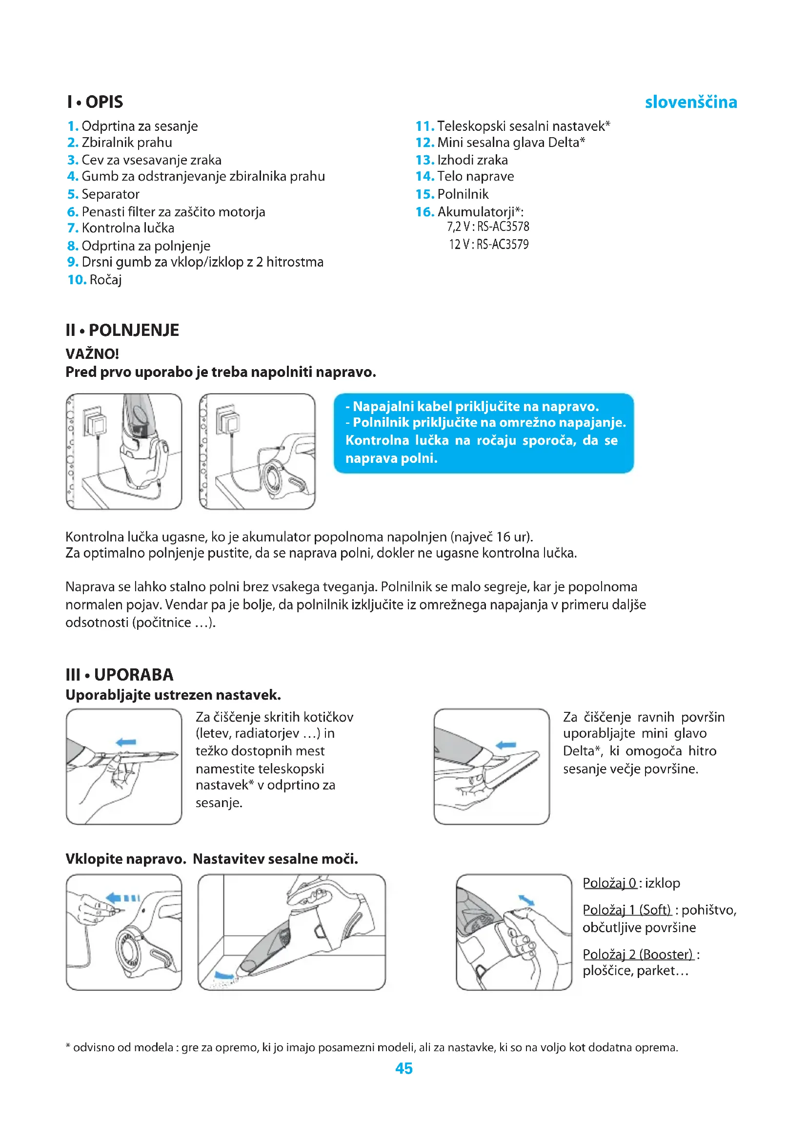 - odvisno od modela : gre za opremo, ki jo imajo posamezni modeli, ali za nastavke, ki so na voljo kot dodatna oprema. Za čiščenje ravnih površin uporabljajte mini glavo Delta*, ki omogoča hitro sesanje večje površine. - Napajalni kabel priključite na napravo. - Polnilnik priključite na omrežno napajanje. Kontrolna lučka na ročaju sporoča, da se naprava polni. I • OPIS