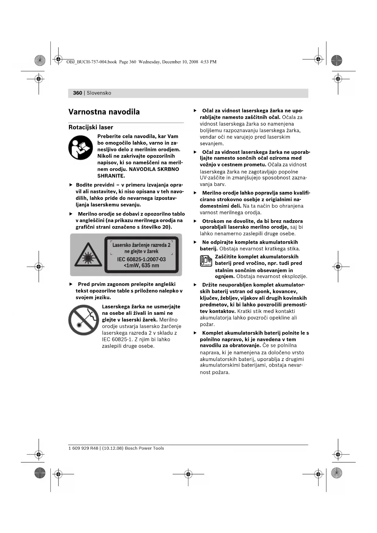 Varnostna navodila Rotacijski laser Preberite cela navodila, kar Vam bo omogočilo lahko, varno in za- nesljivo delo z merilnim orodjem. Nikoli ne zakrivajte opozorilnih napisov, ki so nameščeni na meril- nem orodju. NAVODILA SKRBNO SHRANITE. f Bodite previdni – v primeru izvajanja opra- vil ali nastavitev, ki niso opisana v teh navo- dilih, lahko pride do nevarnega izpostav- ljanja laserskemu sevanju. f Merilno orodje se dobavi z opozorilno tablo v angleščini (na prikazu merilnega orodja na grafični strani označeno s številko 20). f Pred prvim zagonom prelepite angleški tekst opozorilne table s priloženo nalepko v svojem jeziku. Laserskega žarka ne usmerjajte na osebe ali živali in sami ne glejte v laserski žarek. Merilno orodje ustvarja lasersko žarčenje laserskega razreda 2 v skladu z IEC 60825-1. Z njim bi lahko zaslepili druge osebe. f Očal za vidnost laserskega žarka ne upo- rabljajte namesto zaščitnih očal. Očala za vidnost laserskega žarka so namenjena boljšemu razpoznavanju laserskega žarka, vendar oči ne varujejo pred laserskim sevanjem. f Očal za vidnost laserskega žarka ne uporab- ljajte namesto sončnih očal oziroma med vožnjo v cestnem prometu. Očala za vidnost laserskega žarka ne zagotavljajo popolne UV-zaščite in zmanjšujejo sposobnost zazna- vanja barv. f Merilno orodje lahko popravlja samo kvalifi- cirano strokovno osebje z origialnimi na- domestnimi deli. Na ta način bo ohranjena varnost merilnega orodja. f Otrokom ne dovolite, da bi brez nadzora uporabljali lasersko merilno orodje, saj bi lahko nenamerno zaslepili druge osebe. f Ne odpirajte kompleta akumulatorskih baterij. Obstaja nevarnost kratkega stika. Zaščitite komplet akumulatorskih baterij pred vročino, npr. tudi pred stalnim sončnim obsevanjem in ognjem. Obstaja nevarnost eksplozije. f Držite neuporabljen komplet akumulator- skih baterij vstran od sponk, kovancev, ključev, žebljev, vijakov ali drugih kovinskih predmetov, ki bi lahko povzročili premosti- tev kontaktov. Kratki stik med kontakti akumulatorja lahko povzroči opekline ali požar. f Komplet akumulatorskih baterij polnite le s polnilno napravo, ki je navedena v tem navodilu za obratovanje. Če se polnilna naprava, ki je namenjena za določeno vrsto akumulatorskih baterij, uporablja z drugimi akumulatorskimi baterijami, obstaja nevar- nost požara.