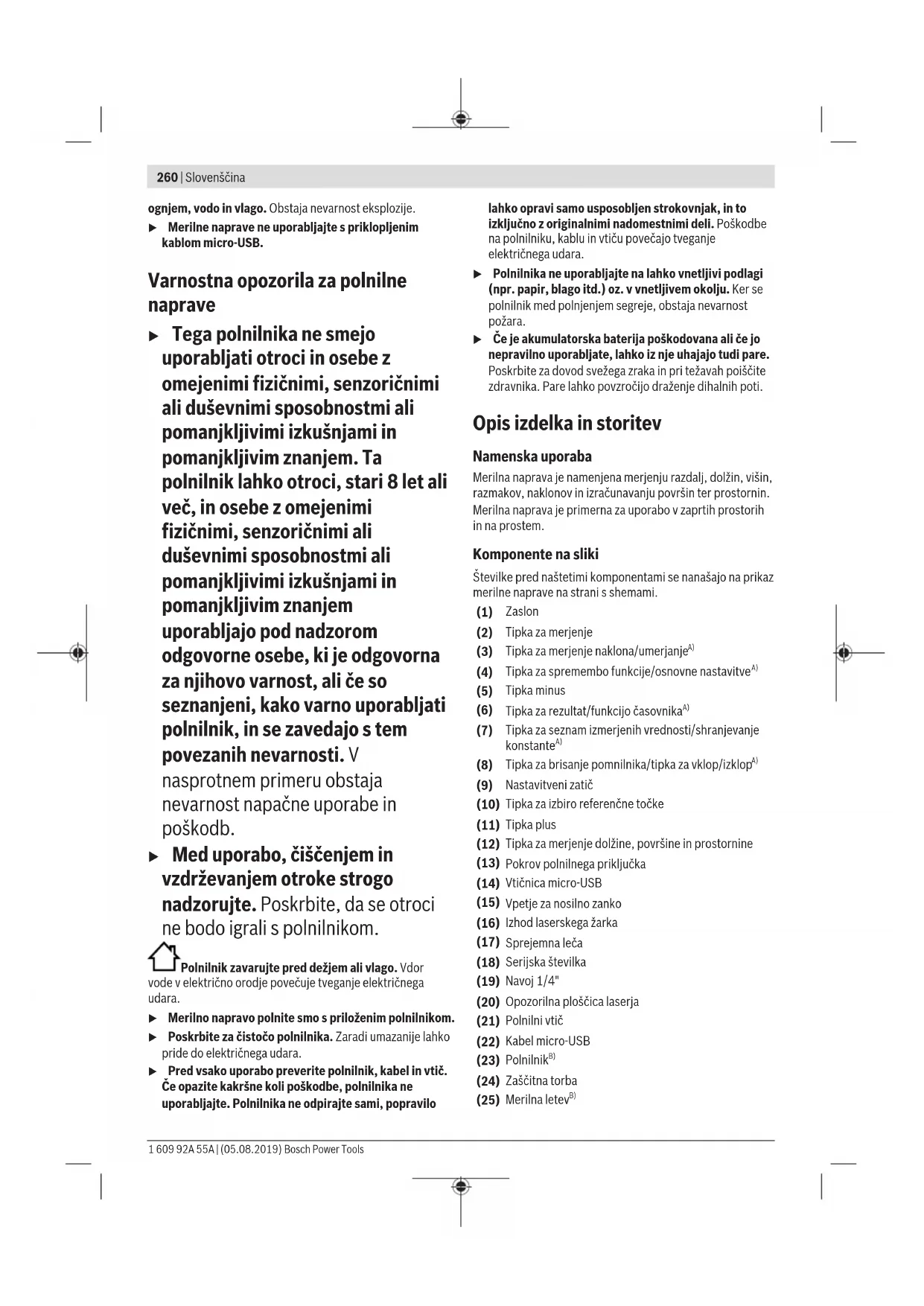 upoštevate, garancija preneha veljati. u Upoštevajte omrežno napetost! Napetost vira električne energije se mora ujemati s podatki na tipski ploščici polnilnika. Opomba: akumulatorska baterija je ob dobavi delno napolnjena. Da zagotovite polno moč akumulatorske baterije, jo pred prvo uporabo popolnoma napolnite. Litij-ionsko akumulatorsko baterijo lahko kadar koli napolnite, ne da bi s tem skrajšali njeno življenjsko dobo. Prekinitev polnjenja ne poškoduje akumulatorske baterije. Če utripa spodnji segment prikazovalnika napolnjenosti akumulatorske baterije (g), lahko izvedete le še nekaj meritev. Napolnite akumulatorsko baterijo. Če utripa okvir okoli segmentov prikaza stanja napolnjenosti akumulatorske baterije (g), merjenje ni več možno. Merilna 1 609 92A 55A | (05.08.2019) Bosch Power ToolsSlovenščina | 263 naprava je uporabna le še krajši čas (npr. za preverjanje vnosov na seznamu izmerjenih vrednosti.). Napolnite akumulatorsko baterijo. Merilno napravo s priloženim kablom mikro USB (22) povežite s polnilnikom (23). Polnilnik (23) priključite v vtičnico. Polnjenje se začne. Prikaz stanja napolnjenosti akumulatorske baterije (g) kaže napredek polnjenja. Pri postopku polnjenja segmenti zaporedoma zasvetijo. Ko so prikazani vsi segmenti prikazovalnika napolnjenosti akumulatorske baterije (g), je akumulatorska baterija popolnoma napolnjena. V primeru daljše neuporabe ločite polnilnik od električnega omrežja. Akumulatorsko baterijo je mogoče napolniti tudi prek vhoda USB. V ta namen merilno napravo s kablom mikro USB priključite na vhod USB. Pri priklopu prek USB-ja (polnjenje, prenos podatkov) lahko polnjenje traja precej dlje. Merilne naprave med postopkom polnjenja ne morete uporabiti. u Polnilnik zaščitite pred vlago! Nasveti za optimalno uporabo akumulatorske baterije v merilni napravi Merilno napravo skladiščite le v dovoljenem temperaturnem območju, (glejte „Tehnični podatki“, Stran261). Merilne naprave npr. poleti ne puščajte ležati v avtomobilu. Bistveno krajši čas delovanja po polnjenju pomeni, da je akumulatorska baterija obrabljena in da jo mora Boscheva servisna služba zamenjati. Upoštevajte navodila za odstranjevanje. Delovanje Uporaba u Merilno napravo zavarujte pred vlago in neposrednim sončnim sevanjem. u Merilne naprave ne izpostavljajte ekstremnim temperaturam ali temperaturnim nihanjem. Merilne naprave na primer ne puščajte dalj časa v avtomobilu. Počakajte, da se temperatura merilne naprave pri večjih temperaturnih nihanjih najprej prilagodi, šele nato napravo uporabite. Pri ekstremnih temperaturah ali temperaturnih nihanjih se lahko zmanjša natančnost delovanja merilne naprave. u Preprečite močne udarce v merilno napravo in padce na tla. Po močnih zunanjih vplivih na merilno napravo morate pred nadaljevanjem dela vedno izvesti preverjanje natančnosti (glejte „Preverjanje natančnosti in umerjanje merjenja naklona (glejte slikoH)“, Stran267) in (glejte „Preverjanje natančnosti merjenja razdalj“, Stran267) Vklop/izklop u Vklopljene merilne naprave nikoli ne puščajte brez nadzora. Po uporabi jo izklopite. Laserski žarek lahko zaslepi druge osebe. Za vklop merilne naprave imate naslednje možnosti: – Pritisk na tipko za vklop/izklop (8): merilna naprava se vklopi in je v načinu merjenja dolžine. Laser ni vključen. – Pritisk na tipko za merjenje (2): merilna naprava in laser se vklopita. Merilna naprava se vklopi v načinu merjenja dolžine. Pri merilni napravi, ki je vstavljena v merilno letev (25), je aktiviran način merjenja naklona. u Laserskega žarka ne usmerjajte v osebe ali živali in ne glejte vanj, tudi ne iz večje razdalje. Za izklop merilne naprave pritisnite za dalj časa na tipko za vklop/izklop (8). Če pribl. 5minut ni pritisnjena nobena tipka na merilni napravi, se ta za varčevanje z baterijo samodejno izključi. Če v načinu delovanja „merjenje naklona“ ca. 5min ne spremenite kota, se merilna naprava za varčevanje z baterijo samodejno izklopi. Pri avtomatskem izklopu se vse shranjene vrednosti shranijo. Merjenje Po vklopu je po pritisku na tipko za merjenje (2) merilna naprava vedno v načinu merjenja dolžine oz. merjenja naklona, kadar je merilna naprava nameščena na merilni letvi (25). Druge merilne funkcije lahko nastavite s pritiskom ustrezne tipke za določeno merilno funkcijo (glejte „Merilne funkcije“, Stran264). Referenčna točka za merjenje po vklopu je hrtbni rob merilne naprave. S pritiskom tipke za referenčno točko (10) lahko spremenite referenčno točko (glejte „Izbira referenčne točke (glejte slikoA)“, Stran263). Namestite merilno napravo z izbrano referenčno točko na želeno začetno točko merjenja (npr. steno). Za vklop laserskega žarka za kratek čas pritisnite tipko za merjenje (2). u Laserskega žarka ne usmerjajte v osebe ali živali in ne glejte vanj, tudi ne iz večje razdalje. Laserski žarek usmerite v ciljno površino. Za sprožitev merjenja ponovno za kratek čas pritisnite na tipko za merjenje (2). Pri vklopljenem neprekinjenem laserskem žarku se prične merjenje že po prvem pritisku na tipko za merjenje (2). V načinu neprekinjenega merjenja se merjenje prične takoj ob vklopu načina. Rezultati meritev se navadno prikažejo po 0,5s in najpozneje v 4s. Čas merjenja je odvisen od razdalje, osvetljenosti in odbojnosti ciljne površine. Zvočni signal je znak za konec merjenja. Laserski žarek se po končanem merjenju samodejno izklopi. Če se pribl. 20s po postavitvi cilja merjenje ne izvede, se laserski žarek zaradi varovanja akumulatorske baterije samodejno izklopi. Izbira referenčne točke (glejte slikoA) Pri merjenju lahko izbirate med štirimi različnimi referenčnimi točkami: Bosch Power Tools 1 609 92A 55A | (05.08.2019)264 | Slovenščina – zadnji rob merilne naprave oz. sprednji rob za 90° razklopljenega nastavitvenega zatiča (9) (npr. pri prislonitvi na zunanje vogale), – konica za 180° razkloplj