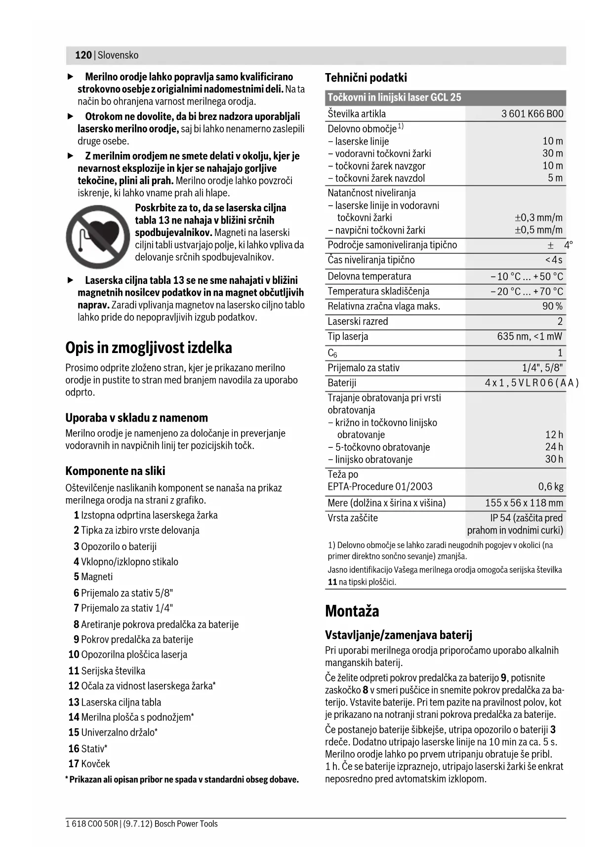 - Prikazan ali opisan pribor ne spada v standardni obseg dobave. Tehnični podatki Montaža Vstavljanje/zamenjava baterij Pri uporabi merilnega orodja priporočamo uporabo alkalnih manganskih baterij. Če želite odpreti pokrov predalčka za baterijo 9, potisnite zaskočko 8 v smeri puščice in snemite pokrov predalčka za ba- terijo. Vstavite baterije. Pri tem pazite na pravilnost polov, kot je prikazano na notranji strani pokrova predalčka za baterije. Če postanejo baterije šibkejše, utripa opozorilo o bateriji 3 rdeče. Dodatno utripajo laserske linije na 10 min za ca. 5 s. Merilno orodje lahko po prvem utripanju obratuje še pribl. 1 h. Če se baterije izpraznejo, utripajo laserski žarki še enkrat neposredno pred avtomatskim izklopom. Točkovni in linijski laser GCL 25 Številka artikla 3 601 K66 B00 Delovno območje