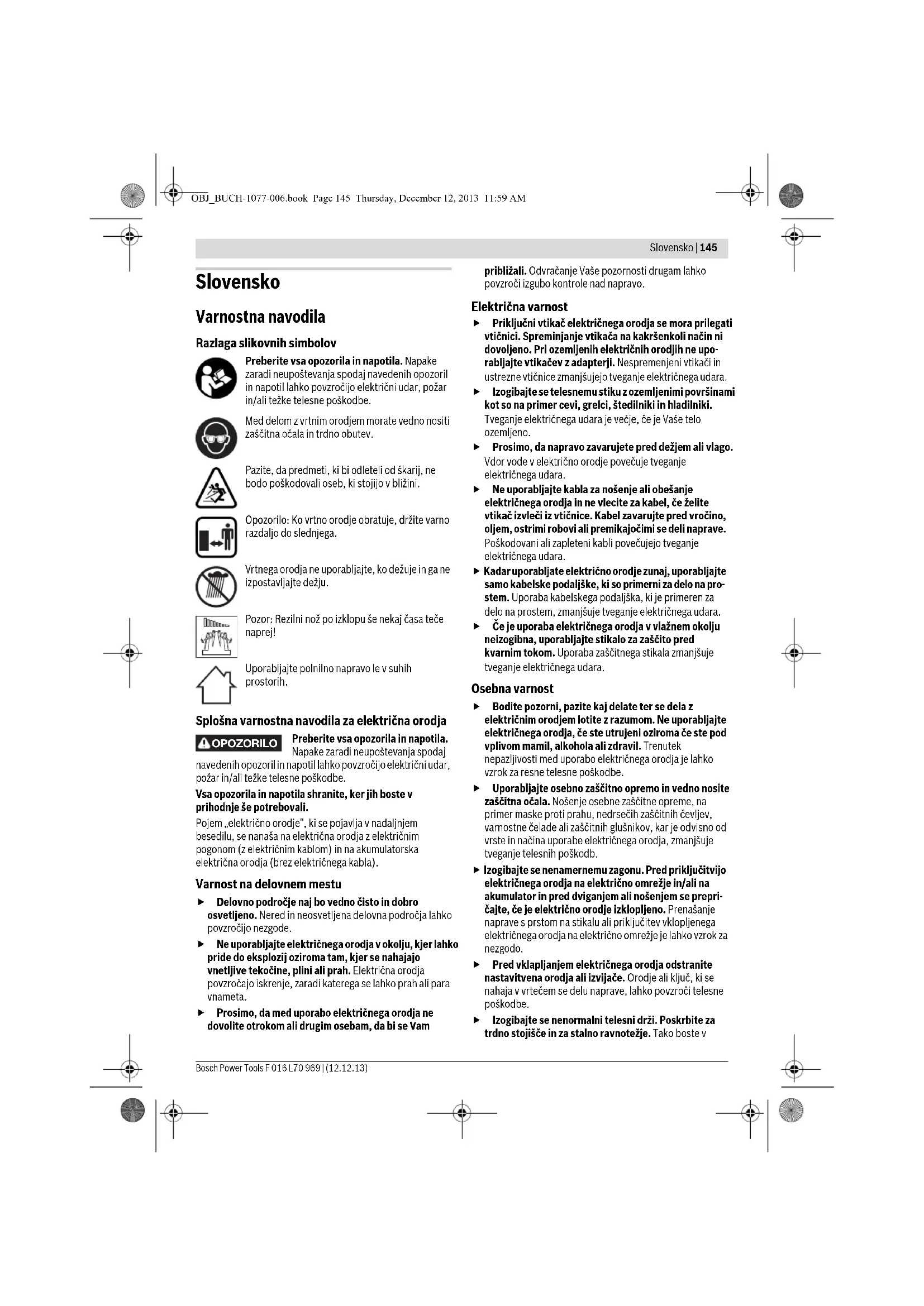 Montaža i Rad Mehanizam protiv blokianja Ako se nož za sečenje blokira materijalom koji je pružio otpor, onda se povećava opterećenje motora. Inteligentna mikro elektronika prepoznaje situaciju preopterećenja i ponavlja više puta šaltovanje motora, da bi spečila tako blokiranje noževa za sečenje i da bi odvojila materijal. Ovo čujno šaltovanje traje do 3 s. Posle odvajanja radi baštenski uredjaj dalje u normalnom stanju, ili nož za sečenje ostaje pri nastaloj situaciji preopterećenja automatski u otvorenom stanju (na. primer kada slučajno komad metalne ograde blokira baštenski uredjaj). Pokazivanje stanja punjenja akumulatora Pokazivač stanja punjenja akumulatora pokazuje napredovanje punjenja. Pri radnji punjenja treperi pokazivač zeleno. Ako pokazivač stanja punjenja akumulatora svetli trajno zeleno, akumulator je potpuno napunjen. Pokazivač stanja punjenja akumulatora pokazuje na pola ili potpuno pritisnutom prekidaču za uključivanje/isključivanje na nekoliko sekundi stanje punjenja akumulatora. Henk Becker Executive Vice President Engineering Helmut Heinzelmann Head of Product Certification PT/ETM9 Cilj rukovanja Slika Obim isporuke 1 Punjenje akumulatora 2 Demontaža 3 Montaža 4 Uključivanje/isključivanje 5 Montiranje teleskopske drške sa točkovima 6 Podesite dužinu za hvatanje 7 Položaj za sečenje ivica 8 Održavanje 9 Pribor 10 OBJ_BUCH-1077-006.book Page 143 Thursday, December 12, 2013 11:59 AM144 | Srpski F 016 L70 969 | (12.12.13) Bosch Power Tools Traženje grešaka Održavanje i čišćenje Pažnja: Isključite baštenski uredjaj pre radova održavanja i čišćenja. Pošto ste baštenski uredjaj isključili, pokreću se noževi dalje još nekoliko sekundi. Oprez! Ne dodirujte pokretne noževe. Održavajte baštenski uredjač čist, da bi mogli dobro i sigurno da radite. Nosite uvek zaštitne rukavice, kada radite sa baštenskim uredjajem ili bi želeli izvoditi radove održavanja/čišćenja. Kontrolišite baštenski uredjaj redovno na vidljive nedostatke, kao što su opuštena pričvršćivanja i ishabani ili oštećeni delovi konstrukcije. Servisna služba i savetovanje o upotrebi www.bosch-garden.com Molimo navedite neizostavno kod svih pitanja i naručivanja rezervnih delova broj predmeta sa 10 brojčanih mesta prema tipskoj tablici električnog alata. Srpski Bosch-Service Dimitrija Tucovića 59 11000 Beograd Tel.: (011) 6448546 Fax: (011) 2416293 E-Mail: asboschz@EUnet.yu Transport Akumulatori koji sadrže litijum jon podležu zahtevima prava o opasnim materijama. Akumulatore može korisnik transportovati na putu bez drugih pakovanja. Kod slanja preko trećih lica (na primer vazdušnih transportom ili špedicijom) mora se obratiti pažnja na posebne zahteve u pogledu pakovanja i označavanja. Ovde se mora pozvati kod pripreme komada za slanje ekspert za opasne materije. Šaljite akumuatore samo ako kućište nije oštećeno. Odlepite otvorene kontakte i upakujte akumulator tako, da se ne pokreće u paketu. Molimo da obratite pažnju na eventualne dalje nationalne propise. Uklanjanje djubreta Baštenski uredjaji, pribor i pakovanja treba da se odvoze nekojh regeneraciji koja odgovara zaštiti čovekove okoline. Ne bacajte baštenske uredjaje, uredjaje za punjenje i akumulatore/baterije u kućno djubre! Samo za EU-zemlje: Prema evropskoj smernici 2012/19/EU ne moraju više neupotrebljivi električni i elektronski uredjaji a prema evropskoj smernici 2006/66/EG ne moraju ni akumulatori/baterije koje su u kvaru ili istrošeni da se odvojeno sakupljaju i odvoze reciklaži koja odgovara zaštiti čovekove okoline. Integrisani akumulatori smeju da se uklanjaju kao djubre. Otvaranjem obloge kućiša može se razoriti baštenski uredjaj. Da bi akumulator izvadili iz baštenskog uredjaja, aktivirajte prekidač za uključivanje/isključivanje toliko dugo, sve dok je akumulator potpuno ne isprazni. Odvrnite zavrtnje na kućištu i skinite oblogu kućišta. Razdvojte priključke na akumulatoru i izvadite napolje akumulator. Akku/baterije: Li-Ion: Molimo da obratite pažnju na uputstva u odeljku „Transport“. Zadržavamo pravo na promene. LED Kapacitet Trajno svetlo zeleno 35 – 100% Trepćć svetlo zeleno 15 – 35% Trepćje svetlo crveno 5 – 15% Trajno svetlo crveno 0 – 5% LED Kapacitet Simptomi Mogući uzroci Pomoć Suviše kratko trajanje košenja po jednom punjenju aku-baterije Akumulator se približava kraju svoga veka trajanja Potražiti ovlašćeni servis Pokazivač punjenja akumulatora svetli stalno Nije moguće punjenje Akumulator je u kvaru Potražiti ovlašćeni servis OBJ_BUCH-1077-006.book Page 144 Thursday, December 12, 2013 11:59 AMSlovensko | 145 Bosch Power Tools F 016 L70 969 | (12.12.13) Slovensko Varnostna navodila Razlaga slikovnih simbolov Preberite vsa opozorila in napotila. Napake zaradi neupoštevanja spodaj navedenih opozoril in napotil lahko povzročijo električni udar, požar in/ali težke telesne poškodbe. Med delom z vrtnim orodjem morate vedno nositi zaščitna očala in trdno obutev. Pazite, da predmeti, ki bi odleteli od škarij, ne bodo poškodovali oseb, ki stojijo v bližini. Opozorilo: Ko vrtno orodje obratuje, držite varno razdaljo do slednjega. Vrtnega orodja ne uporabljajte, ko dežuje in ga ne izpostavljajte dežju. Pozor: Rezilni nož po izklopu še nekaj časa teče naprej! Uporabljajte polnilno napravo le v suhih prostorih. Splošna varnostna navodila za električna orodja Preberite vsa opozorila in napotila. Napake zaradi neupoštevanja spodaj navedenih opozoril in napotil lahko povzročijo električni udar, požar in/ali težke telesne poškodbe. Vsa opozorila in napotila shranite, ker jih boste v prihodnje še potrebovali. Pojem „električno orodje“, ki se pojavlja v nadaljnjem besedilu, se nanaša na električna orodja z električnim pogonom (z električnim kablom) in na akumulatorska električna orodja (brez električnega kabla). Varnost na delovnem mestu Delovno področje naj bo vedno 
