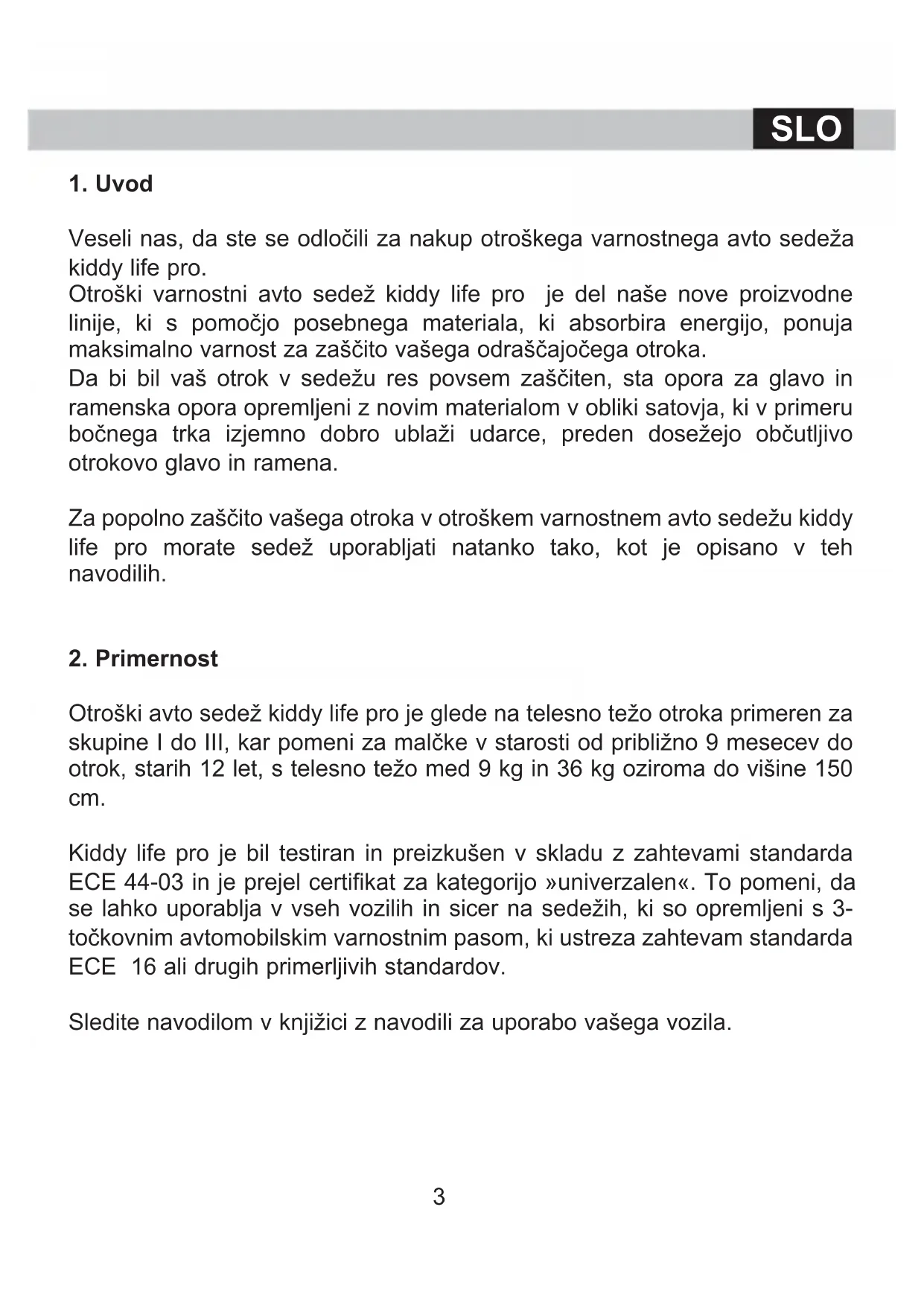Otroški avto sedež kiddy life pro je glede na telesno težo otroka primeren za skupine I do III, kar pomeni za malčke v starosti od približno 9 mesecev do otrok, starih 12 let, s telesno težo med 9 kg in 36 kg oziroma do višine 150 cm. Kiddy life pro je bil testiran in preizkušen v skladu z zahtevami standarda ECE 44-03 in je prejel certifikat za kategorijo »univerzalen«. To pomeni, da se lahko uporablja v vseh vozilih in sicer na sedežih, ki so opremljeni s 3- točkovnim avtomobilskim varnostnim pasom, ki ustreza zahtevam standarda ECE 16 ali drugih primerljivih standardov. Sledite navodilom v knjižici z navodili za uporabo vašega vozila. SLOSkica A Skica B Varnostna mizica je predvidena za otroke s telesno težo od 9 – 18 kg (cca 9 mesecev do cca 4 let). Z uporabo varnostne mizice je dopustna mejna obremenitev (po standardu ECE-44-03) zmanjšana do 80%.
