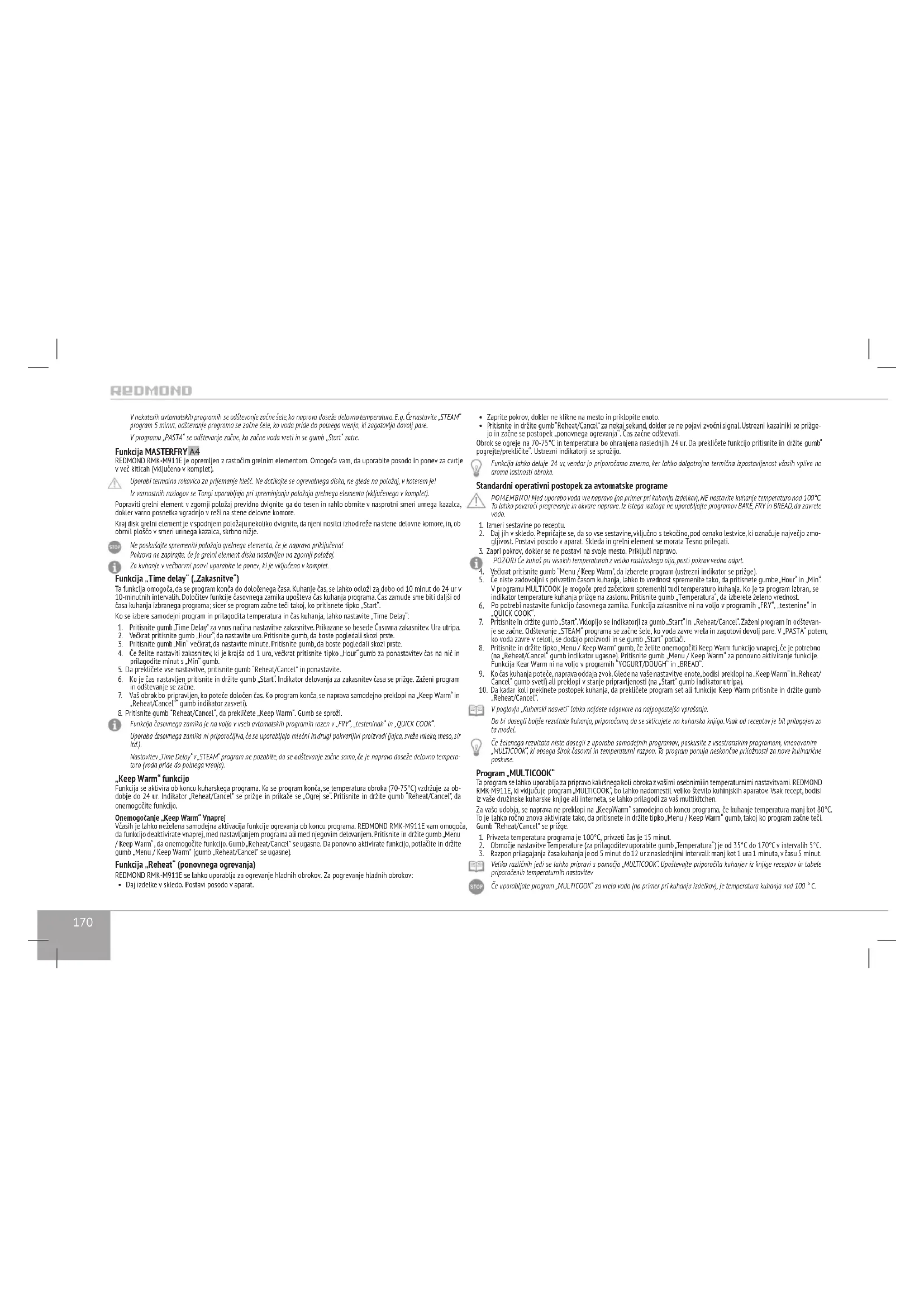 Spremembe ali prilagoditve izdelka niso dovoljene. Vsa popravila bi moral opraviti pooblaščeni servisni center. Če tega ne storite, lahko to povzroči škodo ali poškodbo naprave in premoženja. Pozor! Ne uporabljajte naprave v primeru napak.170 V nekaterih avtomatskih programih se odštevanje začne šele, ko naprava doseže delovno temperaturo. E. g. Če nastavite „STEAM“ program 5 minut, odštevanje programa se začne šele, ko voda pride do polnega vrenja, ki zagotavlja dovolj pare. V programu „PASTA“ se odštevanje začne, ko začne voda vreti in se gumb „Start“ zatre. Funkcija MASTERFRY A4 REDMOND RMK-M911E je opremljen z rastočim grelnim elementom. Omogoča vam, da uporabite posodo in ponev za cvrtje v več kiticah (vključeno v komplet). Uporabi termalno rokavico za prijemanje klešč. Ne dotikajte se ogrevalnega diska, ne glede na položaj, v katerem je! Iz varnostnih razlogov se Tongi uporabljajo pri spreminjanju položaja grelnega elementa (vključenega v komplet). Popraviti grelni element v zgornji položaj previdno dvignite ga do tesen in rahlo obrnite v nasprotni smeri urnega kazalca, dokler varno posnetka vgradnjo v reži na stene delovne komore. Kraj disk grelni element je v spodnjem položaju nekoliko dvignite, da njeni nosilci izhod reže na stene delovne komore, in, ob obrnil ploščo v smeri urinega kazalca, skrbno nižje. Ne poskušajte spremeniti položaja grelnega elementa, če je naprava priključena! Pokrova ne zapirajte, če je grelni element diska nastavljen na zgornji položaj. Za kuhanje v večbarvni ponvi uporabite le ponev, ki je vključena v komplet. Funkcija „Time delay“ („Zakasnitve“) Ta funkcija omogoča, da se program konča do določenega časa. Kuhanje čas, se lahko odloži za dobo od 10 minut do 24 ur v 10-minutnih intervalih. Določitev funkcije časovnega zamika upošteva čas kuhanja programa. Čas zamude sme biti daljši od časa kuhanja izbranega programa; sicer se program začne teči takoj, ko pritisnete tipko „Start“. Ko se izbere samodejni program in prilagodita temperatura in čas kuhanja, lahko nastavite „Time Delay“: 1. Pritisnite gumb „Time Delay” za vnos načina nastavitve zakasnitve. Prikazane so besede Časovna zakasnitev. Ura utripa.
