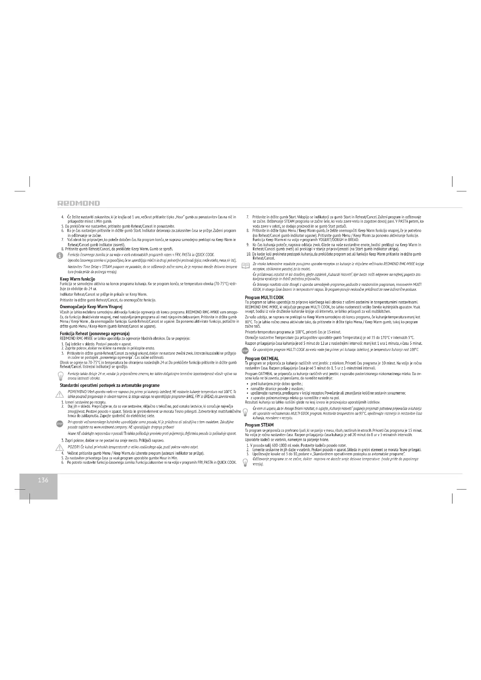 tavljena vprašanja in dobili potrebna priporočila. Če želenega rezultata niste dosegli z uporabo samodejnih programov, poskusite z vsestranskim programom, imenovanim MULTI COOK, ki obsega širok časovni in temperaturni razpon. Ta program ponuja neskončne priložnosti za nove kulinarične poskuse. Program MULTI COOK Ta program se lahko uporablja za pripravo kakršnega koli obroka z vašimi osebnimi in temperaturnimi nastavitvami. REDMOND RMC-M90E, ki vključuje program MULTI COOK, bo lahko nadomestil veliko število kuhinjskih aparatov. Vsak recept, bodisi iz vaše družinske kuharske knjige ali interneta, se lahko prilagodi za vaš multikitchen. Za vašo udobja, se naprava ne preklopi na Keep Warm samodejno ob koncu programa, če kuhanje temperatura manj kot 80°C. To je lahko ročno znova aktivirate tako, da pritisnete in držite tipko Menu / Keep Warm gumb, takoj ko program začne teči. Privzeta temperatura programa je 100°C, privzeti čas je 15 minut. Območje nastavitve Temperature (za prilagoditev uporabite gumb Temperatura) je od 35 do 170°C v intervalih 5°C. Razpon prilagajanja časa kuhanja je od 5 minut do 12 ur z naslednjimi intervali: manj kot 1 ura 1 minuta, v času 5minut. Če uporabljate program MULTI COOK za vrelo vodo (na primer pri kuhanju izdelkov), je temperatura kuhanja nad 100°C. Program OATMEAL Ta program se priporoča za kuhanje različnih vrst jerebic z mlekom. Privzeti čas programa je 10 minut. Na voljo je ročna nastavitev časa. Razpon prilagajanja časa je od 5 minut do 1, 5 ur z 1-minutnimi intervali. Program OATMEAL se priporoča za kuhanje različnih vrst jerebic z uporabo pasteriziranega nizkomastnega mleka. Da ov- sena kaša ne bi zavrela, priporočamo, da naredite naslednje: