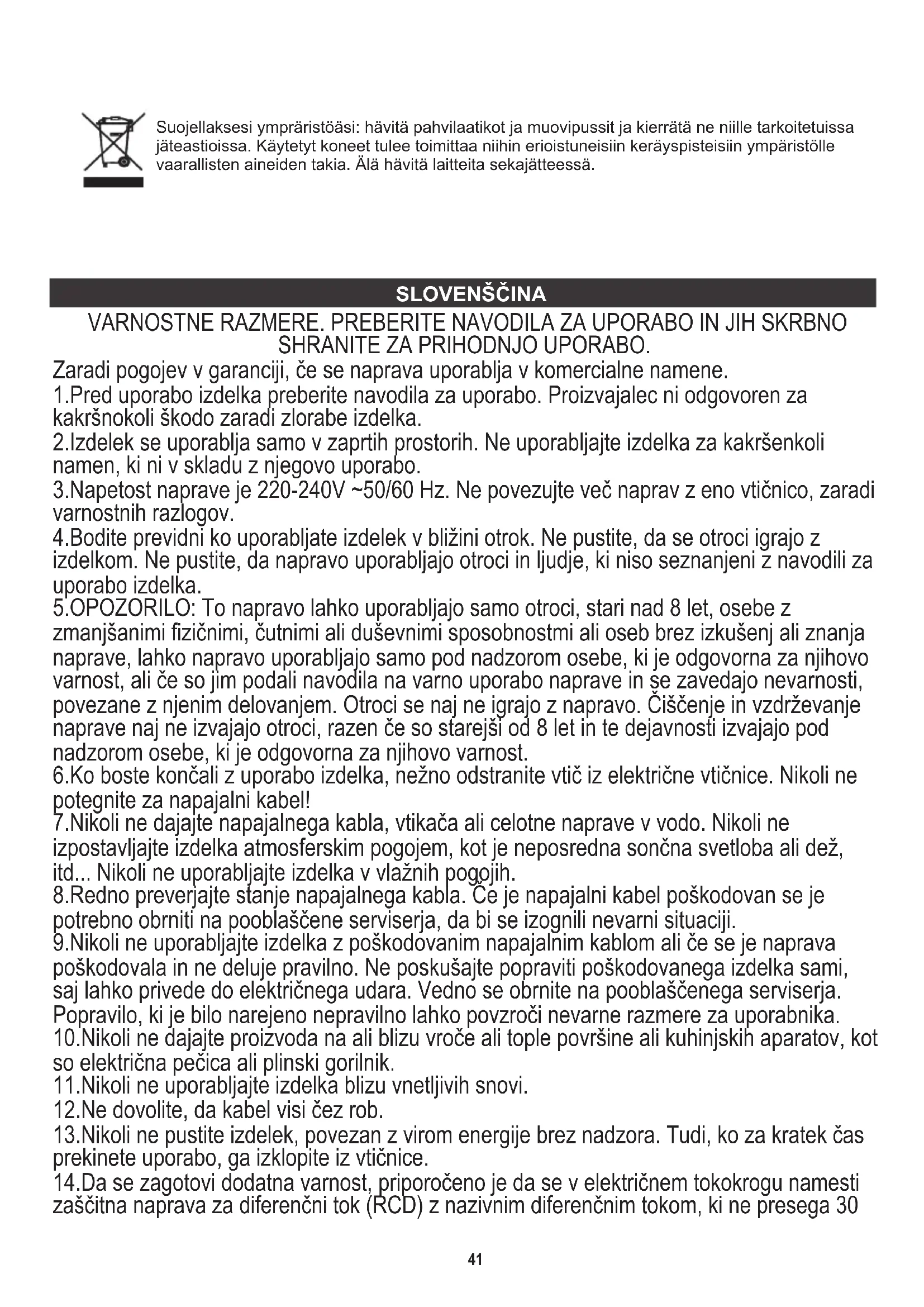 Priporočljivo je, da periodično uporabljate funkcijo samočistilnog stopala Self-Clean, ki preprečuje poravnavo kamena v železu. Če želite to narediti, izpolnite železo z vodo v celoti, železo postavite v navpični položaj, priključite na omrežje in nastavite termostat na "MAX”. Ko indikatorska lučka ugasne, aparat izklopite iz omrežja in ga držite vodoravno, npr. nad umivalnikom. Pritisnite gumb Self-Clean (J), držite približno minuto in stresajte železo. Ko se železo ohladi, obrišite nogo z vlažno krpo, da odstranite umazanijo. Opozorilo: Pri likanju občutljivih tkanin priporočamo, predhodno omočenje tkanine z uporabo pršila (D), ali z dajanjem kos mokrega materiala med železom in materiałom za likanje. Da bi se izognili umazaniji, ne uporabljajte škropljenja na svile ali sintetičnih tkaninah Funkcija Self-Clean Napajalna napetost: 220-240V ~50/60Hz Skrbimo za okolje. Kartonska embalaža, prosim darovati na odpadni papir. Polietilenske vreče (PE) mečite v posoda za plastiko. Dotrajane naprave je treba vrniti na ustrezno zbirno mesto, ker vsebovane v napravo nevarne elemente lahko predstavljajo nevarnost za okolje. Električna naprava je treba vrniti kakor, da se omeji njegovo ponovno uporabo in izkoriščenost. Če naprava vsebuje baterio, je treba odstraniti in ločeno dati nazaj na mesta skladiščenja. SLOVENŠČINA HRVATSKI VAŽNE SIGURNOSNE UPUTE ZA UPORABU PROČITAJTE PAŽLJIVO I DRŽITE ZA