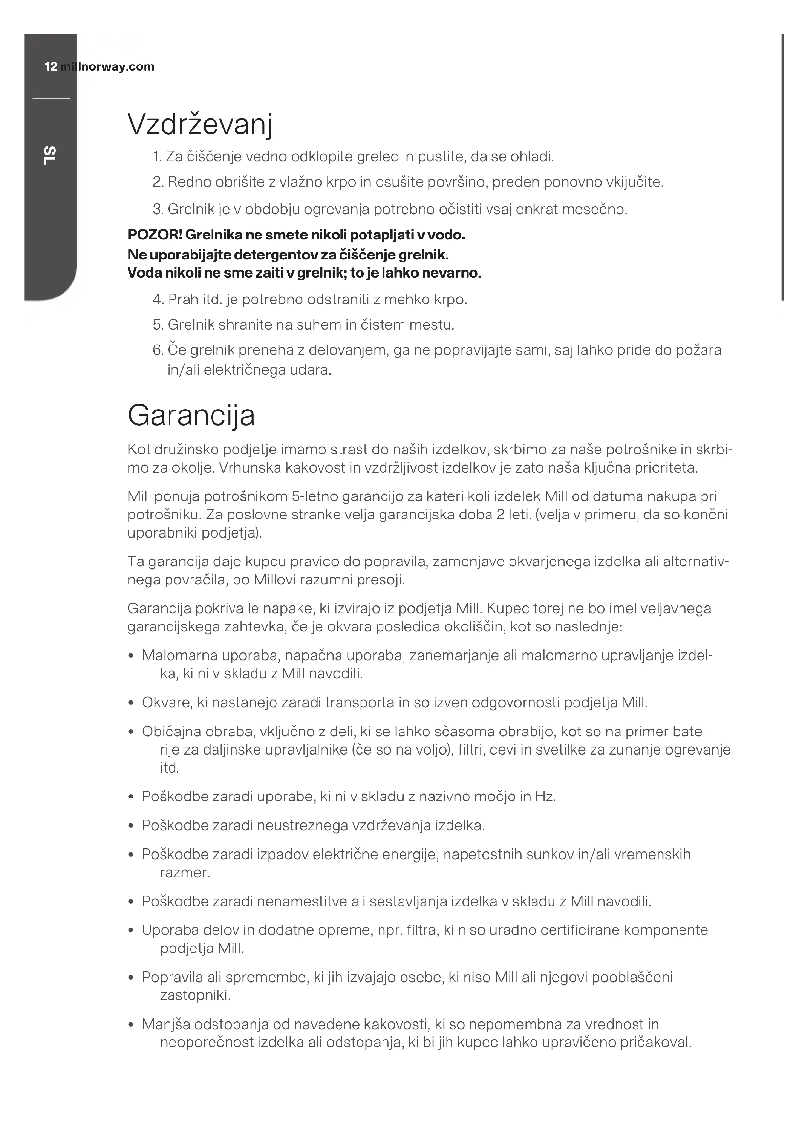 in/ali električnega udara. Garancija Kot družinsko podjetje imamo strast do naših izdelkov, skrbimo za naše potrošnike in skrbi- mo za okolje. Vrhunska kakovost in vzdržljivost izdelkov je zato naša ključna prioriteta. Mill ponuja potrošnikom 5-letno garancijo za kateri koli izdelek Mill od datuma nakupa pri potrošniku. Za poslovne stranke velja garancijska doba 2 leti. (velja v primeru, da so končni uporabniki podjetja). Ta garancija daje kupcu pravico do popravila, zamenjave okvarjenega izdelka ali alternativ- nega povračila, po Millovi razumni presoji. Garancija pokriva le napake, ki izvirajo iz podjetja Mill. Kupec torej ne bo imel veljavnega garancijskega zahtevka, če je okvara posledica okoliščin, kot so naslednje: