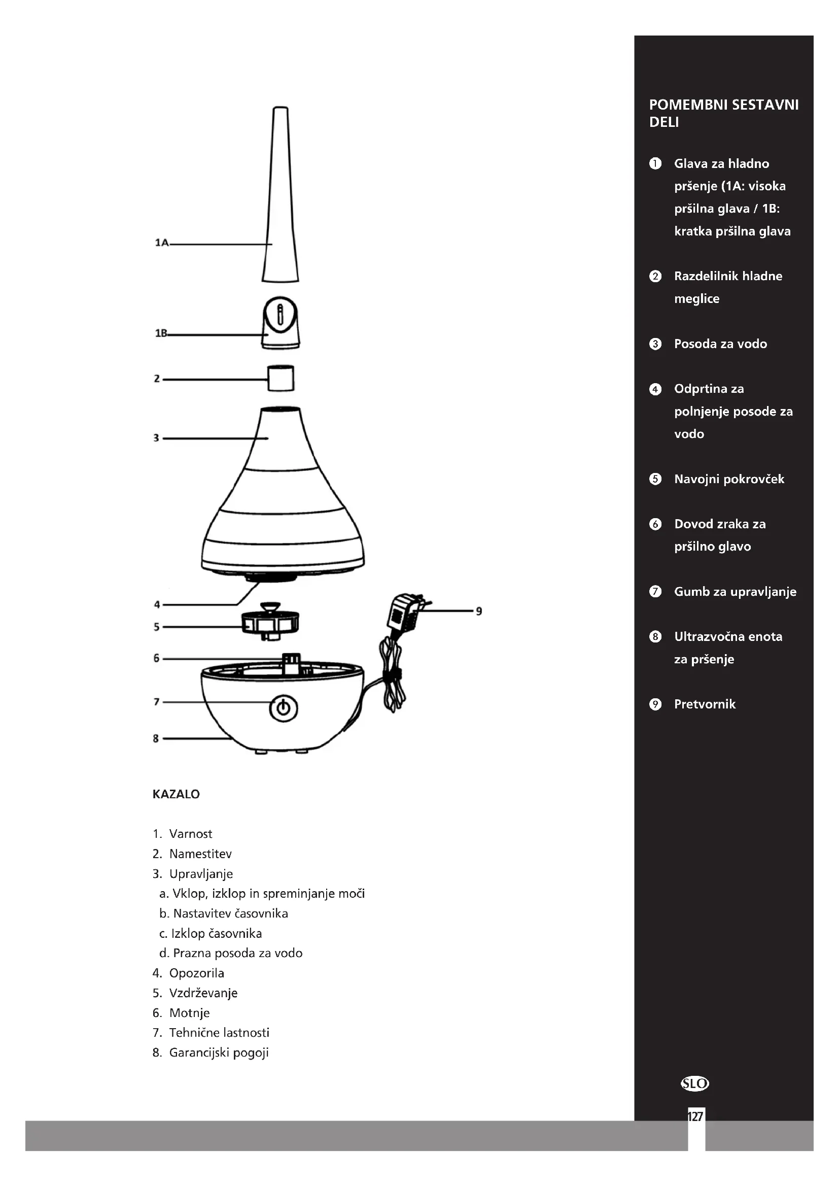 1 LEES EERST DE GEBRUIKSAANWIJZING. 2 RAADPLEEG BIJ TWIJFEL UW DEALER. POMEMBNI SESTAVNI DELI Glava za hladno pršenje (1A: visoka pršilna glava / 1B: kratka pršilna glava Razdelilnik hladne meglice Posoda za vodo Odprtina za polnjenje posode za vodo Navojni pokrovček Dovod zraka za pršilno glavo Gumb za upravljanje Ultrazvočna enota za pršenje Pretvornik