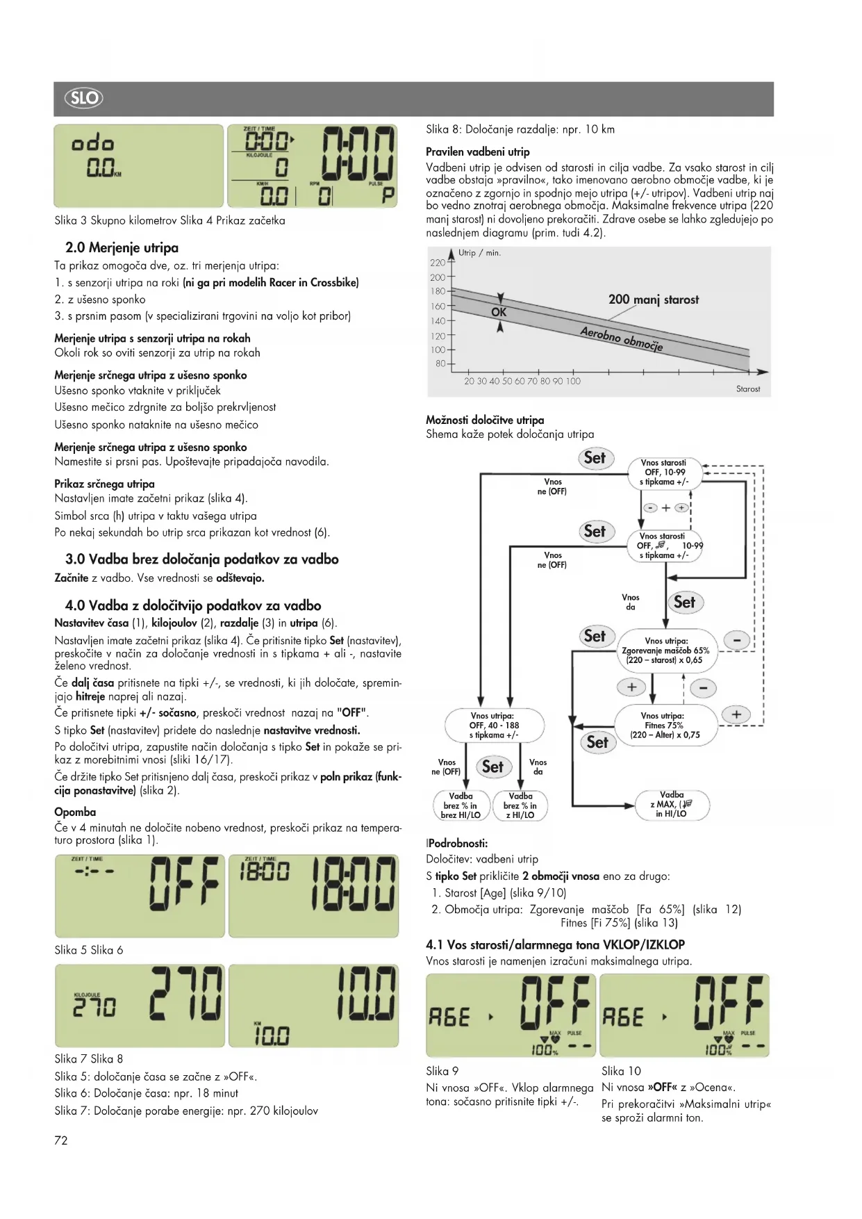 Nastavitev časa (1), kilojoulov (2), razdalje (3) in utripa (6). Nastavljen imate začetni prikaz (slika 4). Če pritisnite tipko Set (nastavitev), preskočite v način za določanje vrednosti in s tipkama + ali -, nastavite želeno vrednost. Če dalj časa pritisnete na tipki +/-, se vrednosti, ki jih določate, spremin- jajo hitreje naprej ali nazaj. Če pritisnete tipki +/- sočasno, preskoči vrednost nazaj na "OFF". S tipko Set (nastavitev) pridete do naslednje nastavitve vrednosti. Po določitvi utripa, zapustite način določanja s tipko Set in pokaže se pri- kaz z morebitnimi vnosi (sliki 16/17). Če držite tipko Set pritisnjeno dalj časa, preskoči prikaz v poln prikaz (funk- cija ponastavitve) (slika 2). Opomba Če v 4 minutah ne določite nobeno vrednost, preskoči prikaz na tempera- turo prostora (slika 1). Slika 5 Slika 6 Slika 7 Slika 8 Slika 5: določanje časa se začne z »OFF«. Slika 6: Določanje časa: npr. 18 minut Slika 7: Določanje porabe energije: npr. 270 kilojoulov Slika 8: Določanje razdalje: npr. 10 km Pravilen vadbeni utrip Vadbeni utrip je odvisen od starosti in cilja vadbe. Za vsako starost in cilj vadbe obstaja »pravilno«, tako imenovano aerobno območje vadbe, ki je označeno z zgornjo in spodnjo mejo utripa (+/- utripov). Vadbeni utrip naj bo vedno znotraj aerobnega območja. Maksimalne frekvence utripa (220 manj starost) ni dovoljeno prekoračiti. Zdrave osebe se lahko zgledujejo po naslednjem diagramu (prim. tudi 4.2). Možnosti določitve utripa Shema kaže potek določanja utripa IPodrobnosti: Določitev: vadbeni utrip S tipko Set prikličite 2 območji vnosa eno za drugo: