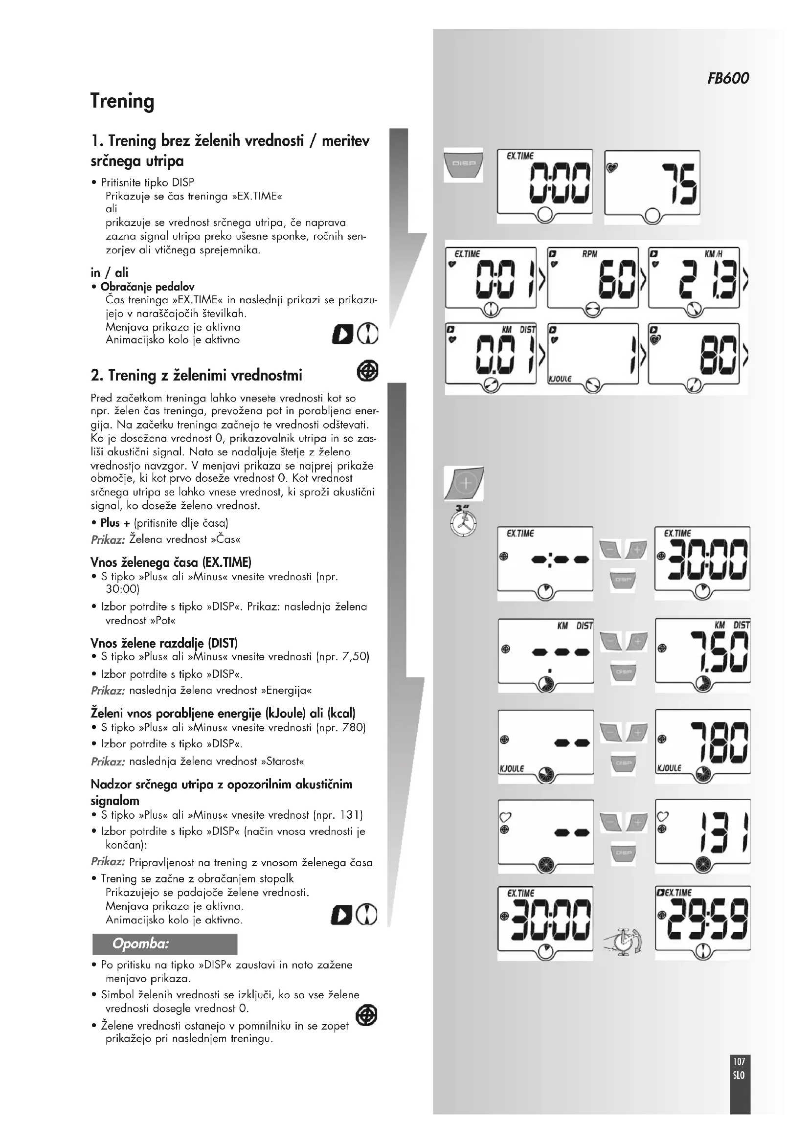- S tipko »Plus« ali »Minus« vnesite vrednost (npr. 131) • Izbor potrdite s tipko »DISP« (način vnosa vrednosti jekončan):Prikaz:Pripravljenost na trening z vnosom želenega časa • Trening se začne z obračanjem stopalk Prikazujejo se padajoče želene vrednosti. Menjava prikaza je aktivna.Animacijsko kolo je aktivno.• Po pritisku na tipko »DISP« zaustavi in nato zaženemenjavo prikaza. • Simbol želenih vrednosti se izključi, ko so vse želenevrednosti dosegle vrednost 0. • Želene vrednosti ostanejo v pomnilniku in se zopetprikažejo pri naslednjem treningu. Opomba: FB600