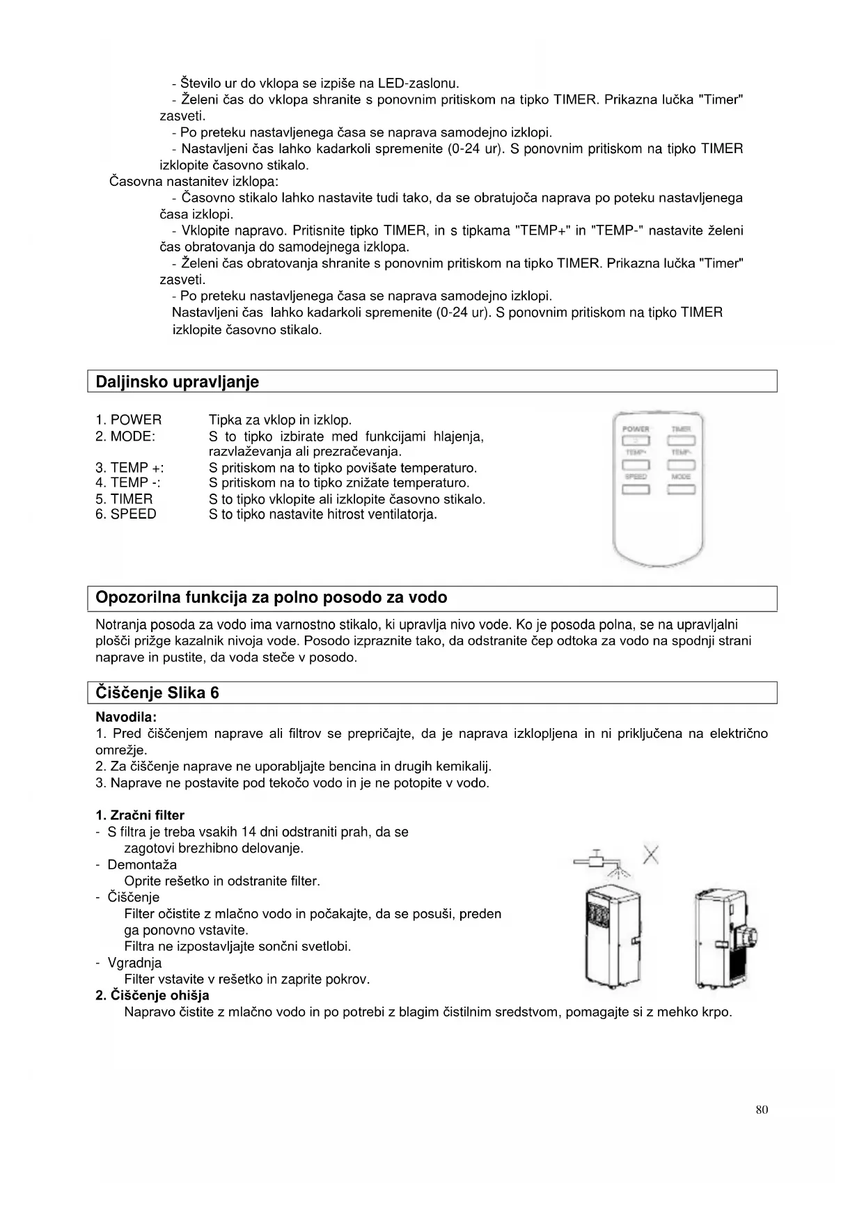 Časovna nastavitev vklopa: - Izklopite napravo. Pritisnite tipko TIMER in s tipkama "TEMP+" in "TEMP-" nastavite želeni čas do samodejnega vklopa. temp + način hitrosti ventilatorja temp - POWER LED-zaslon: časovno stikalo80 - Število ur do vklopa se izpiše na LED-zaslonu. - Želeni čas do vklopa shranite s ponovnim pritiskom na tipko TIMER. Prikazna lučka "Timer" zasveti. - Po preteku nastavljenega časa se naprava samodejno izklopi. - Nastavljeni čas lahko kadarkoli spremenite (0-24 ur). S ponovnim pritiskom na tipko TIMER izklopite časovno stikalo. Časovna nastanitev izklopa: - Časovno stikalo lahko nastavite tudi tako, da se obratujoča naprava po poteku nastavljenega časa izklopi. - Vklopite napravo. Pritisnite tipko TIMER, in s tipkama "TEMP+" in "TEMP-" nastavite želeni čas obratovanja do samodejnega izklopa. - Želeni čas obratovanja shranite s ponovnim pritiskom na tipko TIMER. Prikazna lučka "Timer" zasveti. - Po preteku nastavljenega časa se naprava samodejno izklopi. Nastavljeni čas lahko kadarkoli spremenite (0-24 ur). S ponovnim pritiskom na tipko TIMER izklopite časovno stikalo. Daljinsko upravljanje
