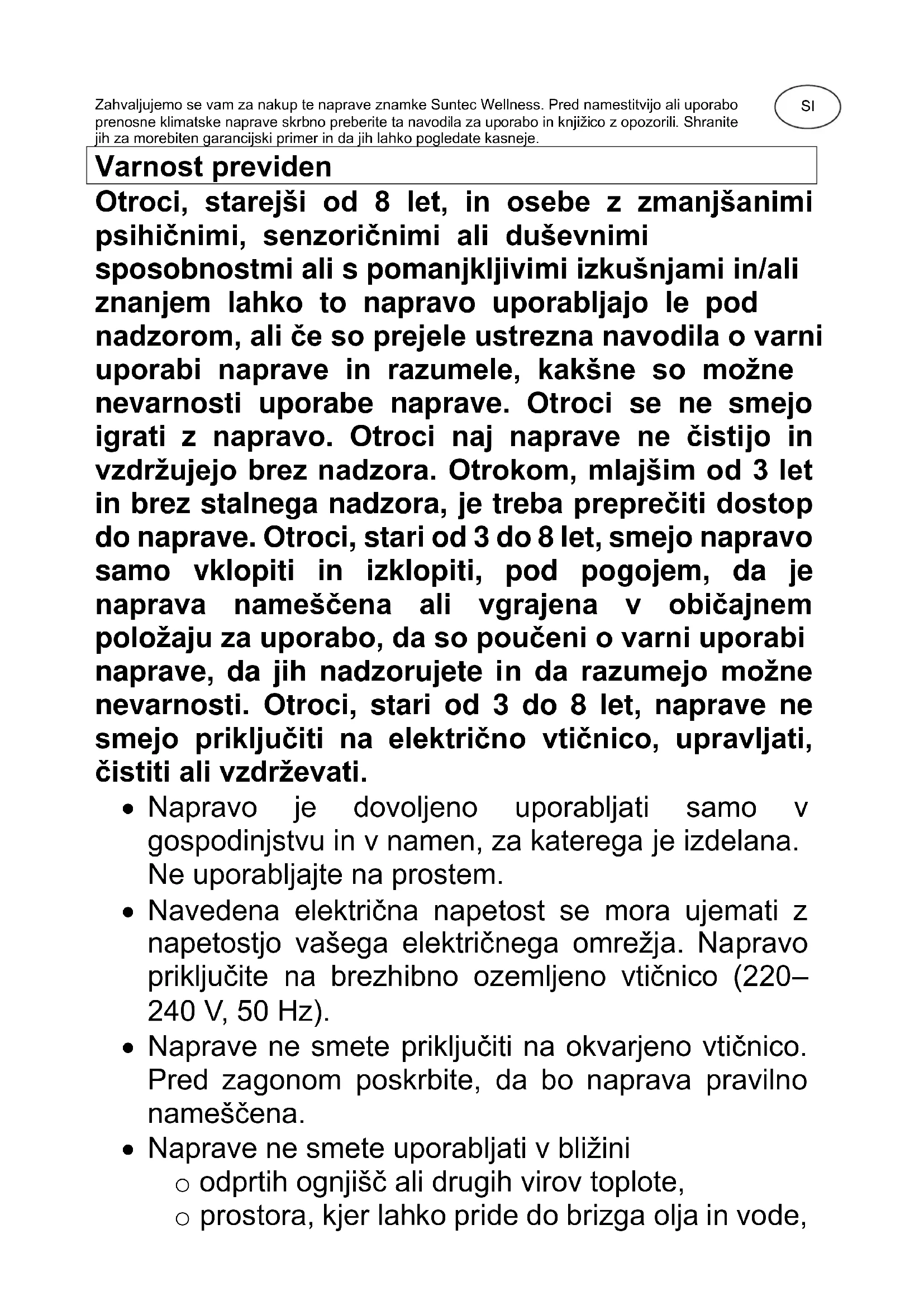IMPULS Eco R290 SUNTEC WELLNESS GMBH / HOLZSTRASSE 2 / 40 221 DÜSSELDORF / GERMANYSI Zahvaljujemo se vam za nakup te naprave znamke Suntec Wellness. Pred namestitvijo ali uporabo prenosne klimatske naprave skrbno preberite ta navodila za uporabo in knjižico z opozorili. Shranite jih za morebiten garancijski primer in da jih lahko pogledate kasneje. Varnost previden Otroci, starejši od 8 let, in osebe z zmanjšanimi psihičnimi, senzoričnimi ali duševnimi sposobnostmi ali s pomanjkljivimi izkušnjami in/ali znanjem lahko to napravo uporabljajo le pod nadzorom, ali če so prejele ustrezna navodila o varni uporabi naprave in razumele, kakšne so možne nevarnosti uporabe naprave. Otroci se ne smejo igrati z napravo. Otroci naj naprave ne čistijo in vzdržujejo brez nadzora. Otrokom, mlajšim od 3 let in brez stalnega nadzora, je treba preprečiti dostop do naprave. Otroci, stari od 3 do 8 let, smejo napravo samo vklopiti in izklopiti, pod pogojem, da je naprava nameščena ali vgrajena v običajnem položaju za uporabo, da so poučeni o varni uporabi naprave, da jih nadzorujete in da razumejo možne nevarnosti. Otroci, stari od 3 do 8 let, naprave ne smejo priključiti na električno vtičnico, upravljati, čistiti ali vzdrževati.
