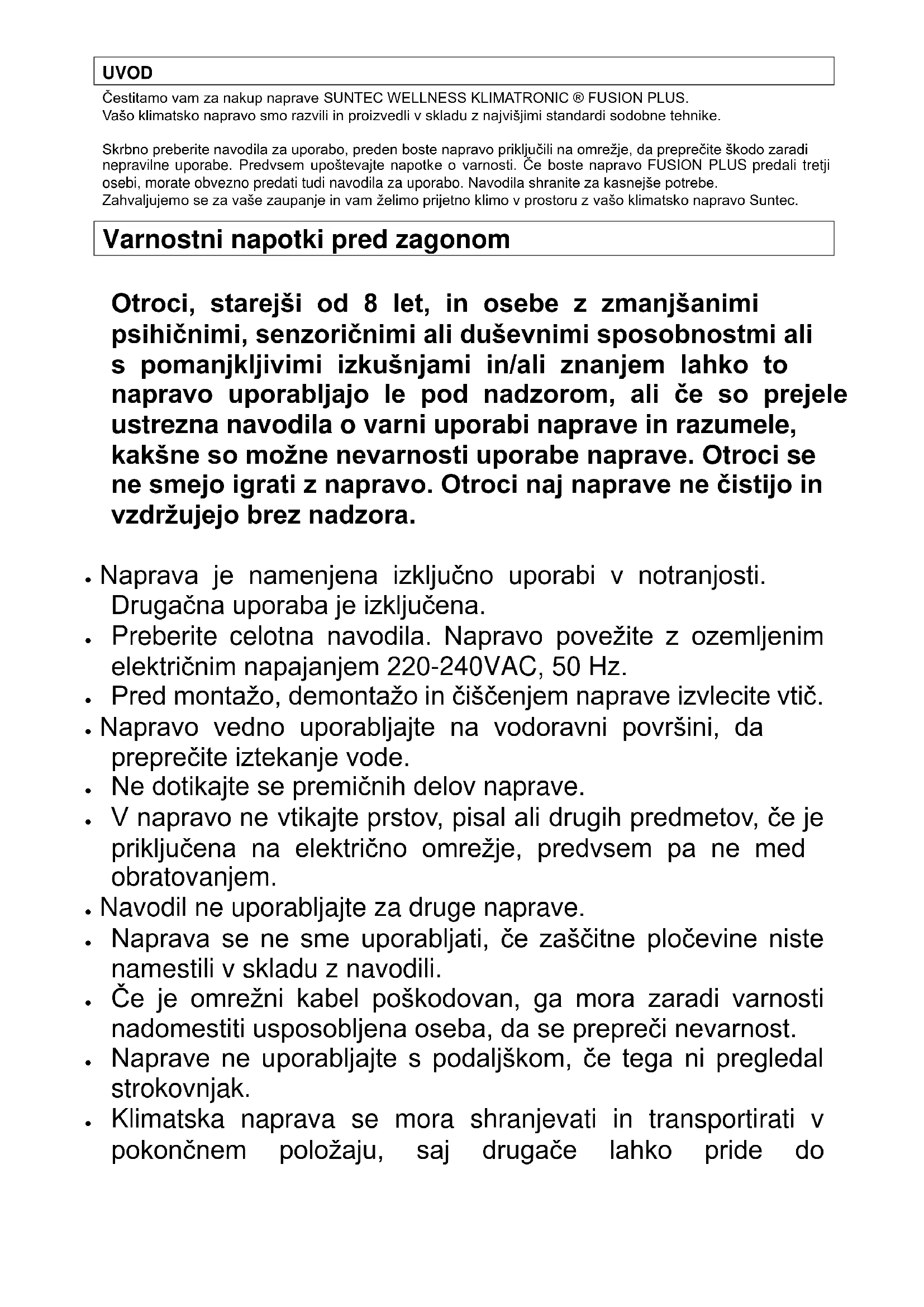 ZELO POMEMBNO! Mobilno klimatsko napravo montirajte in uporabljajte šele, ko boste skrbno prebrali ta navodila. Navodila shranite za morebitno uveljavljanje garancije in za kasnejše potrebe.UVOD Čestitamo vam za nakup naprave SUNTEC WELLNESS KLIMATRONIC ® FUSION PLUS. Vašo klimatsko napravo smo razvili in proizvedli v skladu z najvišjimi standardi sodobne tehnike. Skrbno preberite navodila za uporabo, preden boste napravo priključili na omrežje, da preprečite škodo zaradi nepravilne uporabe. Predvsem upoštevajte napotke o varnosti. Če boste napravo FUSION PLUS predali tretji osebi, morate obvezno predati tudi navodila za uporabo. Navodila shranite za kasnejše potrebe. Zahvaljujemo se za vaše zaupanje in vam želimo prijetno klimo v prostoru z vašo klimatsko napravo Suntec. Varnostni napotki pred zagonom Otroci, starejši od 8 let, in osebe z zmanjšanimi psihičnimi, senzoričnimi ali duševnimi sposobnostmi ali s pomanjkljivimi izkušnjami in/ali znanjem lahko to napravo uporabljajo le pod nadzorom, ali če so prejele ustrezna navodila o varni uporabi naprave in razumele, kakšne so možne nevarnosti uporabe naprave. Otroci se ne smejo igrati z napravo. Otroci naj naprave ne čistijo in vzdržujejo brez nadzora. Naprava je namenjena izključno uporabi v notranjosti. Drugačna uporaba je izključena. Preberite celotna navodila. Napravo povežite z ozemljenim električnim napajanjem 220-240VAC, 50 Hz. Pred montažo, demontažo in čiščenjem naprave izvlecite vtič. Napravo vedno uporabljajte na vodoravni površini, da preprečite iztekanje vode. Ne dotikajte se premičnih delov naprave. V napravo ne vtikajte prstov, pisal ali drugih predmetov, če je priključena na električno omrežje, predvsem pa ne med obratovanjem. Navodil ne uporabljajte za druge naprave. Naprava se ne sme uporabljati, če zaščitne pločevine niste namestili v skladu z navodili. Če je omrežni kabel poškodovan, ga mora zaradi varnosti nadomestiti usposobljena oseba, da se prepreči nevarnost. Naprave ne uporabljajte s podaljškom, če tega ni pregledal strokovnjak. Klimatska naprava se mora shranjevati in transportirati v pokončnem položaju, saj drugače lahko pride donepopravljive škode na kompresorju. Če niste prepričani, priporočamo, da jo pustite mirovati 24 ur, preden jo zaženete. Počakajte najmanj 3 minute, preden napravo ponovno zaženete, drugače se kompresor lahko poškoduje. Nikoli ne uporabljajte omrežnega vtiča za zagon in izklop naprave. Uporabite predvideno stikalo za vklop in izklop (ON/OFF), ki je na upravljalnem polju. Prenosno klimatsko napravo postavite na suho in trdno mesto. Naprava mora biti postavljena tako, da je priključek dostopen. Inštalirana mora biti v skladu z lokalnimi predpisi. Naprava ne sme obratovati v korodiranem okolju. Redno čistite filter, da zagotovite najboljšo učinkovitost hlajenja. Prazne baterije daljinskega upravljalnika odstranite in jih zavrzite v ustrezne odpadke. Naprava ne sme obratovati v bližini odprtih ognjišč. Naprava ne sme obratovati v okolju, kjer lahko pride do škropljenja vode in olja. Naprave ne izpostavljajte neposredno sončnim žarkom. Naprave nikoli ne prekrivajte in pazite, da dovod in odvod zraka nikoli nista blokirana. Naprava mora biti postavljena najmanj 50 cm oddaljeno od pohištva in sten. Nasveti za varčevanje z energijo Redno čistite filtre. V običajnih pogojih je treba filtre čistiti približno vsakih 30 dni. Glede na kakovost zraka v prostoru je morebitno potrebno pogostejše čiščenje. Pri prvem zagonu nastavite hitrost ventilatorja na najhitrejšo stopnjo, termostat pa na najhladnejšo. Priporočamo vam, da za boljši učinek način hlajenja uporabite le, če temperatura okolice ne presega 35 °C. Zato bo morebiti treba ob toplih dneh napravo zagnati zgodaj zjutraj, ko temperatura v prostoru ne presega 35 °C. Funkcije ogrevanja ne priporočamo, če je temperatura okolice pod 7 °C.Oznaka sestavnih delov