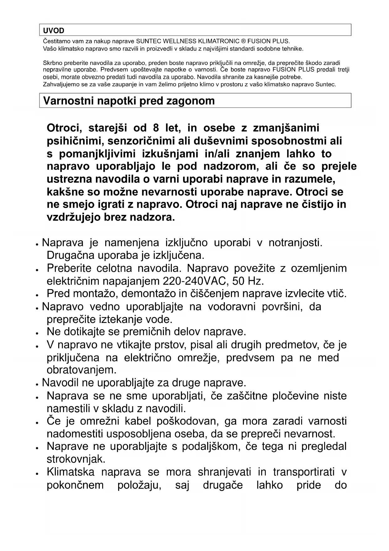ZELO POMEMBNO! Mobilno klimatsko napravo montirajte in uporabljajte šele, ko boste skrbno prebrali ta navodila. Navodila shranite za morebitno uveljavljanje garancije in za kasnejše potrebe.UVOD Čestitamo vam za nakup naprave SUNTEC WELLNESS KLIMATRONIC ® FUSION PLUS. Vašo klimatsko napravo smo razvili in proizvedli v skladu z najvišjimi standardi sodobne tehnike. Skrbno preberite navodila za uporabo, preden boste napravo priključili na omrežje, da preprečite škodo zaradi nepravilne uporabe. Predvsem upoštevajte napotke o varnosti. Če boste napravo FUSION PLUS predali tretji osebi, morate obvezno predati tudi navodila za uporabo. Navodila shranite za kasnejše potrebe. Zahvaljujemo se za vaše zaupanje in vam želimo prijetno klimo v prostoru z vašo klimatsko napravo Suntec. Varnostni napotki pred zagonom Otroci, starejši od 8 let, in osebe z zmanjšanimi psihičnimi, senzoričnimi ali duševnimi sposobnostmi ali s pomanjkljivimi izkušnjami in/ali znanjem lahko to napravo uporabljajo le pod nadzorom, ali če so prejele ustrezna navodila o varni uporabi naprave in razumele, kakšne so možne nevarnosti uporabe naprave. Otroci se ne smejo igrati z napravo. Otroci naj naprave ne čistijo in vzdržujejo brez nadzora. Naprava je namenjena izključno uporabi v notranjosti. Drugačna uporaba je izključena. Preberite celotna navodila. Napravo povežite z ozemljenim električnim napajanjem 220-240VAC, 50 Hz. Pred montažo, demontažo in čiščenjem naprave izvlecite vtič. Napravo vedno uporabljajte na vodoravni površini, da preprečite iztekanje vode. Ne dotikajte se premičnih delov naprave. V napravo ne vtikajte prstov, pisal ali drugih predmetov, če je priključena na električno omrežje, predvsem pa ne med obratovanjem. Navodil ne uporabljajte za druge naprave. Naprava se ne sme uporabljati, če zaščitne pločevine niste namestili v skladu z navodili. Če je omrežni kabel poškodovan, ga mora zaradi varnosti nadomestiti usposobljena oseba, da se prepreči nevarnost. Naprave ne uporabljajte s podaljškom, če tega ni pregledal strokovnjak. Klimatska naprava se mora shranjevati in transportirati v pokončnem položaju, saj drugače lahko pride donepopravljive škode na kompresorju. Če niste prepričani, priporočamo, da jo pustite mirovati 24 ur, preden jo zaženete. Počakajte najmanj 3 minute, preden napravo ponovno zaženete, drugače se kompresor lahko poškoduje. Nikoli ne uporabljajte omrežnega vtiča za zagon in izklop naprave. Uporabite predvideno stikalo za vklop in izklop (ON/OFF), ki je na upravljalnem polju. Prenosno klimatsko napravo postavite na suho in trdno mesto. Naprava mora biti postavljena tako, da je priključek dostopen. Inštalirana mora biti v skladu z lokalnimi predpisi. Naprava ne sme obratovati v korodiranem okolju. Redno čistite filter, da zagotovite najboljšo učinkovitost hlajenja. Prazne baterije daljinskega upravljalnika odstranite in jih zavrzite v ustrezne odpadke. Naprava ne sme obratovati v bližini odprtih ognjišč. Naprava ne sme obratovati v okolju, kjer lahko pride do škropljenja vode in olja. Naprave ne izpostavljajte neposredno sončnim žarkom. Naprave nikoli ne prekrivajte in pazite, da dovod in odvod zraka nikoli nista blokirana. Naprava mora biti postavljena najmanj 50 cm oddaljeno od pohištva in sten. Nasveti za varčevanje z energijo Redno čistite filtre. V običajnih pogojih je treba filtre čistiti približno vsakih 30 dni. Glede na kakovost zraka v prostoru je morebitno potrebno pogostejše čiščenje. Pri prvem zagonu nastavite hitrost ventilatorja na najhitrejšo stopnjo, termostat pa na najhladnejšo. Priporočamo vam, da za boljši učinek način hlajenja uporabite le, če temperatura okolice ne presega 35 °C. Zato bo morebiti treba ob toplih dneh napravo zagnati zgodaj zjutraj, ko temperatura v prostoru ne presega 35 °C. Funkcije ogrevanja ne priporočamo, če je temperatura okolice pod 7 °C.Oznaka sestavnih delov