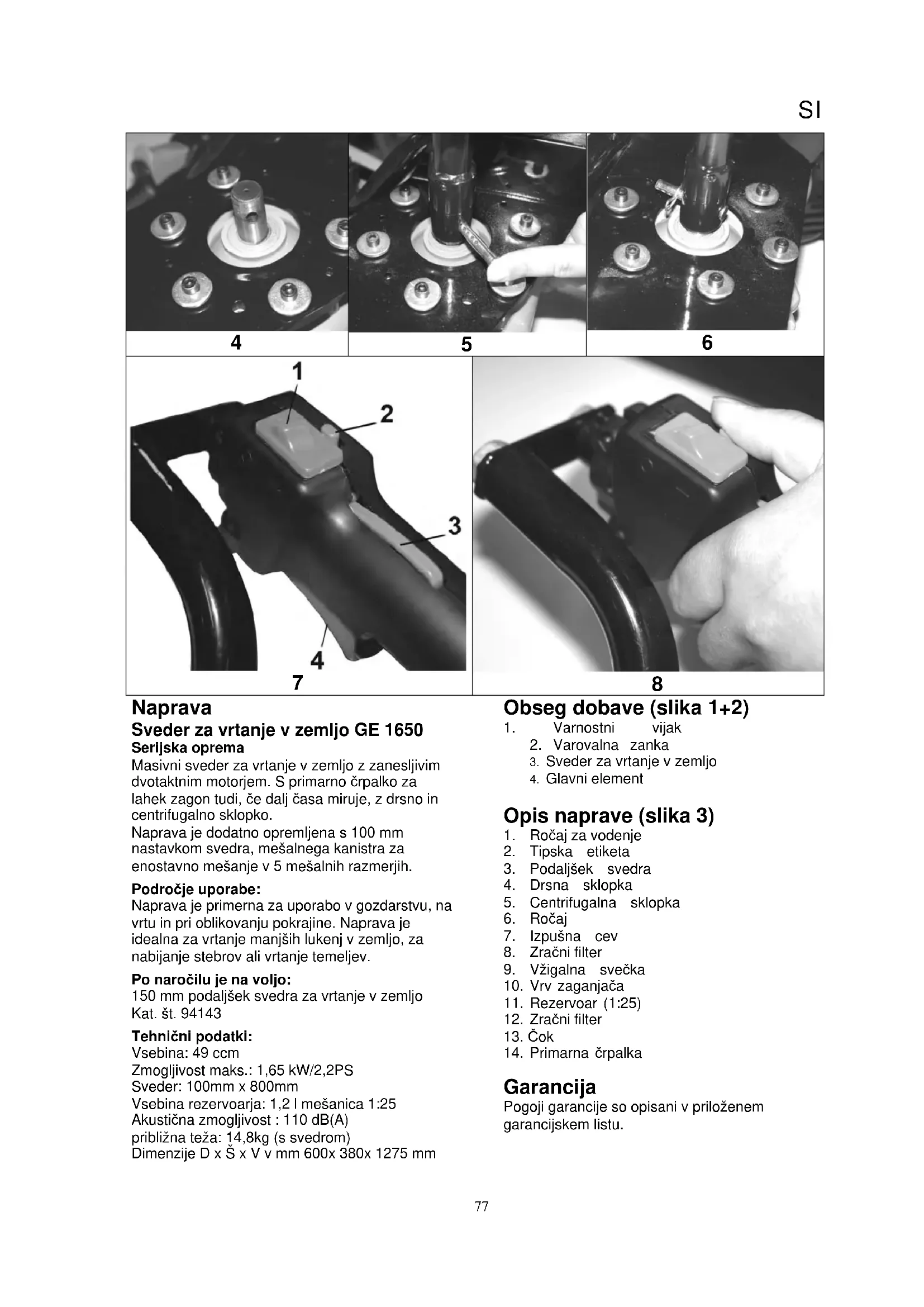 Sekundarne nevarnosti in varnostni ukrepi Sekundarne nevarnosti – mehanske poškodbe Zatikanje, navitje Polž lahko ujame ali potegne vrvi, žice ali dele obleke. Vedno nosite prilegajočo se obleko, lase si pokrijte z mrežico za lase, nakit pa snemite. Zaradi nenadne zaustavitve svedra lahko ročaji poškodujejo uporabnika. Upravljalne ročaje dobro primite in uporabljaje zaščitno obleko. Sekundarna nevarnost električnega udara Neposreden stik z električnim tokom Kadar motor deluje, obstaja v stiku s priključkom svečke nevarnost električnega udara. Kadar motor deluje, se ne dotikajte vžigalne svečke. Sekundarna nevarnost zaradi visoke toplote Opekline, omrzline Stik z izpušno cevjo lahko povzroči opekline. Naprava naj se ohladi. Nevarnost zaradi hrupa Poškodbe sluha Uporaba naprave brez uporabe ustreznih zaščitnih pripomočkov, lahko poškoduje sluh. Vedno uporabljajte zaščitne slušalke. Nevarnost zaradi vibracij Vibriranje celega telesa Če uporabljate stroj dalj časa, lahko zaradi vibracij povzroči telesne poškodbe. Priporočamo pogoste in redne odmore. Nevarnosti v stiku z materialom in drugimi snovmi Stik, vdihavanje. Vdihavanje izpušnih plinov je lahko zelo škodljivo za zdravje. Napravo uporabljajte le na prostem. Požar in eksplozija Napravo poganja vnetljiva zmes goriva, ki se lahko med dolivanjem vname. Napravo uporabljajte le na prostem. Zanemarjanje ergonomskih načel Malomarna uporaba osebnih zaščitnih sredstev. Uporaba stroja brez primernih zaščitnih sredstev lahko pripelje do zunanjih in notranjih poškodb. Vedno uporabljajte predpisano obleko in ravnajte previdno. Premalo osvetljen prostor V premalo osvetljenem prostoru obstaja večja nevarnost poškodb. Pri delu z napravo vedno poskrbite, da bo delovni prostor dobro osvetljen. Druge nevarnosti Odbiti predmeti ali brizgajoče tekočine Pri vrtanju lahko deli svedra ali mehanski delci poškodujejo oči uporabnika. Pri delu z napravo vedno uporabljajte zaščitna očala. Odstranjevanje Napotki za odstranjevanje izhajajo iz ideogramov, ki se nahajajo na napravi oziroma na ovitku. Njihov pomen je razložen v poglavju »Oznake na napravi«. Zahteve, ki jih mora spolnjevati uporabnik Uporabnik je pred uporabo naprave dolžan natančno prebrati navodilo za uporabo. Izobrazba Za uporabo ni potrebna nobena posebna izobrazba, razen strokovnih napotkov v zvezi z uporabo naprave. Minimalna starost Mladoletniki lahko uporabljajo napravo, ko dopolnijo 16. leto starosti. Izjema so mladoletniki, ki se kot vajenci udeležijo del z namenom, da se naučijo pravilne uporabe; morajo pa biti pod stalnim nadzorom učitelja. Šolanje Glede pravilne uporabe se posvetujte z izkušeno osebo in natančno preberite navodilo za uporabo. Posebno šolanje zato ni potrebno. Tehnični podatki Vsebina: 49 ccm Zmogljivost maks.: 1,65 kW/2,2PS Sveder: 100mm x 800mm Vsebina rezervoarja: 1,2 l mešanicaSI