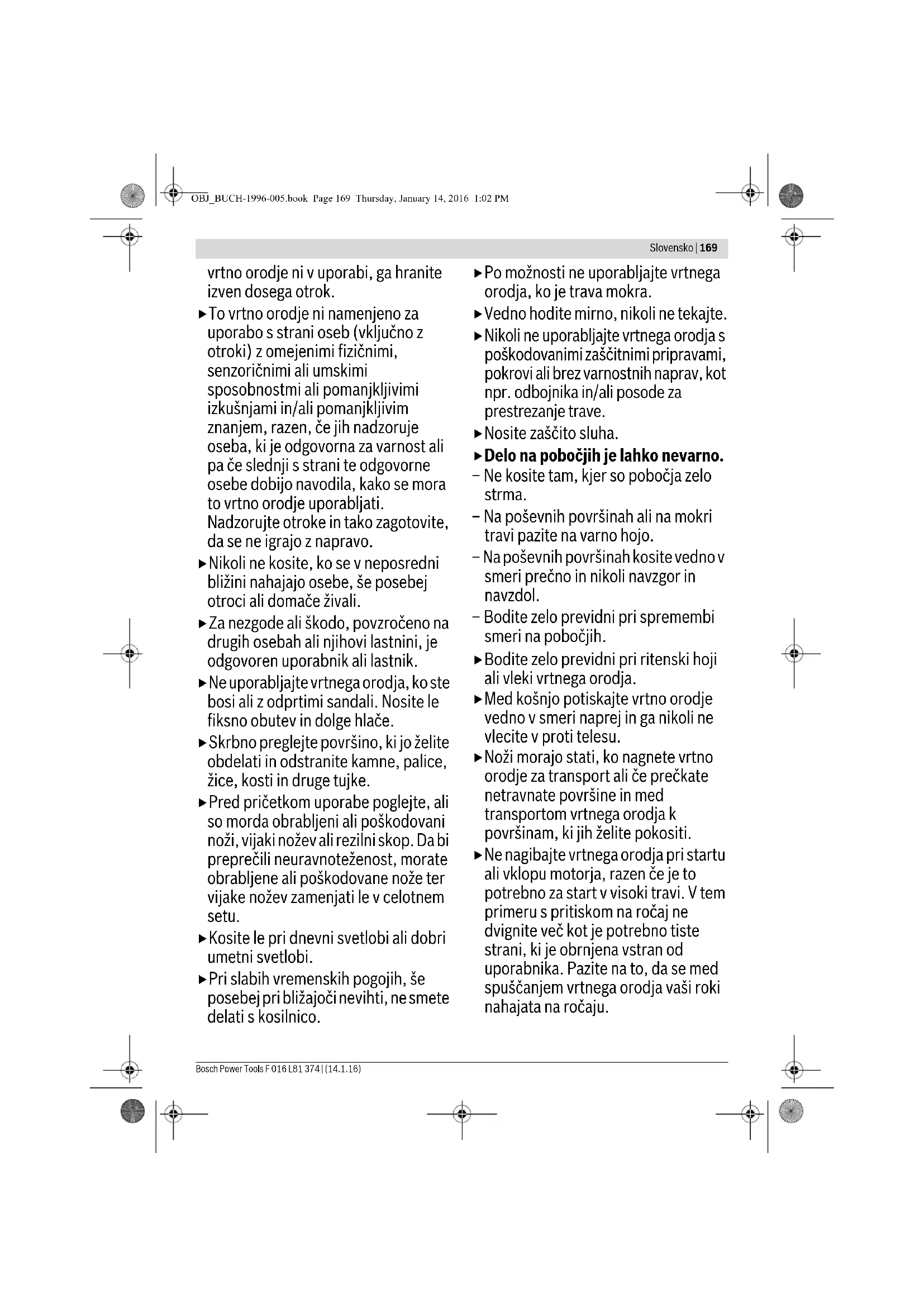 Cilj rukovanja Slika Strana STOP Simptomi Mogući uzroci Pomoć Motor ne kreće Nema mrežnog napona Prokontrolisati i uključiti Neispravna mrežna utičnica Koristite drugu utičnicu Oštećen produžni kabl Ispitajte i zamenite kabl ako je oštećen Osigurač je izbio Promeniti osigurač Previsoka trava Podesiti veću visinu presecanja i baštenski uredjaj iskrenuti, da bi redukovali početno opterećenje Motorna zaštita je reagovala Motor ostaviti da se ohladi i podesiti veću visinu košenja Baštenski uredjaj radi sa prekidima Oštećen produžni kabl Ispitajte i zamenite kabl ako je oštećen Interni kablovi baštenskog uredjaja su u kvaru Potražiti ovlašćeni servis Motorna zaštita je reagovala Motor ostaviti da se ohladi i podesiti veću visinu košenja Baštenski uredjaj ostavlja iza neurednu sliku sečenja I/ili Motor radi teško Visina košenja je preniska Podesiti veću visinu košenja Nož je tup Promena noža Moguće je začepljenje Ispitajte donju stranu baštenskog uredjaja i u datom slučaju je oslobodite (uvek nosite zaštitne rukavice za rad u bašti) Nož je okolo pogrešno montiran Nož montirati okolo ispravno Posle uključivanja baštenskog uredjaja ne okreće se nož Nožu smeta trava Isključiti baštenski uredjaj Otkloniti začepljenje (uvek nosite zaštitne rukavice za rad u bašti) Odpušteni navrtka/zavrtanj noža Steći navrtku/zavrtanj noža (17 Nm) Jake vibracije/šumovi Odpušteni navrtka/zavrtanj noža Steći navrtku/zavrtanj noža (17 Nm) Nož je oštećen Promena noža OBJ_BUCH-1996-005.book Page 167 Thursday, January 14, 2016 1:02 PM168 | Slovensko F 016 L81 374 | (14.1.16) Bosch Power Tools Keller d.o.o. Ljubomira Nikolica 29 18000 Nis Tel./Fax: (018) 274030 Tel./Fax: (018) 531798 Web: www.keller-nis.com E-Mail: office@keller-nis.com Uklanjanje djubreta Baštenski uredjaji, pribor i pakovanja treba da se odvoze nekojh regeneraciji koja odgovara zaštiti čovekove okoline. Ne bacajte baštenski uredjaj u kućno djubre! Samo za EU-zemlje: Prema evropskoj smernici 2012/19/EU o starim električnim i elektronskim uredjajima i njijhovom pretvaranju u nacionalno dobro ne moraju više neupotrebljivi električni i elektronski uredjaji da se odvojeno sakupljaju i odvoze reciklaži koja odgovara zaštiti čovekove sredine. Zadržavamo pravo na promene. Slovensko Varnostna navodila Pozor! Skrbno si preberite naslednja navodila. Seznanite se z upravljalnimi elementi in s pravilno uporabo vrtnega orodja. Prosimo, da to navodilo za obratovanje varno shranite za kasnejšo uporabo. Razlaga simbolov na vrtnem orodju Splošno opozorilo na nevarnost. Preberite si to navodilo za obratovanje. Pazite, da predmeti, ki bi odleteli od škarij, ne bodo poškodovali oseb, ki stojijo v bližini. Opozorilo: Ko vrtno orodje obratuje, držite varno razdaljo do slednjega. Pozor: Previdno – ne dotikajte se rotirajočih nožev. Nožje so ostri. Pazite na to, da ne boste izgubili prste na nogah in rokah. Ne ustreza. Preden želite opraviti nastavitve na stroju ali pa ga občistiti ali če se je zamotal kabel oziroma, če morate vrtno orodje za kratek čas pustiti brez nadozora, morate izklopiti vrtno orodje in potegniti omrežni vtič iz vtičnice. Poskrbite za to, da bo električni kabel oddaljen od rezalnih nožev. Počakajte na to, da se vsi deli vrtnega orodja popolnoma ustavijo, preden se je dotaknete. Noži po izklopu vrtnega orodja nadaljujejo z rotiranjem in lahko povzročijo poškodbe. Vrtnega orodja ne uporabljajte, ko dežuje in ga ne izpostavljajte dežju. Zaščitite se pred električnim udarom. Poskrbite za to, da bo priključni kabel oddaljen od rezalnih nožev. Uporaba Nikoli ne dovolite otrokom ali osebam, ki niso seznanjene s temi navodili, da bi uporabljale to vrtno orodje. Nacionalni predpisi morebiti omejujejo starost uporabnika. Kadar OBJ_BUCH-1996-005.book Page 168 Thursday, January 14, 2016 1:02 PMSlovensko | 169 Bosch Power Tools F 016 L81 374 | (14.1.16) vrtno orodje ni v uporabi, ga hranite izven dosega otrok. To vrtno orodje ni namenjeno za uporabo s strani oseb (vključno z otroki) z omejenimi fizičnimi, senzoričnimi ali umskimi sposobnostmi ali pomanjkljivimi izkušnjami in/ali pomanjkljivim znanjem, razen, če jih nadzoruje oseba, ki je odgovorna za varnost ali pa če slednji s strani te odgovorne osebe dobijo navodila, kako se mora to vrtno orodje uporabljati. Nadzorujte otroke in tako zagotovite, da se ne igrajo z napravo. Nikoli ne kosite, ko se v neposredni bližini nahajajo osebe, še posebej otroci ali domače živali. Za nezgode ali škodo, povzročeno na drugih osebah ali njihovi lastnini, je odgovoren uporabnik ali lastnik. Ne uporabljajte vrtnega orodja, ko ste bosi ali z odprtimi sandali. Nosite le fiksno obutev in dolge hlače. Skrbno preglejte površino, ki jo želite obdelati in odstranite kamne, palice, žice, kosti in druge tujke. Pred pričetkom uporabe poglejte, ali so morda obrabljeni ali poškodovani noži, vijaki nožev ali rezilni skop. Da bi preprečili neuravnoteženost, morate obrabljene ali poškodovane nože ter vijake nožev zamenjati le v celotnem setu. Kosite le pri dnevni svetlobi ali dobri umetni svetlobi. Pri slabih vremenskih pogojih, še posebej pri bližajoči nevihti, ne smete delati s kosilnico. Po možnosti ne uporabljajte vrtnega orodja, ko je trava mokra. Vedno hodite mirno, nikoli ne tekajte. Nikoli ne uporabljajte vrtnega orodja s poškodovanimi zaščitnimi pripravami, pokrovi ali brez varnostnih naprav, kot npr. odbojnika in/ali posode za prestrezanje trave. Nosite zaščito sluha. Delo na pobočjih je lahko nevarno. – Ne kosite tam, kjer so pobočja zelo strma. – Na poševnih površinah ali na mokri travi pazite na varno hojo. – Na poševnih površinah kosite vedno v smeri prečno in nikoli navzgor in navzdol. – Bodite zelo previdni pri spremembi smeri na pobočjih. Bodite zelo previdni pri ritenski hoji ali vleki vrtnega orodja. Med košnjo potiskajte vrtno orodje vedno v smeri naprej in ga n