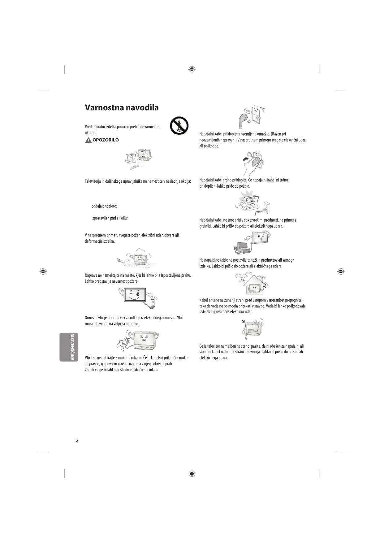 - LG-jevi televizorji LED uporabljajo zaslon LCD in osvetlitev ozadja s tehnologijo LED. www.lg.com2 Varnostna navodila Pred uporabo izdelka pozorno preberite varnostne ukrepe. OPOZORILO Televizorja in daljinskega upravljalnika ne namestite v naslednja okolja: tNa neposredno sončno svetlobo; tV prostor z visoko zračno vlažnostjo, kot je kopalnica; tV bližino virov toplote, kot so štedilniki in druge naprave, ki oddajajo toploto; tV bližino kuhinjskih pultov ali vlažilnikov zraka, kjer bi lahko izpostavljen pari ali olju; tV območje, kjer bi bil izpostavljen dežju ali vetru; tV bližino posod z vodo, kot so vaze. V nasprotnem primeru tvegate požar, električni udar, okvare ali deformacije izdelka. Naprave ne nameščajte na mesto, kjer bi lahko bila izpostavljena prahu. Lahko predstavlja nevarnost požara. Omrežni vtič je pripomoček za odklop iz električnega omrežja. Vtič mora biti vedno na voljo za uporabo. Vtiča se ne dotikajte z mokrimi rokami. Če je kabelski priključek moker ali prašen, ga povsem osušite oziroma z njega obrišite prah. Zaradi vlage bi lahko prišlo do električnega udara. Napajalni kabel priklopite v ozemljeno omrežje. (Razen pri neozemljenih napravah.) V nasprotnem primeru tvegate električni udar ali poškodbe. Napajalni kabel trdno priklopite. Če napajalni kabel ni trdno priklopljen, lahko pride do požara. Napajalni kabel ne sme priti v stik z vročimi predmeti, na primer z grelniki. Lahko bi prišlo do požara ali električnega udara. Na napajalne kable ne postavljajte težkih predmetov ali samega izdelka. Lahko bi prišlo do požara ali električnega udara. Kabel antene na zunanji strani pred vstopom v notranjost prepognite, tako da voda ne bo mogla pritekati v stavbo. Voda bi lahko poškodovala izdelek in povzročila električni udar. Če je televizor nameščen na steno, pazite, da ni obešen za napajalni ali signalni kabel na hrbtni strani televizorja. Lahko bi prišlo do požara ali električnega udara. SLOVENŠČINA3 Ne priklopite preveč električnih naprav na en sam razdelilnik. Lahko bi prišlo do požara zaradi pregrevanja. Pazite, da vam izdelek med priklopom zunanjih naprav ne pade. Lahko bi prišlo do telesnih poškodb ali škode na izdelku. Snovi za vpijanje vlage ali vinilno embalažo hranite zunaj dosega otrok. Snovi za vpijanje vlage so strupene, če jih zaužijete. V primeru nenamernega zaužitja pacienta prisilite k bruhanju in odpeljite v najbližjo bolnišnico. Vinilna embalaža predstavlja tveganje zadušitve. Hranite jo zunaj dosega otrok. Otrokom ne pustite plezanja ali obešanja na televizor. Televizor bi se lahko prevrnil in povzročil hude poškodbe. Izrabljene baterije zavrzite odgovorno, da jih ne bo mogel zaužiti otrok. Če jih otrok vendarle zaužije, nemudoma poiščite zdravniško pomoč. Če je en konec napajalnega kabla priključen v stensko vtičnico, v drugi konec ne vstavljajte prevodnikov (kot je kovinska paličica). Poleg tega se ne dotaknite napajalnega kabla tik po tem, ko ga vstavite v vtičnico. S tem bi tvegali električni udar. (Odvisno od modela) Blizu naprave ne postavljajte ali hranite vnetljivih snovi. Neprevidno ravnanje z vnetljivimi snovmi lahko privede do eksplozije ali požara. V izdelek ne vstavljajte kovinskih predmetov, na primer kovancev, lasnih igel, paličic in žic, ali vnetljivih predmetov, na primer papirja ali vžigalic. Še zlasti bodite previdni v prisotnosti otrok. Lahko bi prišlo do električnega udara, požara ali poškodb. Če v izdelek pade predmet, izključite napajalni kabel in se obrnite na servisni center. Izdelka ne škropite z vodo ali ga čistite z vnetljivimi sredstvi (razredčila ali benzen). Lahko bi prišlo do požara ali električnega udara. Izdelka ne izpostavljajte udarcem, vanj ne vstavljajte predmetov in ne tolcite po zaslonu. Sicer lahko pride do električnega udara ali poškodb izdelka. SLOVENŠČINA4 Izdelka ali antene se ne dotikajte med nevihto ali bliskanjem. S tem bi tvegali električni udar. Če pride do uhajanja plina, izdelka ni dovoljeno odklopiti iz vtičnice. Sobo je treba najprej dobro prezračiti. Lahko bi prišlo do požara ali opeklin zaradi iskrenja. Izdelka ne razstavljajte, popravljajte ali spreminjajte sami. Lahko bi prišlo do požara ali električnega udara. Za pregled, umerjanje ali popravilo se obrnite na servisni center. V naslednjih primerih nemudoma odklopite izdelek in se obrnite na lokalni servisni center. tIzdelek je utrpel udarec. tIzdelek je poškodovan. tV izdelku so predmeti. tIzdelek oddaja dim ali nenavaden vonj. Lahko bi prišlo do požara ali električnega udara. Če naprave dlje časa ne boste uporabljali, izključite napajalni kabel. Prah lahko povzroči požar, poškodovana izolacija pa lahko povzroči preskok električne iskre, električni udar ali požar. Izdelka ne izpostavljajte kapljanju ali razlitju tekočin, nanj pa tudi ni dovoljeno postavljati predmetov, napolnjenih z vodo, na primer vaz. Izdelka ne nameščajte na steno, če bi bil lahko izpostavljen olju ali oljnim hlapom. Izdelek se lahko poškoduje in pade. Če v izdelek (adapter AC, napajalni kabel, televizor ...) prodre voda ali druga snov, izključite napajalni kabel in se takoj obrnite na servisni center. Lahko bi prišlo do požara ali električnega udara. Uporabljajte samo odobreni adapter AC in napajalni kabel, ki ga je odobrila družba LG Electronics. Sicer lahko pride do požara, električnega udara, okvare ali deformacije izdelka. Adapterja AC in napajalnega kabla ne razstavljajte. Lahko bi prišlo do požara ali električnega udara. Z adapterjem ravnajte previdno, da ga ne udarite. Udarec lahko adapter poškoduje. Prepričajte se, da je napajalni kabel trdno priključen na vtičnico televizorja. (Odvisno od modela) SLOVENŠČINA5 POZOR Napravo namestite na mesto, kjer ni radijskih valov. Zunanja antena mora biti dovolj oddaljena od napajalnih vodov, da med njimi ne more priti do stika, tudi če bi antena padla. Lahko bi prišlo do elektr