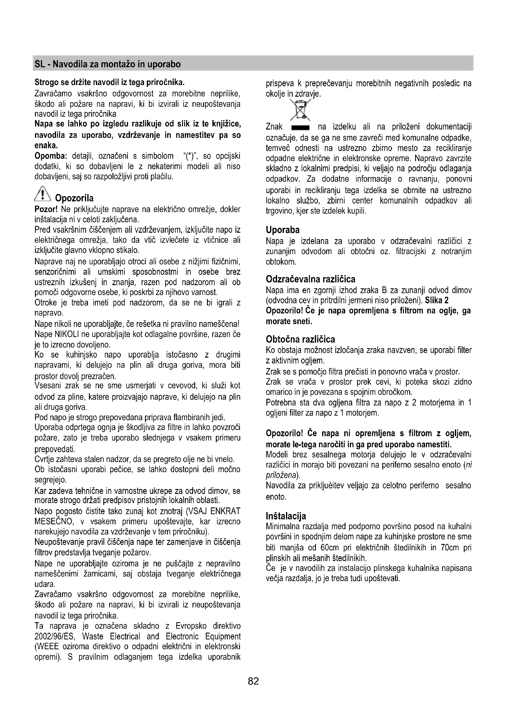 - Za olajšati namestitev vam svetujemo, da začasno odstranite maščobne filtre in druge dele, katerih odstranitev in ponovna namestitev sta dovoljeni in kot taki tukaj opisani. Te dele ponovno namestite po zaključeni namestitvi. Za demontažo glejte ustrezne odstavke.