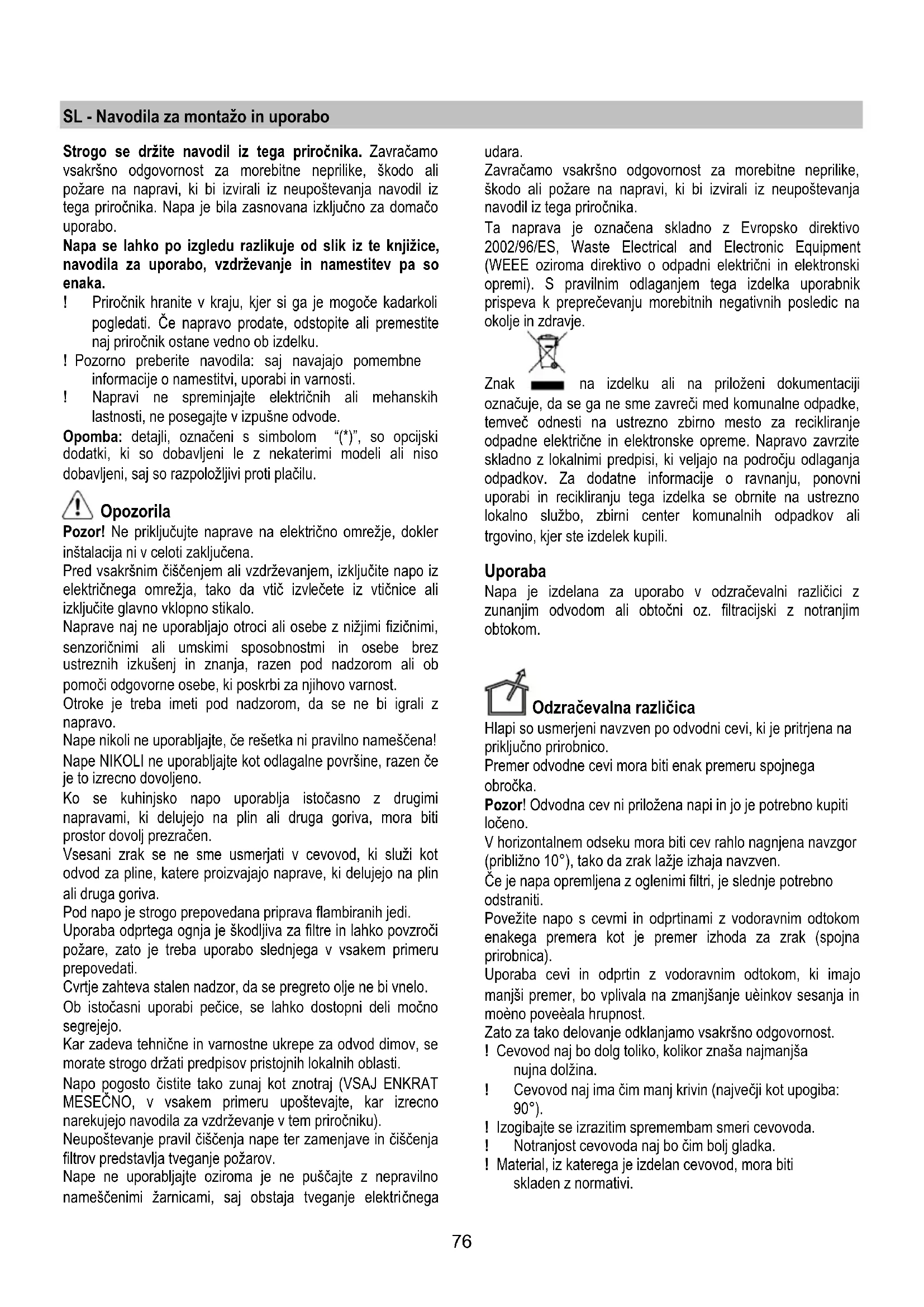 Ukoliko rasveta ne funkcioniše, kontrolišite da li ste pravilno postavili lampe na njihovo mesto pre nego što pozovete servisnu službu radi asistencije.76 SL - Navodila za montažo in uporabo Strogo se držite navodil iz tega priročnika. Zavračamo vsakršno odgovornost za morebitne neprilike, škodo ali požare na napravi, ki bi izvirali iz neupoštevanja navodil iz tega priročnika. Napa je bila zasnovana izključno za domačo uporabo. Napa se lahko po izgledu razlikuje od slik iz te knjižice, navodila za uporabo, vzdrževanje in namestitev pa so enaka. ! Priročnik hranite v kraju, kjer si ga je mogoče kadarkoli pogledati. Če napravo prodate, odstopite ali premestite naj priročnik ostane vedno ob izdelku. ! Pozorno preberite navodila: saj navajajo pomembne informacije o namestitvi, uporabi in varnosti. ! Napravi ne spreminjajte električnih ali mehanskih lastnosti, ne posegajte v izpušne odvode. Opomba: detajli, označeni s simbolom “(*)”, so opcijski dodatki, ki so dobavljeni le z nekaterimi modeli ali niso dobavljeni, saj so razpoložljivi proti plačilu. Opozorila Pozor! Ne priključujte naprave na električno omrežje, dokler inštalacija ni v celoti zaključena. Pred vsakršnim čiščenjem ali vzdrževanjem, izključite napo iz električnega omrežja, tako da vtič izvlečete iz vtičnice ali izključite glavno vklopno stikalo. Naprave naj ne uporabljajo otroci ali osebe z nižjimi fizičnimi, senzoričnimi ali umskimi sposobnostmi in osebe brez ustreznih izkušenj in znanja, razen pod nadzorom ali ob pomoči odgovorne osebe, ki poskrbi za njihovo varnost. Otroke je treba imeti pod nadzorom, da se ne bi igrali z napravo. Nape nikoli ne uporabljajte, če rešetka ni pravilno nameščena! Nape NIKOLI ne uporabljajte kot odlagalne površine, razen če je to izrecno dovoljeno. Ko se kuhinjsko napo uporablja istočasno z drugimi napravami, ki delujejo na plin ali druga goriva, mora biti prostor dovolj prezračen. Vsesani zrak se ne sme usmerjati v cevovod, ki služi kot odvod za pline, katere proizvajajo naprave, ki delujejo na plin ali druga goriva. Pod napo je strogo prepovedana priprava flambiranih jedi. Uporaba odprtega ognja je škodljiva za filtre in lahko povzroči požare, zato je treba uporabo slednjega v vsakem primeru prepovedati. Cvrtje zahteva stalen nadzor, da se pregreto olje ne bi vnelo. Ob istočasni uporabi pečice, se lahko dostopni deli močno segrejejo. Kar zadeva tehnične in varnostne ukrepe za odvod dimov, se morate strogo držati predpisov pristojnih lokalnih oblasti. Napo pogosto čistite tako zunaj kot znotraj (VSAJ ENKRAT MESEČNO, v vsakem primeru upoštevajte, kar izrecno narekujejo navodila za vzdrževanje v tem priročniku). Neupoštevanje pravil čiščenja nape ter zamenjave in čiščenja filtrov predstavlja tveganje požarov. Nape ne uporabljajte oziroma je ne puščajte z nepravilno nameščenimi žarnicami, saj obstaja tveganje elektri čnega udara. Zavračamo vsakršno odgovornost za morebitne neprilike, škodo ali požare na napravi, ki bi izvirali iz neupoštevanja navodil iz tega priročnika. Ta naprava je označena skladno z Evropsko direktivo 2002/96/ES, Waste Electrical and Electronic Equipment (WEEE oziroma direktivo o odpadni električni in elektronski opremi). S pravilnim odlaganjem tega izdelka uporabnik prispeva k preprečevanju morebitnih negativnih posledic na okolje in zdravje. Znak na izdelku ali na priloženi dokumentaciji označuje, da se ga ne sme zavreči med komunalne odpadke, temveč odnesti na ustrezno zbirno mesto za recikliranje odpadne električne in elektronske opreme. Napravo zavrzite skladno z lokalnimi predpisi, ki veljajo na področju odlaganja odpadkov. Za dodatne informacije o ravnanju, ponovni uporabi in recikliranju tega izdelka se obrnite na ustrezno lokalno službo, zbirni center komunalnih odpadkov ali trgovino, kjer ste izdelek kupili. Uporaba Napa je izdelana za uporabo v odzračevalni različici z zunanjim odvodom ali obtočni oz. filtracijski z notranjim obtokom. Odzračevalna različica Hlapi so usmerjeni navzven po odvodni cevi, ki je pritrjena na priključno prirobnico. Premer odvodne cevi mora biti enak premeru spojnega obročka. Pozor! Odvodna cev ni priložena napi in jo je potrebno kupiti ločeno. V horizontalnem odseku mora biti cev rahlo nagnjena navzgor (približno 10°), tako da zrak lažje izhaja navzven. Če je napa opremljena z oglenimi filtri, je slednje potrebno odstraniti. Povežite napo s cevmi in odprtinami z vodoravnim odtokom enakega premera kot je premer izhoda za zrak (spojna prirobnica). Uporaba cevi in odprtin z vodoravnim odtokom, ki imajo manjši premer, bo vplivala na zmanjšanje uèinkov sesanja in moèno poveèala hrupnost. Zato za tako delovanje odklanjamo vsakršno odgovornost. ! Cevovod naj bo dolg toliko, kolikor znaša najmanjša nujna dolžina. ! Cevovod naj ima čim manj krivin (največji kot upogiba: 90°). ! Izogibajte se izrazitim spremembam smeri cevovoda. ! Notranjost cevovoda naj bo čim bolj gladka. ! Material, iz katerega je izdelan cevovod, mora biti skladen z normativi.77 Obtočna različica Iz vsesanega zraka so pred ponovnim vnosom v prostor odstranjeni maščoba in neprijetne vonjave. Pri uporabi nape v tej izvedbi je potrebno namestiti dodatni filter na osnovi aktivnega oglja. Modeli brez sesalnega motorja delujejo le v odzračevalni različici in morajo biti povezani na periferno sesalno enoto (ni priložena). Navodila za prikljuèitev veljajo za celotno periferno sesalno enoto. Inštalacija Minimalna razdalja med podporno površino posod na kuhalni površini in spodnjim delom nape za kuhinjske prostore ne sme biti manjša od 50cm pri električnih štedilnikih in 65cm pri plinskih ali mešanih štedilnikih. Če je v navodilih za instalacijo plinskega kuhalnika napisana večja razdalja, jo je treba tudi upoštevati. Električna povezava Omrežna napetost mora ustrezati napetosti, navedeni na nalepki z lastnostmi, nameščeni v notranjosti na