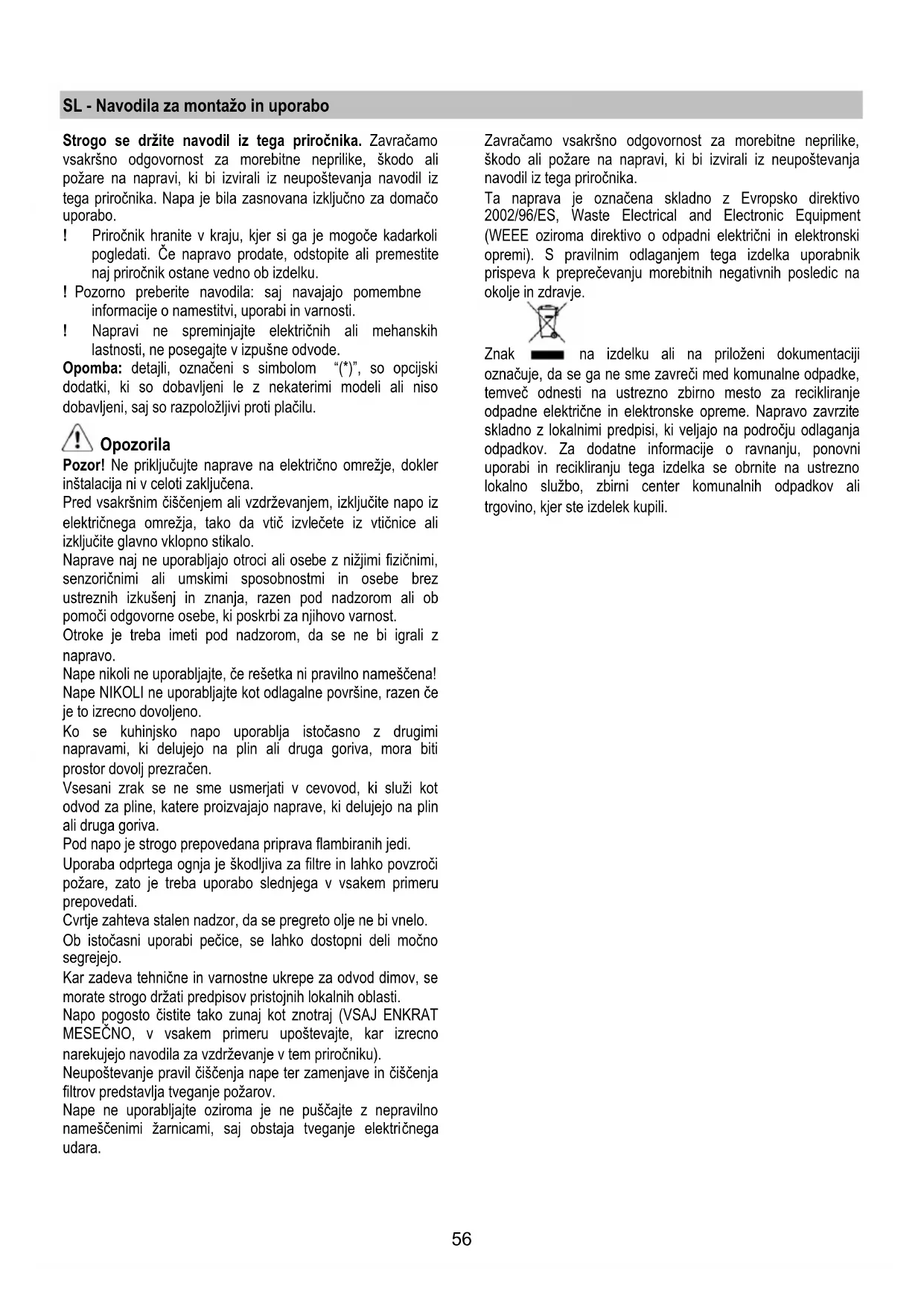 Filtrirna različica V slučaju, da ni mogoče izpustiti dima in pare nastalih pri kuhanju proti zunanjosti, se lahko uporabi napa v filtrirni različici tako, da se namesti filter na oglje, dim in para so reciklirani preko sprednje mrežice, ki je nad komandno ploščo. Preveriti, če je izvlečno/filtrirno stikalo v položaju filtriranja (F). Modeli brez sesalnega motorja delujejo le v odzračevalni različici in morajo biti povezani na periferno sesalno enoto (ni priložena). Navodila za prikljuèitev veljajo za celotno periferno sesalno enoto. Inštalacija Minimalna razdalja med podporno površino posod na kuhalni površini in spodnjim delom nape za kuhinjske prostore ne sme biti manjša od 60cm pri električnih štedilnikih in 70cm pri plinskih ali mešanih štedilnikih. Če je v navodilih za instalacijo plinskega kuhalnika napisana večja razdalja, jo je treba tudi upoštevati. Električna povezava Omrežna napetost mora ustrezati napetosti, navedeni na nalepki z lastnostmi, nameščeni v notranjosti nape. Če ima napa vtič, slednjega vstavite v vtičnico, ki je skladna z veljavnimi predpisi in se nahaja na takem mestu, ki bo dostopno tudi po vgradnji naprave. Če napa nima vtiča (neposredna povezava na omrežje) ali se vtič nahaja na takem mestu, ki po vgradnji naprave ne bi bilo dostopno, namestite dvopolno stikalo, skladno s predpisi, ki zagotavlja popoln izklop iz omrežja v pogojih prenapetostnega razreda III, skladno s predpisi o inštalaciji. Pozor! pred ponovnim priklopom tokokroga nape na omrežno napajanje in kontrolo pravilnega delovanja, vselej preverite, ali je omrežni kabel pravilno nameščen. Pozor! Zamenjavo napajalnega kabla mora izvesti pooblaščena servisna služba, tako da se prepreči vsakršno tveganje. Montaža Napa je lahko nameščena na zid ali na dnu zidne omarice, če je dobavljena, uporabite vzorec H, da bi preluknjali na pravi razdalji, v nasprotnem primeru prislonite napo na zid ali dno zidne omarice in označite s svinčnikom luknje, ki jih morate narediti. Pritrditev na steno - Vstaviti vložke za zid J v izvrtane luknje in vstaviti dva vijaka K v vrhnje luknje, odstraniti rešetko in obesiti napo na dva vijaka, na koncu odznotraj vstaviti tretji vijak L in vse priviti. Pritrditev na zidno omarico – Pritrditi napo s 4 vijaki M odznotraj zidne omarice.58 Delovanje Napa je opremljena s komandno ploščo z nastavitvijo hitrosti izsesavanja in nastavitvijo jakosti svetlobe za osvetljevanje kuhalne plošče. V primeru posebno visoke koncentracije dimov v kuhinji uporabite najvišjo hitrost. Priporočamo vam, da prezračevanje vključite 5 minut pred pričetkom kuhanja in ga pustite delovati še približno 15 minut po končanem kuhanju. Vedno odpreti zbiralnik pare N*. Če je vaš izdelek opremljen z ventilom na električni ali mehanski pogon, tipke in/ali gumbi služijo za upravljanje luči ter odpiranje in zapiranje ventila. Vzdrževanje Pozor! Pred vsakršnim čiščenjem ali vzdrževanjem izključite električno napajanje nape, tako da vtič izvlečete iz vtičnice ali izklopite glavno stikalo. Čiščenje Napa zahteva pogosto čiščenje, tako zunaj kot znotraj. Za čiščenje uporabljajte krpo, navlaženo s tekočimi nevtralnimi detergenti. Izogibajte se uporabi izdelkov, ki vsebujejo abrazivne snovi. NE UPOBLJAJTE ALKOHOLA! Pozor: Neupoštevanje pravil za čiščenje naprave in zamenjavo filtrov predstavlja tveganje požarov. Zato vam svetujemo, da sledite priporočenim navodilom. Zavračamo vsakršno odgovornost za morebitno škodo na motorju in požare, ki bi bili posledica neprimernega vzdrževanja ali neupoštevanja zgornjih opozoril. Maščobni filter Zaustavlja maščobne delce, ki nastajajo pri kuhanju. Če se nahaja znotraj podporne rešetke, je lahko eden od naslednjih vrst: Filter iz papirja je treba zamenjati enkrat mesečno, če je na zgornjem delu obarvan, pa tedaj, ko barva zbledi in je ni več mogoče videti skozi odprtine rešetke. Kovinski filter je treba očistiti enkrat mesečno z blagimi detergenti, in sicer ročno ali v pomivalnem stroju pri nizki temperaturi in na kratek program. S pranjem v pomivalnem stroju se kovinski protimaščobni filter lahko razbarva, njegova učinkovitost filtriranja pa ostane enaka. Za dostop do maščobnega filtra odpreti mrežico preko kavljev P in odstraniti zapirala R1 ali R2. Samonosilni kovinski filter nima podporne rešetke; za odstranitev povlecite odklopne vzmeti P4 v smeri nazaj in filter izvlecite v smeri navzdol. Ogleni filter (samo za obtočno različico) Zadržuje neprijetne vonjave, ki nastajajo pri kuhanju. Ogleni filter je potrebno zamenjati po daljši uporabi, glede na tip kuhe ter redno čiščenje maščobnega filtra. Vsekakor je potrebno zamenjati vložek najmanj vsake štiri mesece. Filter ni niti pralen niti obnovljiv. Lahko je eno izmed naslednjih vrst: Pravokotna S1, S2 ali S3: Montaža (S1 ali S2): Pritrditi zadnjo stran T in pritrditi na čelni del (U). Montaža (S3): Odstraniti pokrov W tako, da zavrtite glavice O za 90 °. Vstaviti blazinico z ogljem znotraj ustrezne odprtine in jo pritrditi tako, da se zavrti glavice O za 90 ° zaprite pokrov. Postopati v obratnem zaporedju za demontažo. Obtočna napa (V1-V2-V3- različni modeli): Bajonetna zveza namestiti jo na sredino da pokrije mrežico za varovanje motorja in paziti, da zveza X1 ali X2 ali X3 na filtru z ogljem ustreza zvezi Y1 ali Y2 na prenašalniku, zavrteti v smeri urinega kazalca; v slučaju demontaže zavrteti v obratni smeri urinega kazalca, če ima jeziček Z ga ne pozabite predhodno rahlo dvigniti. Zamenjava žarnic Izključite električno napajanje naprave. Pozor! Preden se žarnic dotaknete, se prepričajte, ali so hladne. Menjava žarnic 40 W – Odviti pregorelo žarnico in jo zamenjati z ovalno žarnico z maks. močjo 40 W E14. Odstraniti mrežico za dostop do prostora za žarnice. Menjava halogene žarnice – dostopite do prostora za žarnice - izvlecite zaščito, naredite vzvod z malim plo