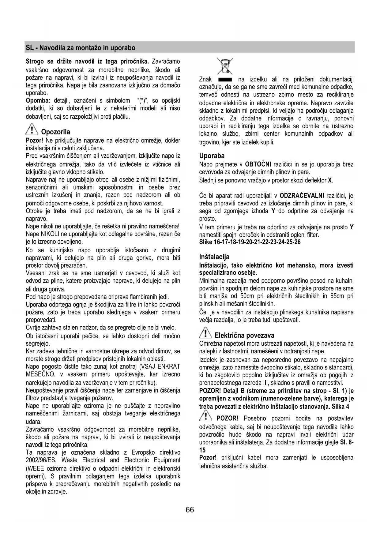 Neki modeli predviđaju i bočne lampe: Zamenite lampe onima koje imaju identični oblik od maks. 40W (E14). Pre nego što pristupite u udubinu gde se nalazi lampa uklonite gornji deo A. Ukoliko rasveta ne funkcioniše, kontrolišite da li ste pravilno postavili lampe na njihovo mesto pre nego što pozovete servisnu službu radi asistencije.66 SL - Navodila za montažo in uporabo Strogo se držite navodil iz tega priročnika. Zavračamo vsakršno odgovornost za morebitne neprilike, škodo ali požare na napravi, ki bi izvirali iz neupoštevanja navodil iz tega priročnika. Napa je bila zasnovana izključno za domačo uporabo. Opomba: detajli, označeni s simbolom “(*)”, so opcijski dodatki, ki so dobavljeni le z nekaterimi modeli ali niso dobavljeni, saj so razpoložljivi proti plačilu. Opozorila Pozor! Ne priključujte naprave na električno omrežje, dokler inštalacija ni v celoti zaključena. Pred vsakršnim čiščenjem ali vzdrževanjem, izključite napo iz električnega omrežja, tako da vtič izvlečete iz vtičnice ali izključite glavno vklopno stikalo. Naprave naj ne uporabljajo otroci ali osebe z nižjimi fizičnimi, senzoričnimi ali umskimi sposobnostmi in osebe brez ustreznih izkušenj in znanja, razen pod nadzorom ali ob pomoči odgovorne osebe, ki poskrbi za njihovo varnost. Otroke je treba imeti pod nadzorom, da se ne bi igrali z napravo. Nape nikoli ne uporabljajte, če rešetka ni pravilno nameščena! Nape NIKOLI ne uporabljajte kot odlagalne površine, razen če je to izrecno dovoljeno. Ko se kuhinjsko napo uporablja istočasno z drugimi napravami, ki delujejo na plin ali druga goriva, mora biti prostor dovolj prezračen. Vsesani zrak se ne sme usmerjati v cevovod, ki služi kot odvod za pline, katere proizvajajo naprave, ki delujejo na plin ali druga goriva. Pod napo je strogo prepovedana priprava flambiranih jedi. Uporaba odprtega ognja je škodljiva za filtre in lahko povzroči požare, zato je treba uporabo slednjega v vsakem primeru prepovedati. Cvrtje zahteva stalen nadzor, da se pregreto olje ne bi vnelo. Ob istočasni uporabi pečice, se lahko dostopni deli močno segrejejo. Kar zadeva tehnične in varnostne ukrepe za odvod dimov, se morate strogo držati predpisov pristojnih lokalnih oblasti. Napo pogosto čistite tako zunaj kot znotraj (VSAJ ENKRAT MESEČNO, v vsakem primeru upoštevajte, kar izrecno narekujejo navodila za vzdrževanje v tem priročniku). Neupoštevanje pravil čiščenja nape ter zamenjave in čiščenja filtrov predstavlja tveganje požarov. Nape ne uporabljajte oziroma je ne puščajte z nepravilno nameščenimi žarnicami, saj obstaja tveganje elektri čnega udara. Zavračamo vsakršno odgovornost za morebitne neprilike, škodo ali požare na napravi, ki bi izvirali iz neupoštevanja navodil iz tega priročnika. Ta naprava je označena skladno z Evropsko direktivo 2002/96/ES, Waste Electrical and Electronic Equipment (WEEE oziroma direktivo o odpadni električni in elektronski opremi). S pravilnim odlaganjem tega izdelka uporabnik prispeva k preprečevanju morebitnih negativnih posledic na okolje in zdravje. Znak na izdelku ali na priloženi dokumentaciji označuje, da se ga ne sme zavreči med komunalne odpadke, temveč odnesti na ustrezno zbirno mesto za recikliranje odpadne električne in elektronske opreme. Napravo zavrzite skladno z lokalnimi predpisi, ki veljajo na področju odlaganja odpadkov. Za dodatne informacije o ravnanju, ponovni uporabi in recikliranju tega izdelka se obrnite na ustrezno lokalno službo, zbirni center komunalnih odpadkov ali trgovino, kjer ste izdelek kupili. Uporaba Napo prejmete v OBTOČNI različici in se jo uporablja brez cevovoda za odvajanje dimnih plinov in pare. Slednji se ponovno vračajo v prostor skozi deflektor X. Če bi aparat radi uporabljali v ODZRAČEVALNI različici, je treba pripraviti cevovod za izločanje dimnih plinov in pare, ki sega od zgornjega izhoda Y do odprtine za odvajanje na prosto. V tem primeru je treba na odprtino za odvajanje na prosto Y namestiti spojni obroček in odstraniti ogleni filter. Slike 16-17-18-19-20-21-22-23-24-25-26 Inštalacija Inštalacijo, tako električno kot mehansko, mora izvesti specializirano osebje. Minimalna razdalja med podporno površino posod na kuhalni površini in spodnjim delom nape za kuhinjske prostore ne sme biti manjša od 50cm pri električnih štedilnikih in 65cm pri plinskih ali mešanih štedilnikih. Če je v navodilih za instalacijo plinskega kuhalnika napisana večja razdalja, jo je treba tudi upoštevati. Električna povezava Omrežna napetost mora ustrezati napetosti, ki je navedena na nalepki z lastnostmi, namešèeni v notranjosti nape. Izdelek je zasnovan za neposredno povezavo na napajalno omrežje, zato namestite dvopolno stikalo, skladno s standardi, ki bo zagotovilo popolno izključitev iz omrežja ob pogojih iz prenapetostnega razreda III, skladno s pravili o namestitvi. POZOR! Detajl B (streme za pritrditev na strop - Sl. 1) je opremljen z vodnikom (rumeno-zelene barve), katerega je treba povezati z električno inštalacijo stanovanja. Slika 4 POZOR! Posebno pozorni bodite na postavitev odvečnega kabla, saj bi neupoštevanje tega navodila lahko povzročilo hudo škodo na napravi in/ali električni udar uporabnika ali inštalaterja. Za dodatne informacije glejte Sl. 8-