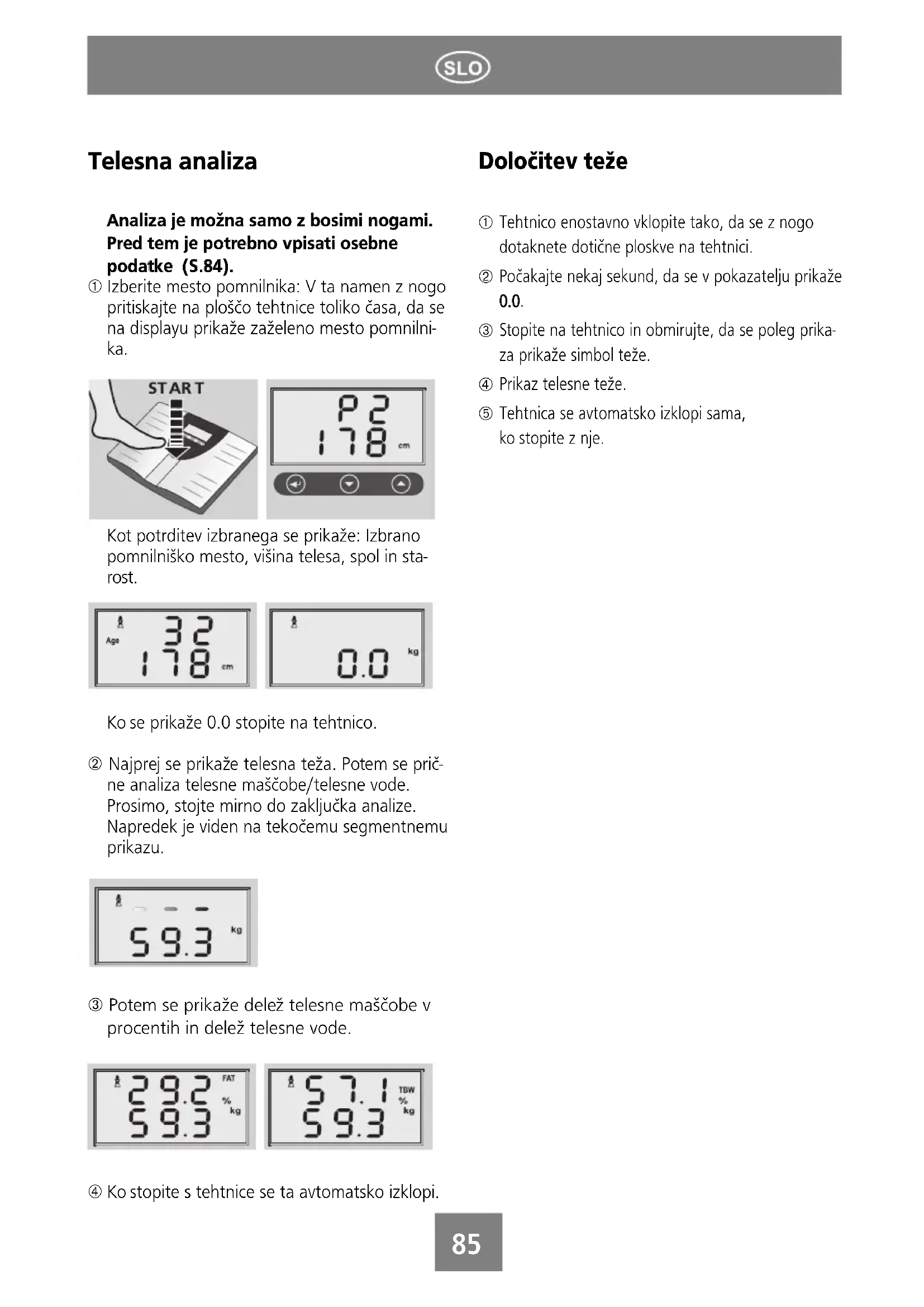② Najprej se prikaze telesna teza. Potem se pri- ne analiza telesne mascobe/telesne vode. Prosimo, stojte mirno do zakljucka analyze. Napredek je viden na tekocemu segmentnemu prikazu.