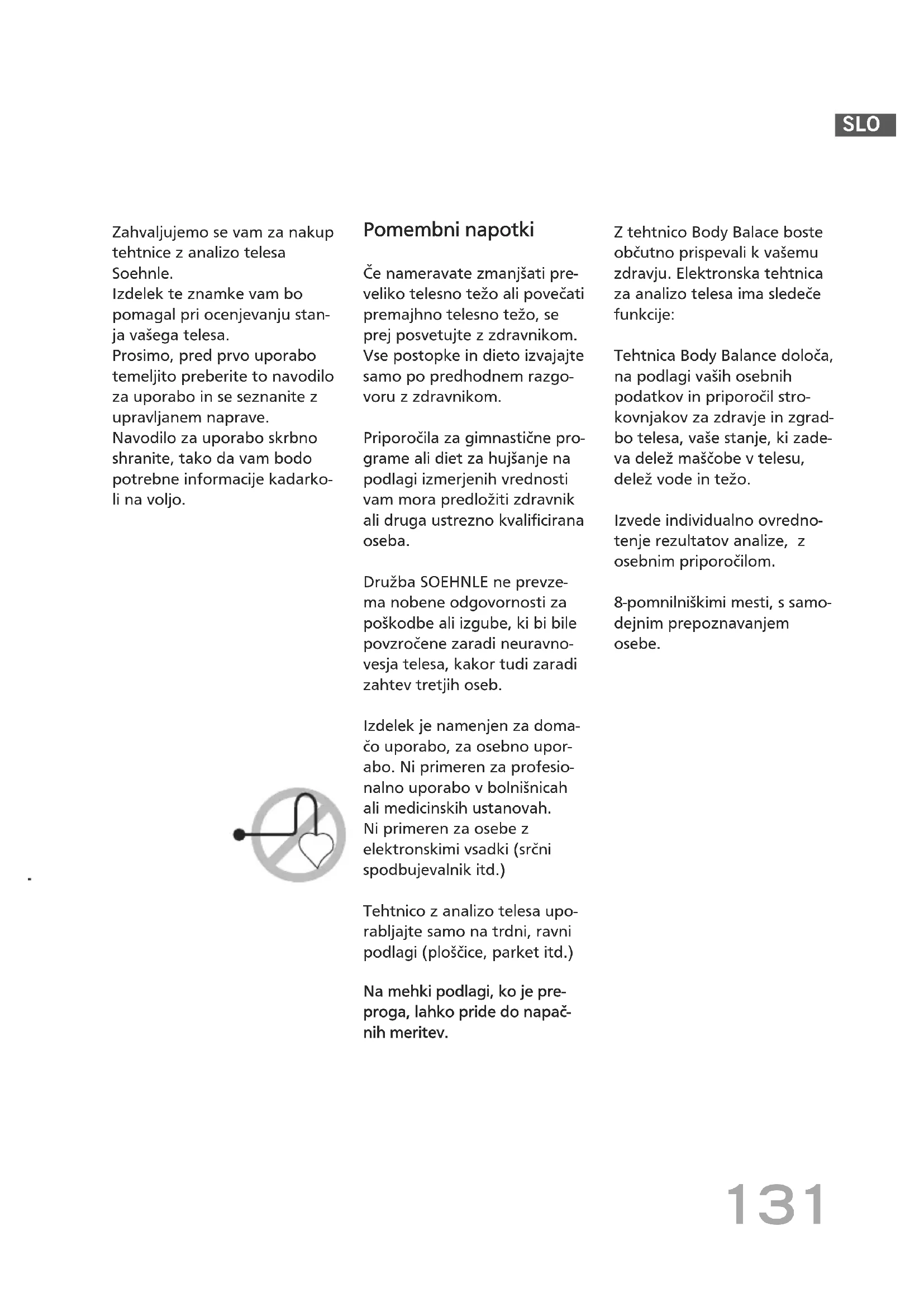 Družba SOEHNLE ne prevzema nobene odgovornosti za poskodbe ali izgube, ki bi bile povzročene zaradi neuravnovesja telesa, kakor tudi zaradi zahtev tretjih oseb.