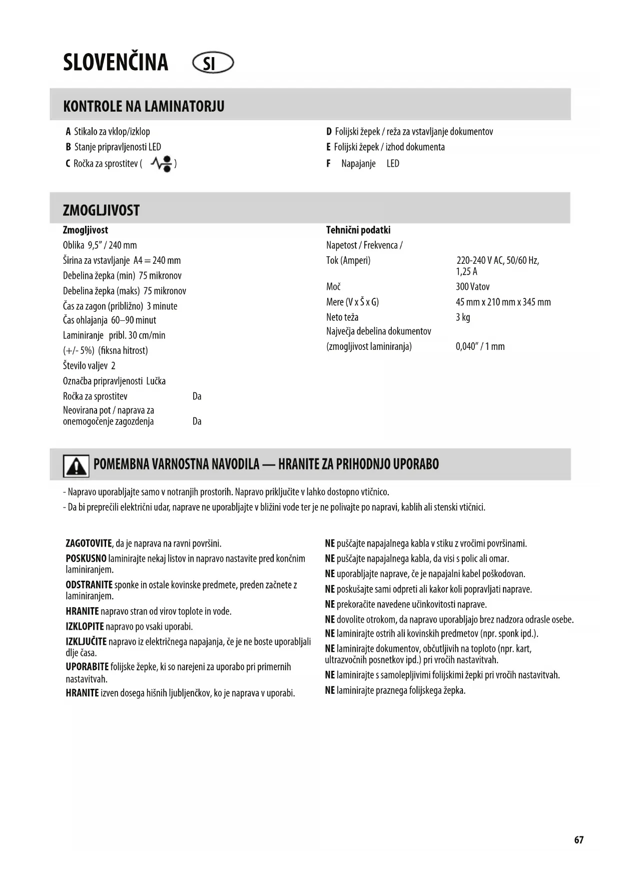 D Folijski žepek / reža za vstavljanje dokumentov E Folijski žepek / izhod dokumenta F Napajanje LED ZMOGLJIVOST Zmogljivost Oblika 9,5” / 240 mm Širina za vstavljanje A4 = 240 mm Debelina žepka (min) 75 mikronov Debelina žepka (maks) 75 mikronov Čas za zagon (približno) 3 minute Čas ohlajanja 60–90 minut Laminiranje pribl. 30 cm/min (+/- 5%) (ksna hitrost) Število valjev 2 Označba pripravljenosti Lučka Ročka za sprostitev Da Neovirana pot / naprava za onemogočenje zagozdenja Da Tehnični podatki Napetost / Frekvenca / Tok (Amperi) 220-240 V AC, 50/60 Hz, 1,25 A Moč 300 Vatov Mere (V x Š x G) 45 mm x 210 mm x 345 mm Neto teža 3 kg Največja debelina dokumentov (zmogljivost laminiranja) 0,040” / 1 mm - Napravo uporabljajte samo v notranjih prostorih. Napravo priključite v lahko dostopno vtičnico. - Da bi preprečili električni udar, naprave ne uporabljajte v bližini vode ter je ne polivajte po napravi, kablih ali stenski vtičnici. ZAGOTOVITE, da je naprava na ravni površini. POSKUSNO laminirajte nekaj listov in napravo nastavite pred končnim laminiranjem. ODSTRANITE sponke in ostale kovinske predmete, preden začnete z laminiranjem. HRANITE napravo stran od virov toplote in vode. IZKLOPITE napravo po vsaki uporabi. IZKLJUČITE napravo iz električnega napajanja, če je ne boste uporabljali dlje časa. UPORABITE folijske žepke, ki so narejeni za uporabo pri primernih nastavitvah. HRANITE izven dosega hišnih ljubljenčkov, ko je naprava v uporabi. NE puščajte napajalnega kabla v stiku z vročimi površinami. NE puščajte napajalnega kabla, da visi s polic ali omar. NE uporabljajte naprave, če je napajalni kabel poškodovan. NE poskušajte sami odpreti ali kakor koli popravljati naprave. NE prekoračite navedene učinkovitosti naprave. NE dovolite otrokom, da napravo uporabljajo brez nadzora odrasle osebe. NE laminirajte ostrih ali kovinskih predmetov (npr. sponk ipd.). NE laminirajte dokumentov, občutljivih na toploto (npr. kart, ultrazvočnih posnetkov ipd.) pri vročih nastavitvah. NE laminirajte s samolepljivimi folijskimi žepki pri vročih nastavitvah. NE laminirajte praznega folijskega žepka. SLOVENČINA