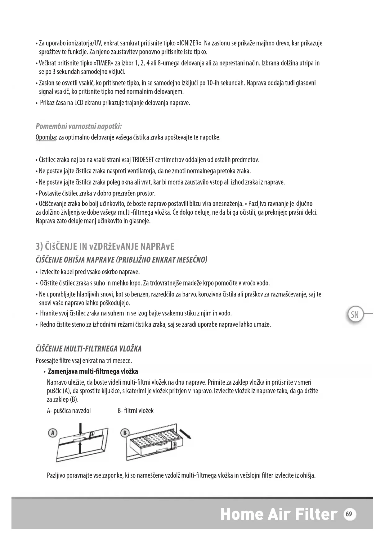 - Zamenjava multi-filtrnega vložka Napravo uležite, da boste videli multi-filtrni vložek na dnu naprave. Primite za zaklep vložka in pritisnite v smeri puščic (A), da sprostite kljukice, s katerimi je vložek pritrjen v napravo. Izvlecite vložek iz naprave tako, da ga držite za zaklep (B). A- puščica navzdol B- filtrni vložek A B Pazljivo poravnajte vse zaponke, ki so nameščene vzdolž multi-filtrnega vložka in večslojni filter izvlecite iz ohišja. Home Air Filter 69SN C- sponke