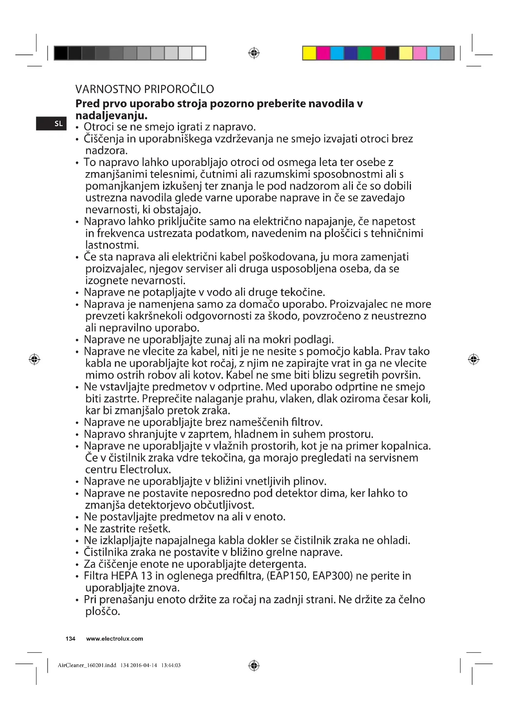 - Naprave ne uporabljajte v vlažnih prostorih, kot je na primer kopalnica. Če v čistilnik zraka vdre tekočina, ga morajo pregledati na servisnem centru Electrolux.