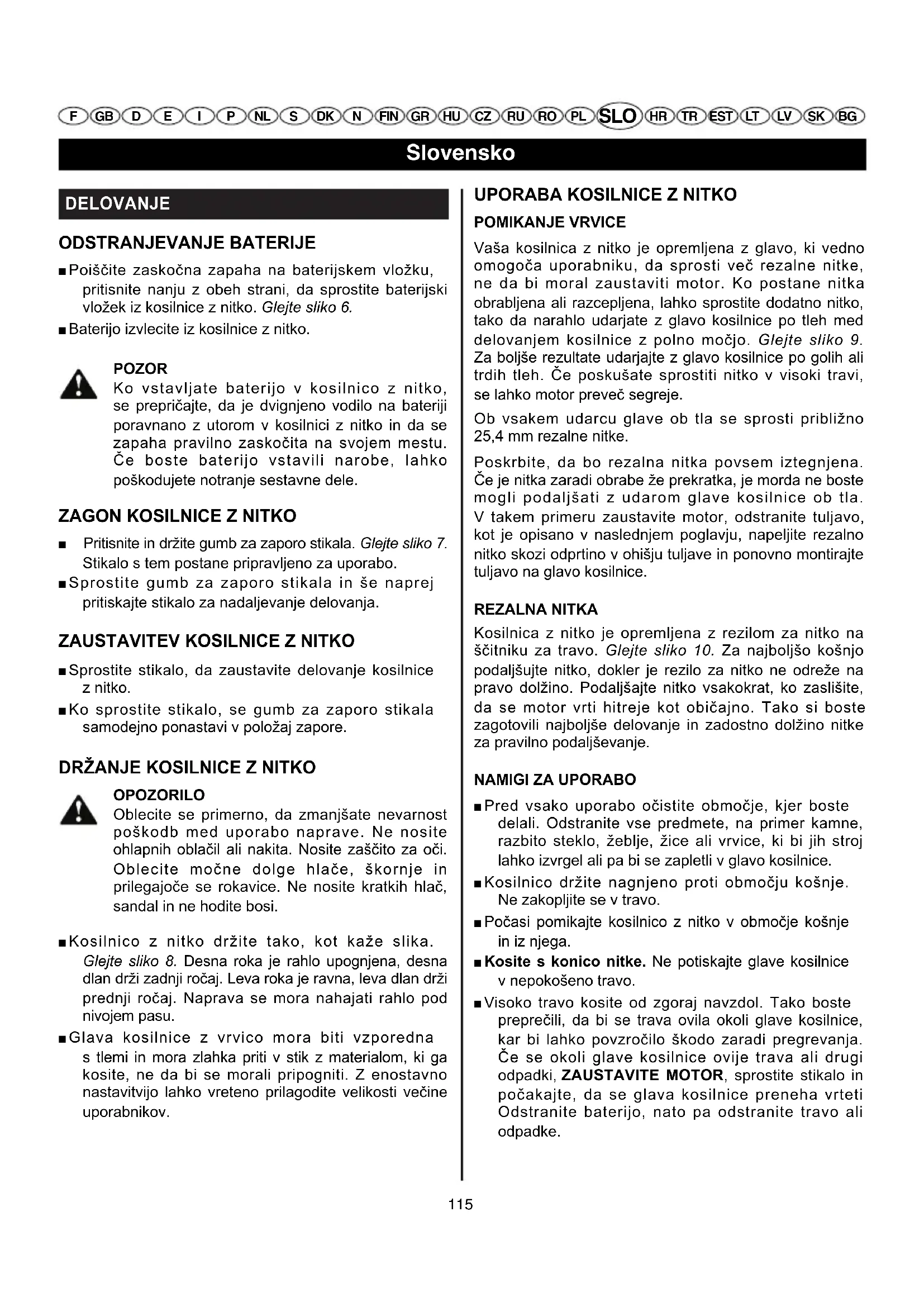 ■ Kosilnice z nitko ne preobremenjujte. Če jo boste uporabljali s predvideno hitrostjo, bo delovala bolje pa tudi nevarnost poskodb bo manjsa.
