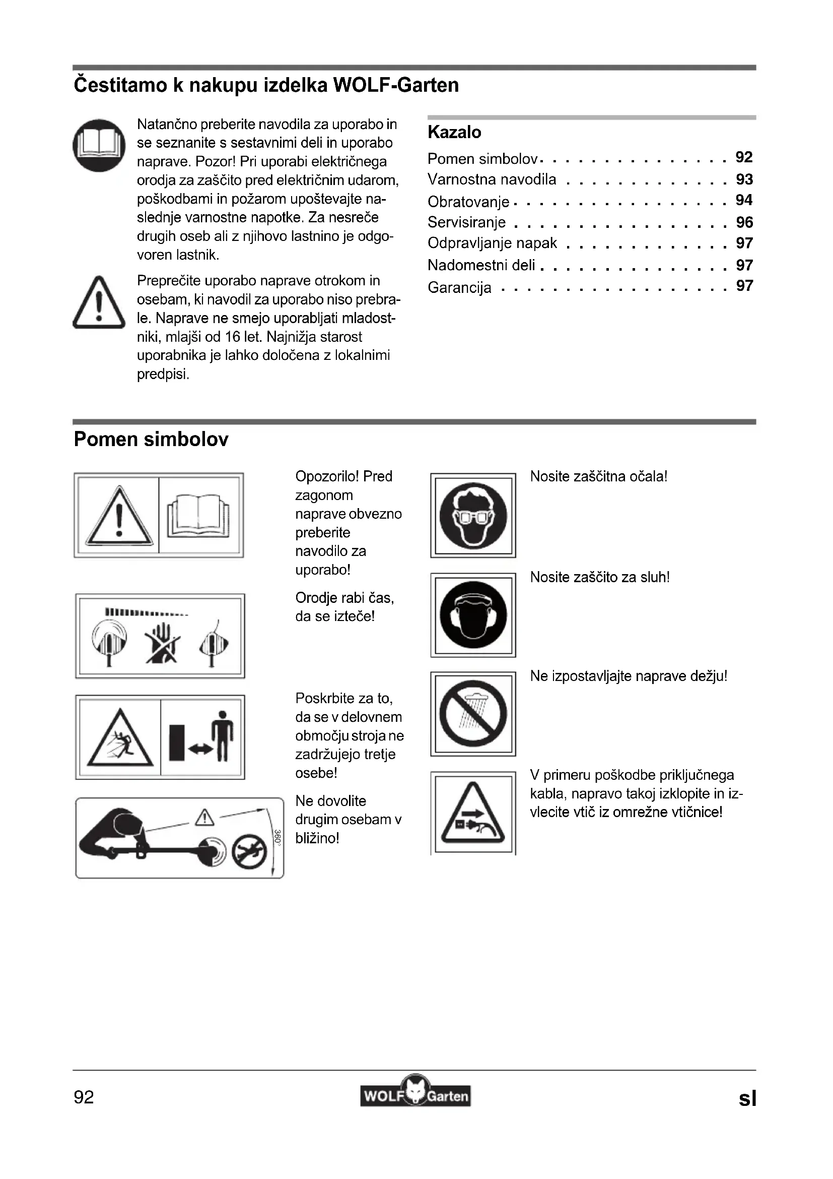 Pomen simbolov 360°Natančno preberite navodila za uporabo in se seznanite s sestavnimi deli in uporabo naprave. Pozor! Pri uporabi električnega orodja za zaščito pred električnim udarom, poškodbami in požarom upoštevajte na-slednje varnostne napotke. Za nesreče drugih oseb ali z njihovo lastnino je odgo-voren lastnik.Preprečite uporabo naprave otrokom in osebam, ki navodil za uporabo niso prebra-le. Naprave ne smejo uporabljati mladost-niki, mlajši od 16 let. Najnižja starost uporabnika je lahko določena z lokalnimi predpisi.Opozorilo! Pred zagonom naprave obvezno preberite navodilo za uporabo!Orodje rabi čas, da se izteče!Poskrbite za to, da se v delovnem območju stroja ne zadržujejo tretje osebe!Ne dovolite drugim osebam v bližino! Nosite zaščitna očala! Nosite zaščito za sluh!Ne izpostavljajte naprave dežju!V primeru poškodbe priključnega kabla, napravo takoj izklopite in iz- vlecite vtič iz omrežne vtičnice! Izvirno navodilo za obratovanje - sl93