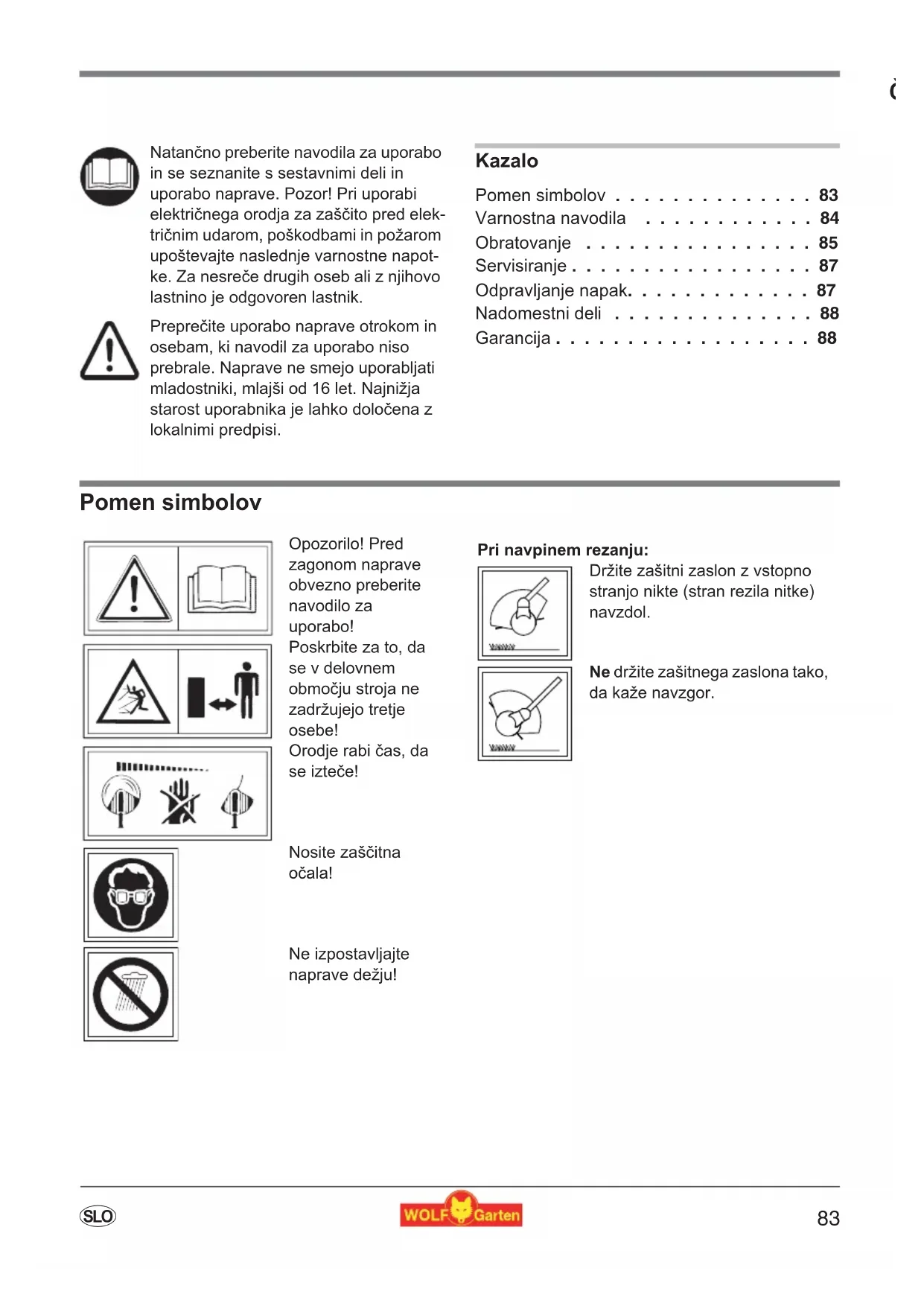 Vzdrzevalna dela in ciscenje naprave, kot tudisnemanje zašcitne opreme ali zamenjavakasete z nitko, se sme izvajati le, ko je motorizklopljen in rezilno orodje miruje in le, ko je vtič izvlečen iz vtičnice. Uporabljaje leoriginalne kasete z nitko WOLF in upostevejtenavodila za vgradnjoo! - Trimer se ne sme Čistiti s tekoco vodo, zlasti ne z vodo pod visokim pritiskom.