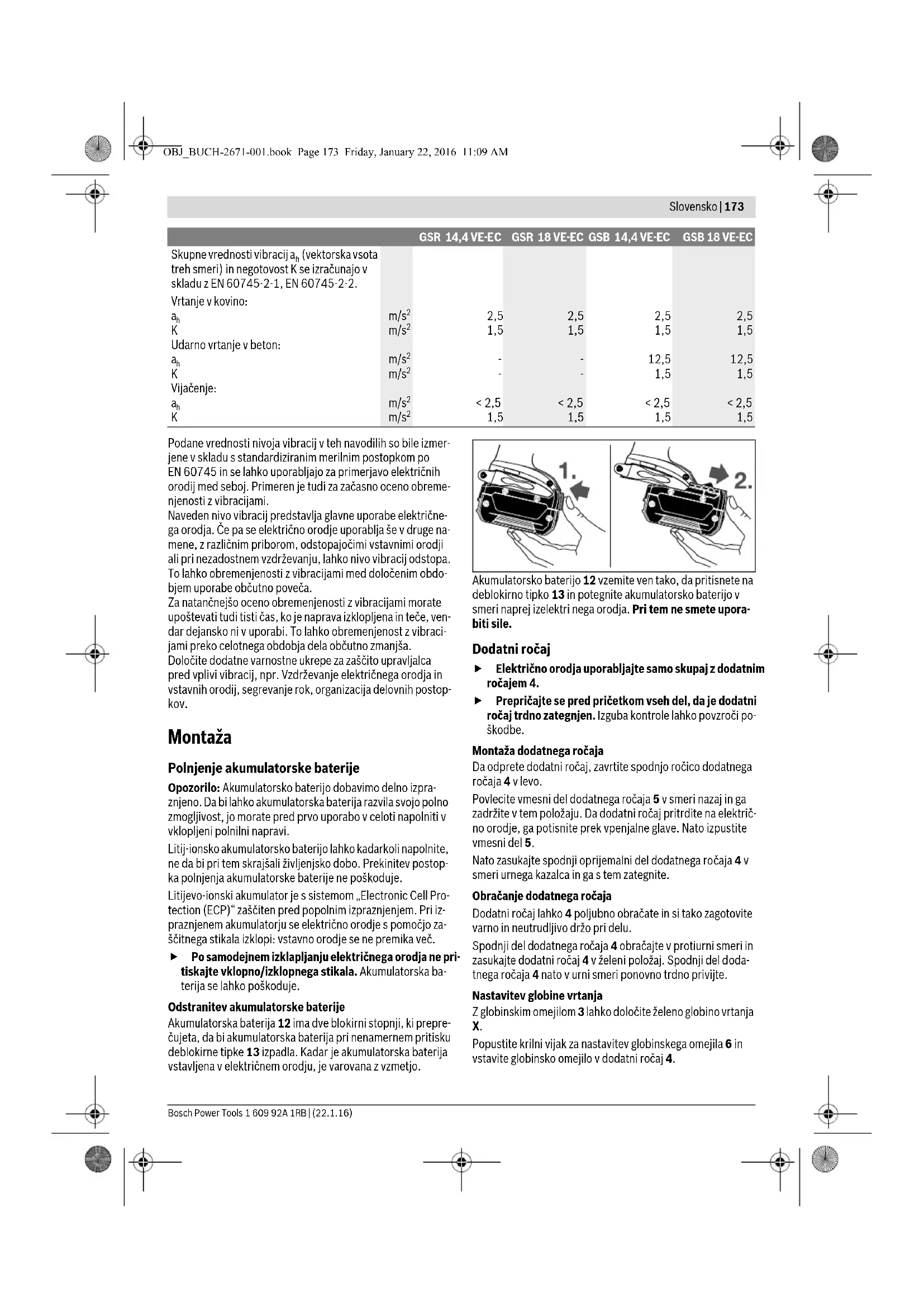 *odvisno od uporabljene akumulatorske baterije ** omejena zmogljivost pri temperaturah <0 °C OBJ_BUCH-2671-001.book Page 172 Friday, January 22, 2016 11:09 AMSlovensko | 173 Bosch Power Tools 1 609 92A 1RB | (22.1.16) Podane vrednosti nivoja vibracij v teh navodilih so bile izmer- jene v skladu s standardiziranim merilnim postopkom po EN 60745 in se lahko uporabljajo za primerjavo električnih orodij med seboj. Primeren je tudi za začasno oceno obreme- njenosti z vibracijami. Naveden nivo vibracij predstavlja glavne uporabe električne- ga orodja. Če pa se električno orodje uporablja še v druge na- mene, z različnim priborom, odstopajočimi vstavnimi orodji ali pri nezadostnem vzdrževanju, lahko nivo vibracij odstopa. To lahko obremenjenosti z vibracijami med določenim obdo- bjem uporabe občutno poveča. Za natančnejšo oceno obremenjenosti z vibracijami morate upoštevati tudi tisti čas, ko je naprava izklopljena in teče, ven- dar dejansko ni v uporabi. To lahko obremenjenost z vibraci- jami preko celotnega obdobja dela občutno zmanjša. Določite dodatne varnostne ukrepe za zaščito upravljalca pred vplivi vibracij, npr. Vzdrževanje električnega orodja in vstavnih orodij, segrevanje rok, organizacija delovnih postop- kov. Montaža Polnjenje akumulatorske baterije Opozorilo: Akumulatorsko baterijo dobavimo delno izpra- znjeno. Da bi lahko akumulatorska baterija razvila svojo polno zmogljivost, jo morate pred prvo uporabo v celoti napolniti v vklopljeni polnilni napravi. Litij-ionsko akumulatorsko baterijo lahko kadarkoli napolnite, ne da bi pri tem skrajšali življenjsko dobo. Prekinitev postop- ka polnjenja akumulatorske baterije ne poškoduje. Litijevo-ionski akumulator je s sistemom „Electronic Cell Pro- tection (ECP)“ zaščiten pred popolnim izpraznjenjem. Pri iz- praznjenem akumulatorju se električno orodje s pomočjo za- ščitnega stikala izklopi: vstavno orodje se ne premika več. Po samodejnem izklapljanju električnega orodja ne pri- tiskajte vklopno/izklopnega stikala. Akumulatorska ba- terija se lahko poškoduje. Odstranitev akumulatorske baterije Akumulatorska baterija 12 ima dve blokirni stopnji, ki prepre- čujeta, da bi akumulatorska baterija pri nenamernem pritisku deblokirne tipke 13 izpadla. Kadar je akumulatorska baterija vstavljena v električnem orodju, je varovana z vzmetjo. Akumulatorsko baterijo 12 vzemite ven tako, da pritisnete na deblokirno tipko 13 in potegnite akumulatorsko baterijo v smeri naprej izelektri nega orodja. Pri tem ne smete upora- biti sile. Dodatni ročaj Električno orodja uporabljajte samo skupaj z dodatnim ročajem 4. Prepričajte se pred pričetkom vseh del, da je dodatni ročaj trdno zategnjen. Izguba kontrole lahko povzroči po- škodbe. Montaža dodatnega ročaja Da odprete dodatni ročaj, zavrtite spodnjo ročico dodatnega ročaja 4 v levo. Povlecite vmesni del dodatnega ročaja 5 v smeri nazaj in ga zadržite v tem položaju. Da dodatni ročaj pritrdite na električ- no orodje, ga potisnite prek vpenjalne glave. Nato izpustite vmesni del 5. Nato zasukajte spodnji oprijemalni del dodatnega ročaja 4 v smeri urnega kazalca in ga s tem zategnite. Obračanje dodatnega ročaja Dodatni ročaj lahko 4 poljubno obračate in si tako zagotovite varno in neutrudljivo držo pri delu. Spodnji del dodatnega ročaja 4 obračajte v protiurni smeri in zasukajte dodatni ročaj 4 v želeni položaj. Spodnji del doda- tnega ročaja 4 nato v urni smeri ponovno trdno privijte. Nastavitev globine vrtanja Z globinskim omejilom 3 lahko določite želeno globino vrtanja