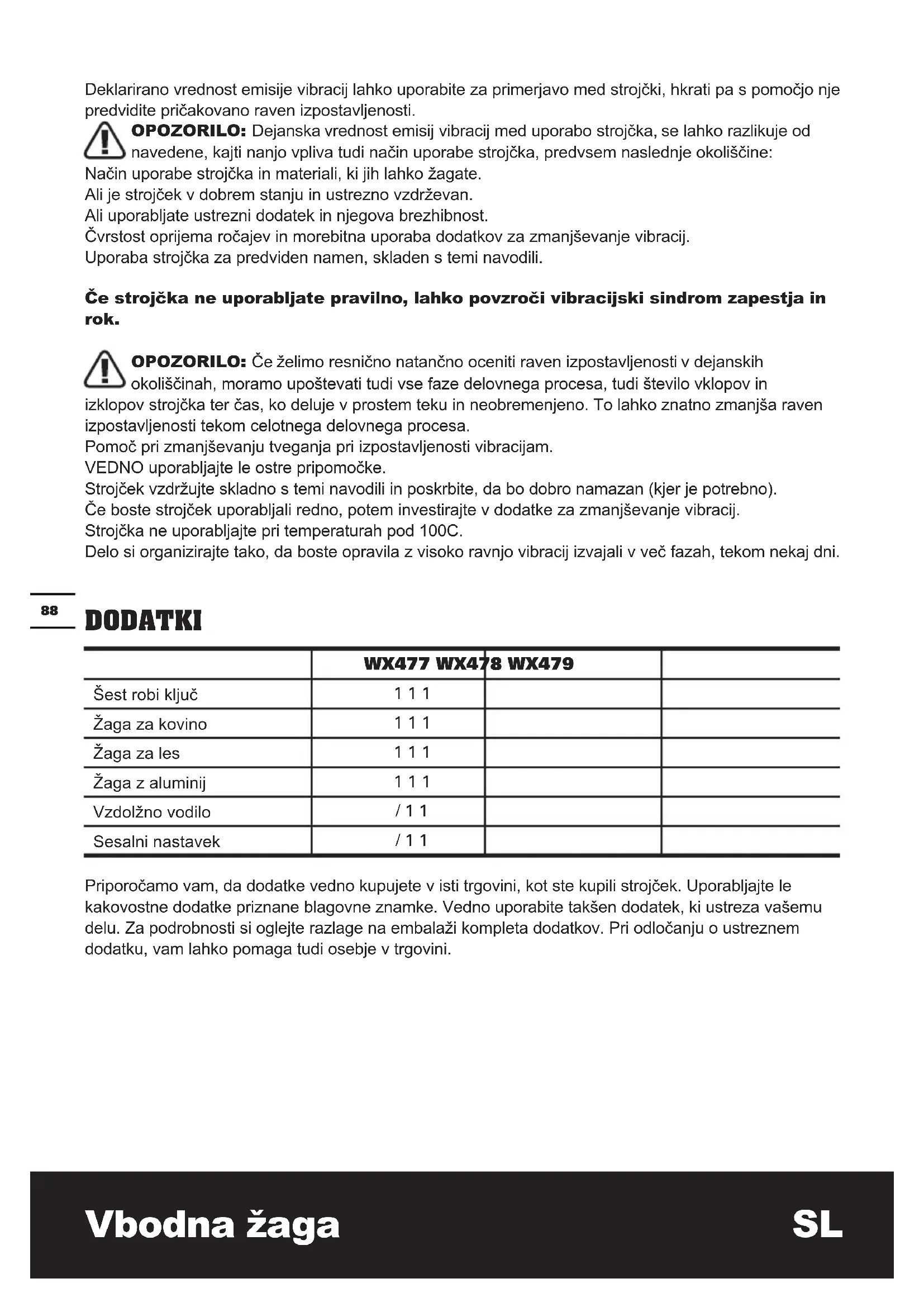Deklarirano vrednost emisije vibracij lahko uporabite za primerjavo med strojčki, hkrati pa s pomočjo nje predvidite pričakovano raven izpostavljenosti. OPOZORILO: Dejanska vrednost emisij vibracij med uporabo strojčka, se lahko razlikuje od navedene, kajti nanjo vpliva tudi način uporabe strojčka, predvsem naslednje okoliščine: Način uporabe strojčka in materiali, ki jih lahko žagate. Ali je strojček v dobrem stanju in ustrezno vzdrževan. Ali uporabljate ustrezni dodatek in njegova brezhibnost. Čvrstost oprijema ročajev in morebitna uporaba dodatkov za zmanjševanje vibracij. Uporaba strojčka za predviden namen, skladen s temi navodili. Če strojčka ne uporabljate pravilno, lahko povzroči vibracijski sindrom zapestja in rok. OPOZORILO: Če želimo resnično natančno oceniti raven izpostavljenosti v dejanskih okoliščinah, moramo upoštevati tudi vse faze delovnega procesa, tudi število vklopov in izklopov strojčka ter čas, ko deluje v prostem teku in neobremenjeno. To lahko znatno zmanjša raven izpostavljenosti tekom celotnega delovnega procesa. Pomoč pri zmanjševanju tveganja pri izpostavljenosti vibracijam. VEDNO uporabljajte le ostre pripomočke. Strojček vzdržujte skladno s temi navodili in poskrbite, da bo dobro namazan (kjer je potrebno). Če boste strojček uporabljali redno, potem investirajte v dodatke za zmanjševanje vibracij. Strojčka ne uporabljajte pri temperaturah pod 100C. Delo si organizirajte tako, da boste opravila z visoko ravnjo vibracij izvajali v več fazah, tekom nekaj dni. DODATKI WX477 WX478 WX479 Šest robi ključ