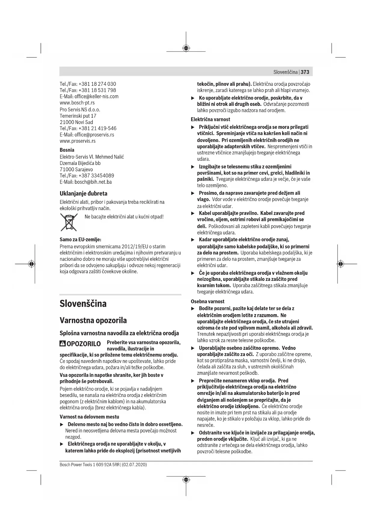 45°; 31,6°; 22,5°; 15° 15°; 22,5°; 31,6°; 45°; 60° – Če je nastavitveni čep (11) privit, ga odvijte. – Potegnite ročico (12) in rezalno mizo (38) vrtite, dokler ne dosežete želene leve ali desne zareze. – Nato ročico ponovno spustite. Ročica se mora občutno zaskočiti v zarezo. – Nastavitveni čep (11) ponovno privijte. Nastavitev poljubnih vodoravnih zajeralnih kotov (glejte sliko I) Vodoravni zajeralni kot je mogoče nastaviti v območju od 52° (levo) do 60° (desno). – Če je nastavitveni čep (11) privit, ga odvijte. – Povlecite za ročico (12) in sočasno pritiskajte na blokirno sponko (10), dokler se ta ne zaskoči v namenski utor. Zdaj lahko rezalno mizo prosto premikate. – Rezalno mizo (38) z nastavitvenim čepom zasukajte v levo ali desno, da se na kazalniku kota (58) prikaže želeni vodoravni zajeralni kot. – Nastavitveni čep (11) ponovno privijte. – Ročico (12) povlecite navzgor, da jo ponovno sprostite (za nastavitev vodoravnih standardnih zajeralnih kotov). Blokirna sponka (10) se vrne v prvotni položaj, ročica (12) pa se lahko ponovno zaskoči v zarezo (15). Nastavitev navpičnih zajeralnih kotov Navpični zajeralni kot je mogoče nastaviti v območju od 47° (levo) do 47° (desno). Za hitro in natančno nastavitev navpičnih zajeralnih kotov, ki jih pogosto uporabljate, je orodje opremljeno s prisloni za kote 0°, 22,5°, 45° in 47°. Nastavitev levega navpičnega območja zajeralnega kota (45° do 0°) Bosch Power Tools 1 609 92A 5RR | (02.07.2020)382 | Slovenščina – Levo nastavljivo prislonsko letev(5) izvlecite do konca. – Sprostite vpenjalni ročaj(13). – Drsno roko(28) z ročajem(1) premikajte v levo, dokler kazalnik kota(33) ne kaže želenega navpičnega zajeralnega kota. – Zadržite drsno roko(28) v tem položaju in potem znova zategnite vpenjalni ročaj(13). Drsna roka mora biti s pomočjo vpenjalnega ročaja dobro vpeta pri vsakem poljubnem navpičnem zajeralnem kotu. Nastavitev desnega navpičnega območja zajeralnega kota (0° do 45°) (glejteslikoJ) – Desno nastavljivo prislonsko letev(5) izvlecite do konca. – Sprostite vpenjalni ročaj(13). – Nagnite drsno roko(28) na ročaju(1) iz položaja 0° nekoliko v levo in zavrtite vrtljivi gumb(39) tako, da se prikaže želeno navpično območje zajeralnega kota. – Drsno roko(28) z ročajem(1) premikajte v desno, dokler kazalnik kota(21) ne kaže želenega zajeralnega kota. – Zadržite drsno roko(28) v tem položaju in potem znova zategnite vpenjalni ročaj(13). Drsna roka mora biti s pomočjo vpenjalnega ročaja dobro vpeta pri vsakem poljubnem navpičnem zajeralnem kotu. Nastavitev navpičnega standardnega zajeralnega kota 0° Za ponovno nastavitev standardnega zajeralnega kota 0° se vrtljivi gumb (39) zaskoči v levem navpičnem območju zajeralnega kota. – Obrnite potezni mehanizem (28) z desne prek položaja 0°. Nastavitev celotnega navpičnega območja zajeralnega kota (–47° do +47°) – Povlecite nastavljivi prislonski letvi(5) popolnoma navzven. – Sprostite vpenjalni ročaj(13). – Nagnite drsno roko(28) na ročaju(1) iz položaja 0° nekoliko v levo in zavrtite vrtljivi gumb(39) tako, da se prikaže želeno navpično območje zajeralnega kota. – Z ročajem(28) drsno roko(1) obrnite v levo ali desno, da bo kazalnik kota(33) ali(21) kazal želeni navpični zajeralni kot. – Zadržite drsno roko(28) v tem položaju in potem znova zategnite vpenjalni ročaj(13). Drsna roka mora biti s pomočjo vpenjalnega ročaja dobro vpeta pri vsakem poljubnem navpičnem zajeralnem kotu. Nastavitev navpičnega standardnega zajeralnega kota 22,5° (glejte sliko K) Nastavitveni gumb (34) pomaknite do konca navzven in ga zavrtite za 90°. Nato premaknite potezni mehanizem (28) z ročajem (1), da se drsna roka slišno zaskoči. Uporaba Vklop (glejteslikoL) – Za vklop električnega orodja najprej potisnite zaklep vklopa(2) proti sredini, nato pa pritisnite na stikalo za vklop/izklop(59) in ga držite pritisnjenega. Opomba: iz varnostnih razlogov stikala za vklop/izklop (59) ni mogoče zapahniti, temveč ga je treba med uporabo orodja neprekinjeno držati pritisnjenega. Izklop – Za izklop spustite stikalo za vklop/izklop (59). Omejitev zagonskega toka Elektronska omejitev zagonskega toka omeji zmogljivost električnega orodja pri vklopu in omogoča delovanje z varovalko 16A. Opomba: če električno orodje takoj po vklopu deluje s polnim številom vrtljajev, potem omejitev zagonskega toka in zaščita pred ponovnim vklopom ne delujeta. Električno orodje je treba nemudoma poslati naši servisni službi, naslove lahko najdete v odstavku „Servisna služba in svetovanje glede uporabe“. Navodila za delo Splošna navodila za žaganje Označevanje linije rezanja (glejte sliko M) Dva laserska žarka prikazujeta širino reza žaginega lista. Na ta način lahko natančno namestite obdelovanec za žaganje, ne da bi morali pri tem odpreti nihajni zaščitni pokrov. – S stikalom (60) vklopite laserske žarke. – Naravnajte oznako na obdelovancu vzdolž obeh linij. Opomba: pred žaganjem preverite, ali je širina rezanja še vedno pravilno označena Nastavitev laserja. Laserski žarki se lahko prestavijo npr. zaradi vibracij pri intenzivni uporabi. Položaj uporabnika (glejte sliko N) u Ne smete se postaviti pred električno orodje v linijo žaginega lista, temveč vedno le zamaknjeno ob strani žaginega lista. Tako telo zaščitite pred morebitnim povratnim udarcem. – Dlani, prstov in rok ne približujte vrtečemu se žaginemu listu. – Pred potezni mehanizem ne postavljajte rok (28). Menjava vložnih plošč (glejte sliko O) Rdeče vložne plošče (9) se lahko pri daljši uporabi električnega orodja obrabijo. Okvarjene vložne plošče zamenjajte. – Električno orodje namestite v delovni položaj. – Odvijte vijake (61) z notranjim šestrobim ključem (4 mm) (17) in odstranite stare vložne plošče. 1 609 92A 5RR | (02.07.2020) Bosch Power ToolsSlove