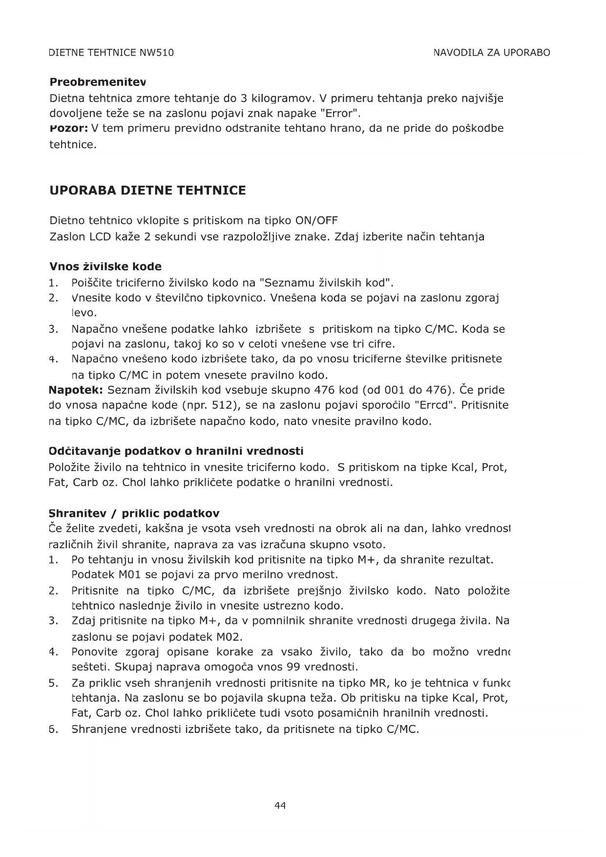 UVOD Prisrčna hvala, da ste se odločili za nakup dietne tehtnice NW510. Naprava ima številne funkcije, ravnanje z njo pa je enostavno. Po vnosu živilske kode lahko vse podatke o kalorijah, beljakovinah, ogljikovih hidratih, holesterolu, ki jih vsebuje določeno živilo, preberete na zaslonu in shranite v spomin. Vrednosti živil posameznega obroka lahko seštejete in prikličete. Tako imate pred očmi skupno vrednost enega obroka. Prosimo, pred uporabo skrbno preberite pričujoča navodila, da boste od svoje dietne tehtnice imeli čimveč koristi.