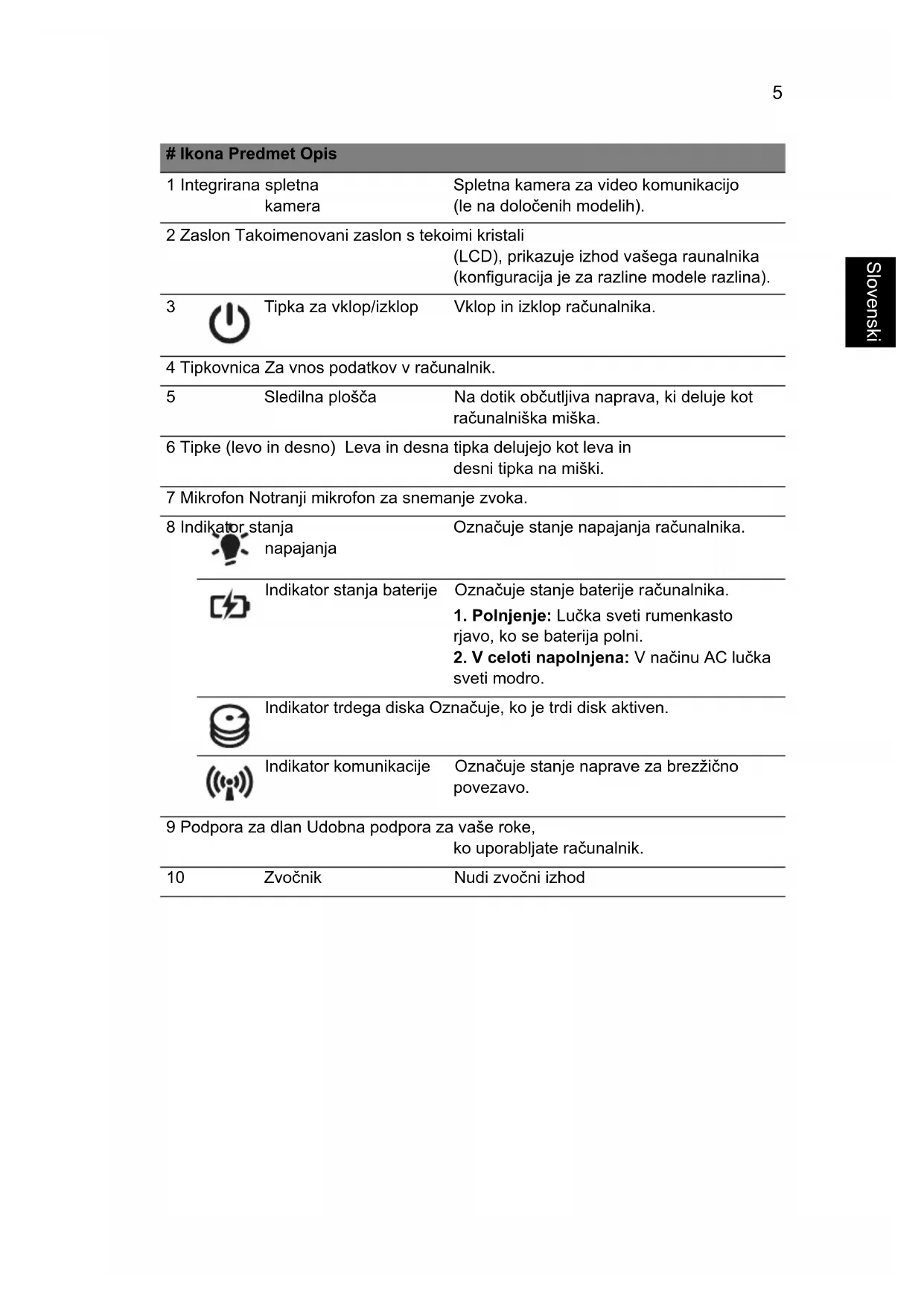 sveti modro. Indikator trdega diska Označuje, ko je trdi disk aktiven. Indikator komunikacije Označuje stanje naprave za brezžično povezavo. 9 Podpora za dlan Udobna podpora za vaše roke, ko uporabljate računalnik. 10 Zvočnik Nudi zvočni izhod6 Slovenski Vroče tipke Računalnik uporablja vroče tipke ali kombinacijo tipk za dostop do računalniških nastavitev kot sta svetlost zaslona in glasnost. Za aktiviranje vročih tipk pritisnite in držite tipko <Fn> preden pritisnete drugo tipko v kombinaciji. Vroča tipka Ikona Funkcija Opis <Fn> + <F3> Komunikacija Omogoči/onemogoči komunikacijske naprave računalnika. (Komunikacijske naprave se lahko razlikujejo po konfiguraciji.) <Fn> + <F4> Mirovanje Preklopi računalnik v stanje mirovanja. <Fn> + <F5> Preklop zaslona Preklopi izhod zaslona med zaslonom, zunanjim monitorjem (če je priključen) in obema. <Fn> + <F6> Izklop zaslona Izključi luč zaslona za varčevanje z energijo. Pritisnite poljubno tipko za vrnitev. <Fn> + <F7> Preklop sledilne plošče Vključi in izključi notranjo sledilno ploščo. <Fn> + <F8> Preklop zvočnikov Vklop in izklop zvočnikov. <Fn> + < > Poveča svetlost Poveča svetlost zaslona. <Fn> + < > Zmanjša svetlost Zmanjša svetlost zaslona. <Fn> + < > Povečanje glasnosti Poveča glasnost zvoka. <Fn> + < > Zmanjšanje glasnosti Zmanjša glasnost zvoka. <Fn> + <Home> Predvajaj/ Premor Predvaja ali zaustavi izbrano medijski datoteko. <Fn> + <Pg Up> Ustavi Zaustavi predvajanje izbrane medijske datoteke. <Fn> + <Pg Dn> Predhodni Vrnitev na predhodno medijsko datoteko. <Fn> + <End> Naslednji Skok na naslednjo medijsko datoteko.7 Slovenski Zaprt pogled od spredaj Pogled od zadaj # Ikona Predmet Opis 1Vtičnica za mikrofon Sprejema vhode iz zunanjih mikrofonov. Vtičnica za slušalke/ zvočnik/napravo Priključek za avdio naprave (npr. zvočniki, slušalke). 2 Čitalec kartic 2-v-1 Sprejema Secure Digital (SD) in MultiMediaCard (MMC). Opomba: Pritisnite, da bi odstranili/ vstavili kartico. Naenkrat lahko uporabljate le eno kartico. # Predmet Opis 1 Nosilec za baterijo Hrani baterijo računalnika.