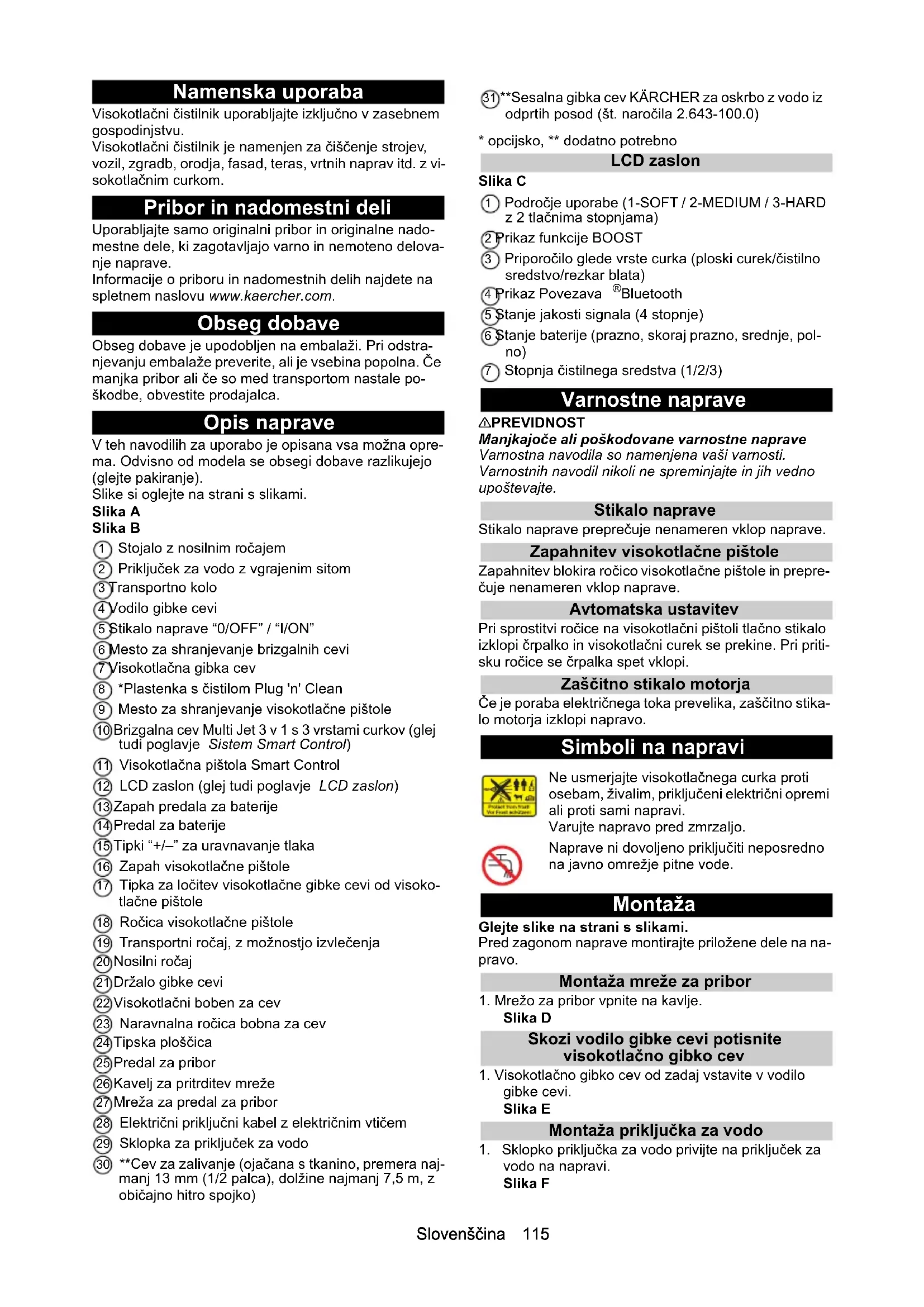 Bluetooth 5 Stanje jakosti signala (4 stopnje) 6 Stanje baterije (prazno, skoraj prazno, srednje, pol- no) 7 Stopnja čistilnega sredstva (1/2/3) Varnostne naprave 몇 PREVIDNOST Manjkajoče ali poškodovane varnostne naprave Varnostna navodila so namenjena vaši varnosti. Varnostnih navodil nikoli ne spreminjajte in jih vedno upoštevajte. Stikalo naprave Stikalo naprave preprečuje nenameren vklop naprave. Zapahnitev visokotlačne pištole Zapahnitev blokira ročico visokotlačne pištole in prepre- čuje nenameren vklop naprave. Avtomatska ustavitev Pri sprostitvi ročice na visokotlačni pištoli tlačno stikalo izklopi črpalko in visokotlačni curek se prekine. Pri priti- sku ročice se črpalka spet vklopi. Zaščitno stikalo motorja Če je poraba električnega toka prevelika, zaščitno stika- lo motorja izklopi napravo. Simboli na napravi Montaža Glejte slike na strani s slikami. Pred zagonom naprave montirajte priložene dele na na- pravo. Montaža mreže za pribor