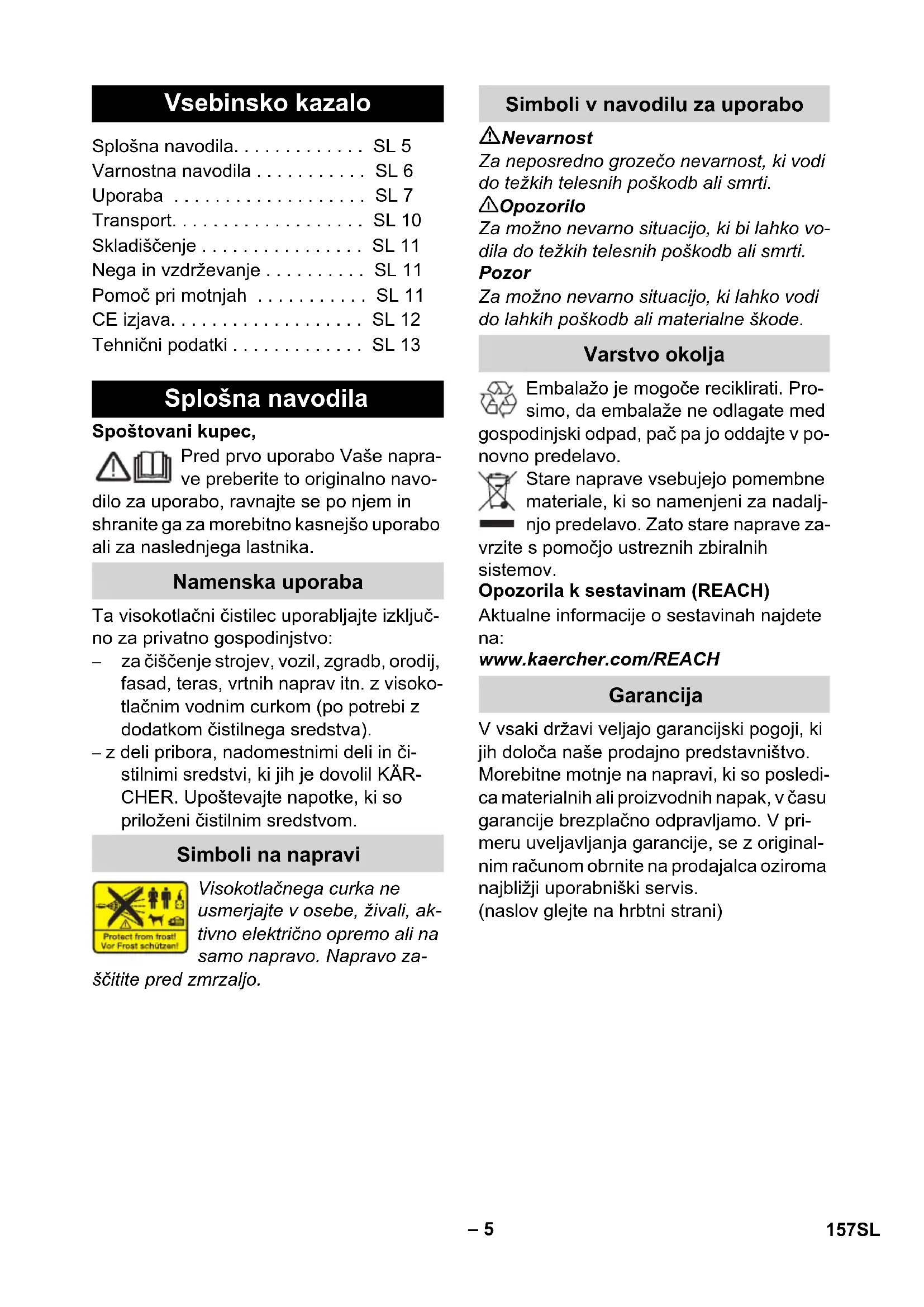 dB(A) 972 156 CSSlovenšina – 5 Spoštovani kupec, Pred prvo uporabo Vaše napra- ve preberite to originalno navo- dilo za uporabo, ravnajte se po njem in shranite ga za morebitno kasnejšo uporabo ali za naslednjega lastnika. Ta visokotlačni čistilec uporabljajte izključ- no za privatno gospodinjstvo: – za čiščenje strojev, vozil, zgradb, orodij, fasad, teras, vrtnih naprav itn. z visoko- tlačnim vodnim curkom (po potrebi z dodatkom čistilnega sredstva). – z deli pribora, nadomestnimi deli in či- stilnimi sredstvi, ki jih je dovolil KÄR- CHER. Upoštevajte napotke, ki so priloženi čistilnim sredstvom. Visokotlačnega curka ne usmerjajte v osebe, živali, ak- tivno električno opremo ali na samo napravo. Napravo za- ščitite pred zmrzaljo. Nevarnost Za neposredno grozečo nevarnost, ki vodi do težkih telesnih poškodb ali smrti. 몇 Opozorilo Za možno nevarno situacijo, ki bi lahko vo- dila do težkih telesnih poškodb ali smrti. Pozor Za možno nevarno situacijo, ki lahko vodi do lahkih poškodb ali materialne škode. Embalažo je mogoče reciklirati. Pro- simo, da embalaže ne odlagate med gospodinjski odpad, pač pa jo oddajte v po- novno predelavo. Stare naprave vsebujejo pomembne materiale, ki so namenjeni za nadalj- njo predelavo. Zato stare naprave za- vrzite s pomočjo ustreznih zbiralnih sistemov. Opozorila k sestavinam (REACH) Aktualne informacije o sestavinah najdete na: www.kaercher.com/REACH V vsaki državi veljajo garancijski pogoji, ki jih določa naše prodajno predstavništvo. Morebitne motnje na napravi, ki so posledi- ca materialnih ali proizvodnih napak, v času garancije brezplačno odpravljamo. V pri- meru uveljavljanja garancije, se z original- nim računom obrnite na prodajalca oziroma najbližji uporabniški servis. (naslov glejte na hrbtni strani) Vsebinsko kazalo Splošna navodila. . . . . . . . . . . . . SL 5 Varnostna navodila . . . . . . . . . . . SL 6 Uporaba . . . . . . . . . . . . . . . . . . . SL 7 Transport. . . . . . . . . . . . . . . . . . . SL 10 Skladiščenje . . . . . . . . . . . . . . . . SL 11 Nega in vzdrževanje . . . . . . . . . . SL 11 Pomoč pri motnjah . . . . . . . . . . . SL 11 CE izjava. . . . . . . . . . . . . . . . . . . SL 12 Tehnični podatki . . . . . . . . . . . . . SL 13 Splošna navodila Namenska uporaba Simboli na napravi Simboli v navodilu za uporabo Varstvo okolja Garancija 157SL– 6 Nevarnost Omrežnega vtiča in vtičnice nikoli ne prijemajte z mokrimi rokami. Naprave ne vklapljajte, če so poškodo- vani omrežni priključni vodnik ali drugi pomembni deli naprave, npr. visoko- tlačna gibka cev, ročna brizgalna pišto- la ali varnostne priprave. Pred vsako uporabo preverite, ali na omrežnem priključnem vodniku z omre- žnim vtičem obstajajo poškodbe. Po- škodovan omrežni priključni vodnik naj pooblaščeni uporabniški servis/elektro strokovnjak nemudoma zamenja. Pred vsakim zagonom preverite gibko visokotlačno cev na poškodbe. Poško- dovano visokotlačno gibko cev takoj za- menjajte. Prepovedano je obratovanje v podro- čjih, kjer obstaja nevarnost eksplozij. Pri uporabi naprave v nevarnih podro- čjih (npr. bencinske črpalke) je treba upoštevati ustrezne varnostne predpi- se. Visokotlačni curki so lahko pri nestro- kovni uporabi nevarni. Curka nikoli ne usmerjajte na osebe, živali, aktivno ele- ktrično opremo ali na sam stroj. Visokotlačnega curka ne usmerjajte na druge osebe ali nase, da bi očistili obla- čila ali obutev. S paro ne škropite predmetov, ki vsebu- jejo zdravstveno škodljive snovi (npr. azbest). Pnevmatike vozil/ventili pnevmatik se lahko z visokotlačnim curkom poškodu- jejo in počijo. Prvi znak tega je spre- memba barve pnevmatike. Poškodovanje avtomobilske pnevmati- ke/ventili pnevmatik so smrtno nevarni. Pri čiščenju ohranite najmanjšo odda- ljenost curka od 30 cm! Nevarnost eksplozije! Ne razpršujte gorljivih tekočin. Nikoli ne vsesavajte tekočin s topili ali nerazredčenih kislin in topil! Sem spa- dajo npr. bencin, razred čila ali kurilno olje. Razpršeno sredstvo je visoko vne- tljivo, eksplozivno in strupeno. Ne upo- rabljajte acetona, nerazredčenih kislin in topil, ker le-ti uničujejo materiale, uporabljene na napravi. 몇 Opozorilo Omrežni vtič in vezava uporabljenega podaljševalnega kabla morata biti vodo- tesna in ne smeta ležati v vodi. Neprimerni podaljševalni kabli so lahko nevarni. Na odprtem uporabljajte le za to dovoljene in ustrezno označene po- daljševalne kable z zadostnim prere- zom vodnikov:
